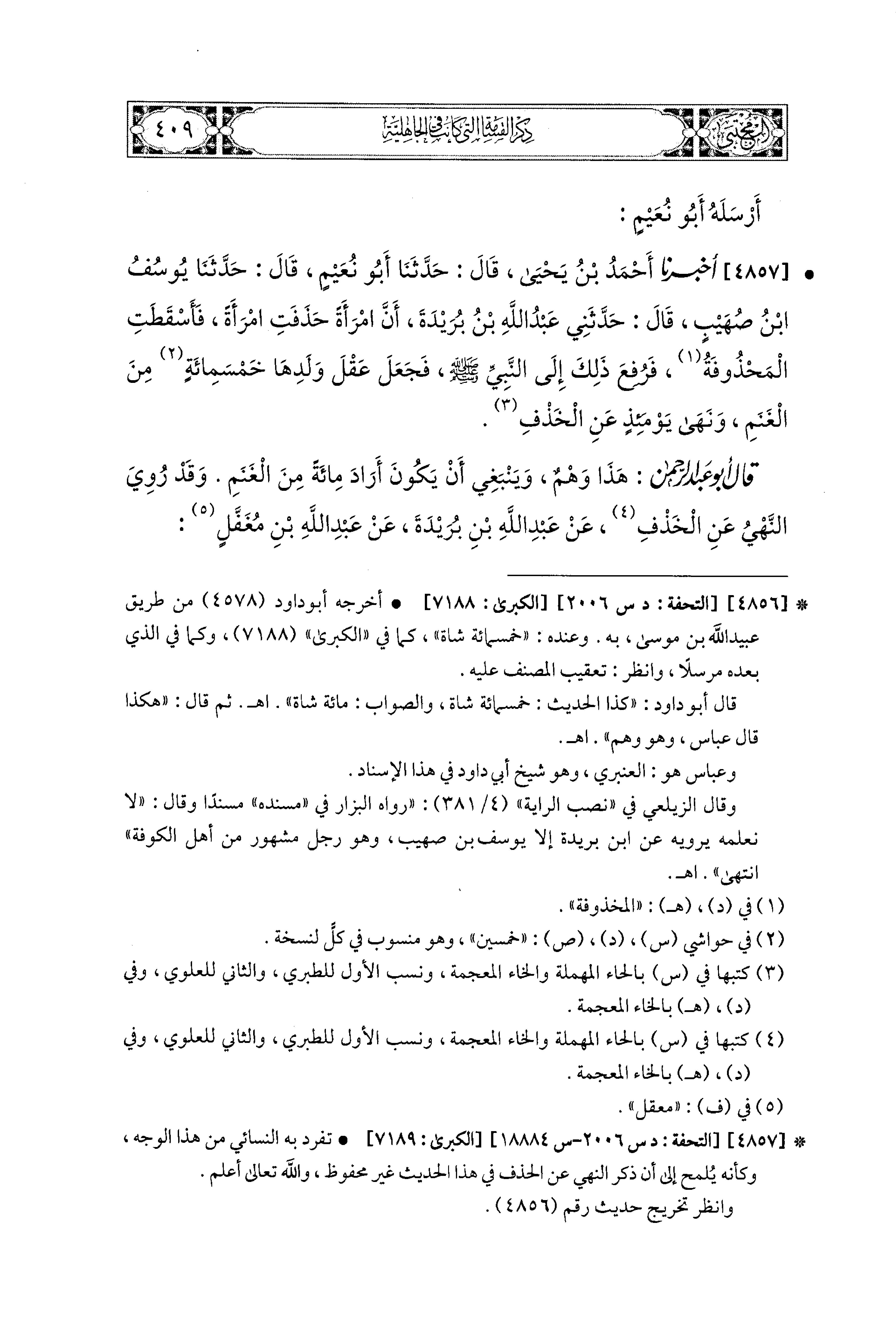 4857- أَخبَرَنا أَحْمَدُ بْنُ يَحيَى، قال: حَدثنا أَبو نَعِيمٍ، قال: حَدثنا يُوسُفُ بْنُ صُهَيْبٍ، قَالَ: حَدَّثَني عَبدُ اللهِ بْنُ بُرَيْدَةَ؛ أَنَّ امْرَأَةً حَذَفَتِ (1) امْرَأَةً، فَأَسْقَطَتِ المَخْذُوفَةُ (2)، فَرُفِعَ ذَلِكَ إِلَى النَّبيِّ صَلى الله عَليه وسَلم، فَجَعَلَ عَقْلَ وَلَدِهَا خَمْسَ مِئَةٍ مِنَ الغَنَمِ، وَنَهَى يَوْمَئِذٍ عَنِ الخَذْفِ.