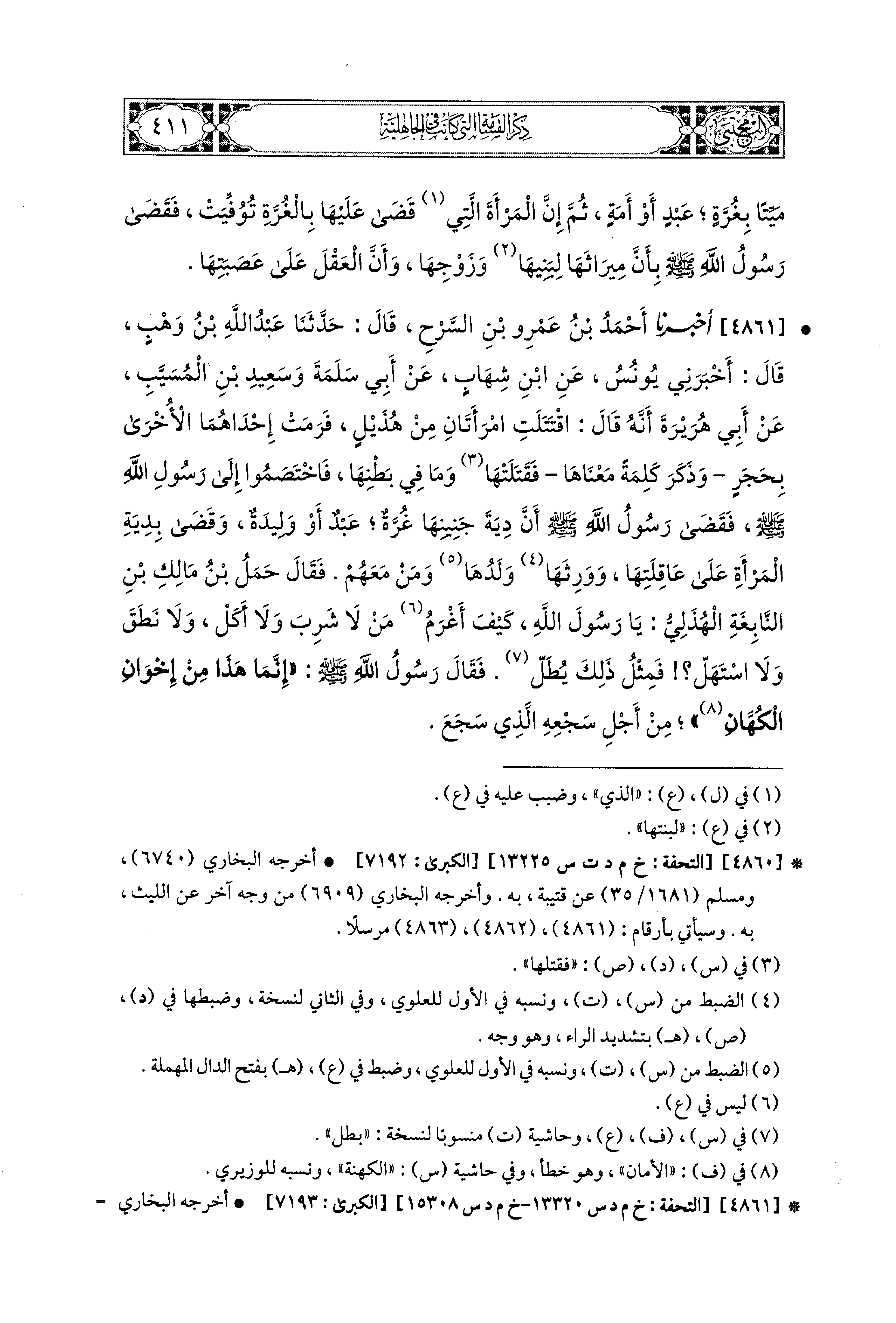 4861- أَخبَرَنا أَحْمَدُ بْنُ عَمْرِو بْنِ السَّرْحِ، قال: حَدثنا عَبدُ اللهِ بْنُ وَهْبٍ، قَالَ: أَخْبَرَني يُونُسُ، عَنِ ابنِ شِهَابٍ، عَن أَبِي سَلَمَةَ، وَسَعيدِ بْنِ المُسَيَّبِ، عَن أَبِي هُرَيرَةَ أَنَّهُ قَالَ: اقْتَتَلَتِ امْرَأَتَانِ مِنْ هُذَيْلٍ، فَرَمَتْ إِحْدَاهُمَا الأُخْرَى بِحَجَرٍ، وَذَكَرَ كَلِمَةً مَعْنَاهَا، فَقَتَلَتْهَا وَمَا فِي بَطْنِهَا، فَاخْتَصَمُوا إِلَى رَسُولِ اللهِ صَلى الله عَليه وسَلم، فَقَضَى رَسُولُ اللهِ صَلى الله عَليه وسَلم، أَنَّ دِيَةَ جَنينِهَا غُرَّةٌ عَبدٌ، أَوْ وَلِيدَةٌ، وَقَضَى بِدِيَةِ المَرْأَةِ عَلَى عَاقِلَتِهَا وَوَرَّثَهَا وَلَدَهَا وَمَنْ مَعَهُمْ، فَقَالَ حَمَلُ بْنُ مَالِكِ بْنِ النَّابِغَةِ الهُذَلِيُّ: يَا رَسُولَ اللهِ، كَيْفَ أُغَرَّمُ مَنْ لاَ شَرِبَ، وَلاَ أَكَلْ، وَلاَ نَطَقَ، وَلاَ اسْتَهَلَّ، فَمِثْلُ ذَلِكَ يُطَلّ؟ فَقَالَ رَسُولُ اللهِ صَلى الله عَليه وسَلم: إِنَّمَا هَذَا مِنْ إِخْوَانِ الكُهَّانِ مِنْ أَجْلِ سَجْعِهِ الَّذِي سَجَعَ.