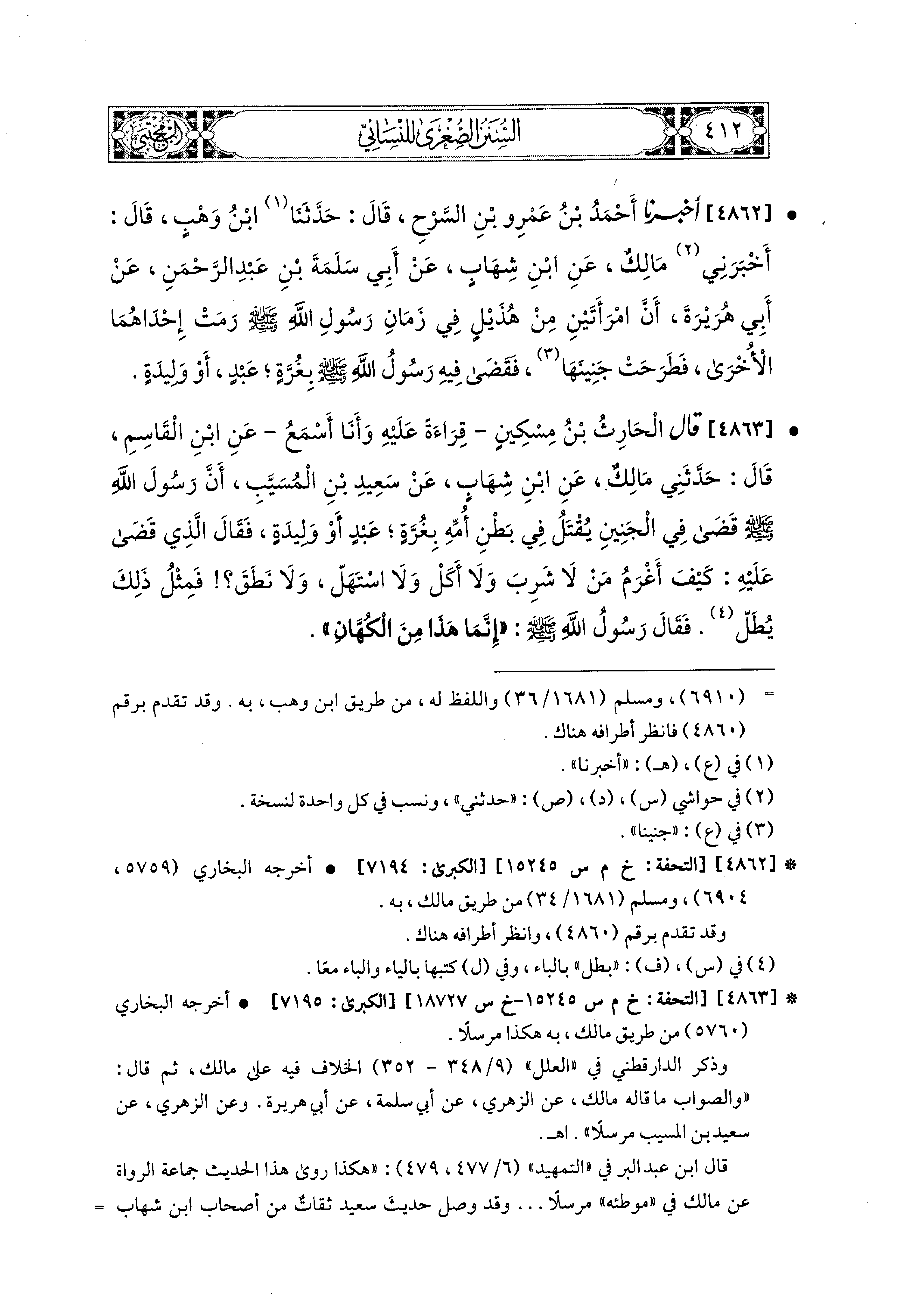 4863- قَالَ: الحَارِثُ بْنُ مِسْكِينٍ، قِرَاءَةً عَلَيْهِ، وَأَنَا أَسْمَعُ، عَنِ ابنِ القَاسِمِ، قَالَ: حَدَّثَني مَالِكٌ، عَنِ ابنِ شِهَابٍ، عَن سَعيدِ بْنِ المُسَيَّبِ؛ أَنَّ رَسُولَ اللهِ صَلى الله عَليه وسَلم قَضَى فِي الجَنينِ يُقْتَلُ فِي بَطْنِ أُمِّهِ بِغُرَّةٍ عَبدٍ، أَوْ وَلِيدَةٍ، فَقَالَ الَّذِي قَضَى عَلَيْهِ: كَيْفَ أُغَرَّمُ مَنْ لاَ شَرِبَ، وَلاَ أَكَلْ، وَلاَ اسْتَهَلَّ، وَلاَ نَطَقَ، فَمِثْلُ ذَلِكَ يُطَلّ؟ فَقَالَ رَسُولُ اللهِ صَلى الله عَليه وسَلم: إِنَّمَا هَذَا مِنَ الكُهَّانِ.