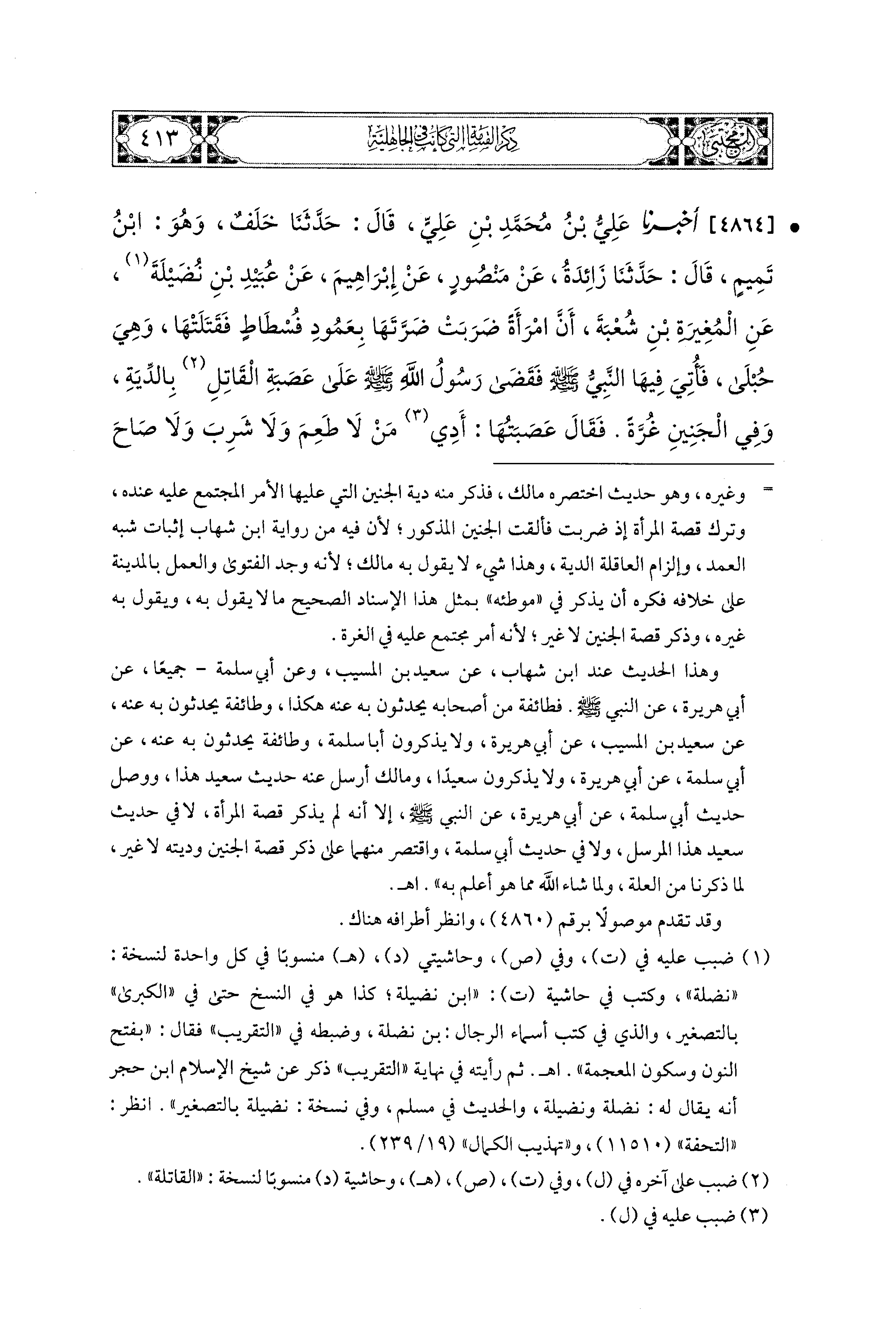 4864- أَخبَرَنا عَلِيُّ بْنُ مُحَمدِ بْنِ عَلِيٍّ، قال: حَدثنا خَلَفٌ، وَهُوَ ابْنُ تَميمٍ، قال: حَدثنا زَائِدَةُ، عَن مَنْصُورٍ، عَن إِبراهِيمَ، عَن عُبَيدِ بْنِ نُضَيْلَةَ، عَنِ المُغِيرَةِ بْنِ شُعْبَةَ؛ أَنَّ امْرَأَةً ضَرَبَتْ ضَرَّتَهَا بِعَمُودِ فُسْطَاطٍ فَقَتَلَتْهَا، وَهِيَ حُبْلَى، فَأُتِيَ فِيهَا النَّبيُّ صَلى الله عَليه وسَلم، فَقَضَى رَسُولُ اللهِ صَلى الله عَليه وسَلم عَلَى عَصَبَةِ القَاتِلَةِ (1) بِالدِّيَةِ، وَفِي الجَنينِ غُرَّةً، فَقَالَ عَصَبَتُهَا: أَدِي مَنْ لاَ طَعِمَ، وَلاَ شَرِبَ، وَلاَ صَاحَ فَاسْتَهَلَّ، فَمِثْلُ هَذَا يُطَلّ؟ فَقَالَ النَّبيُّ صَلى الله عَليه وسَلم: أَسَجْعٌ كَسَجْعِ الأَعْرَابِ؟.