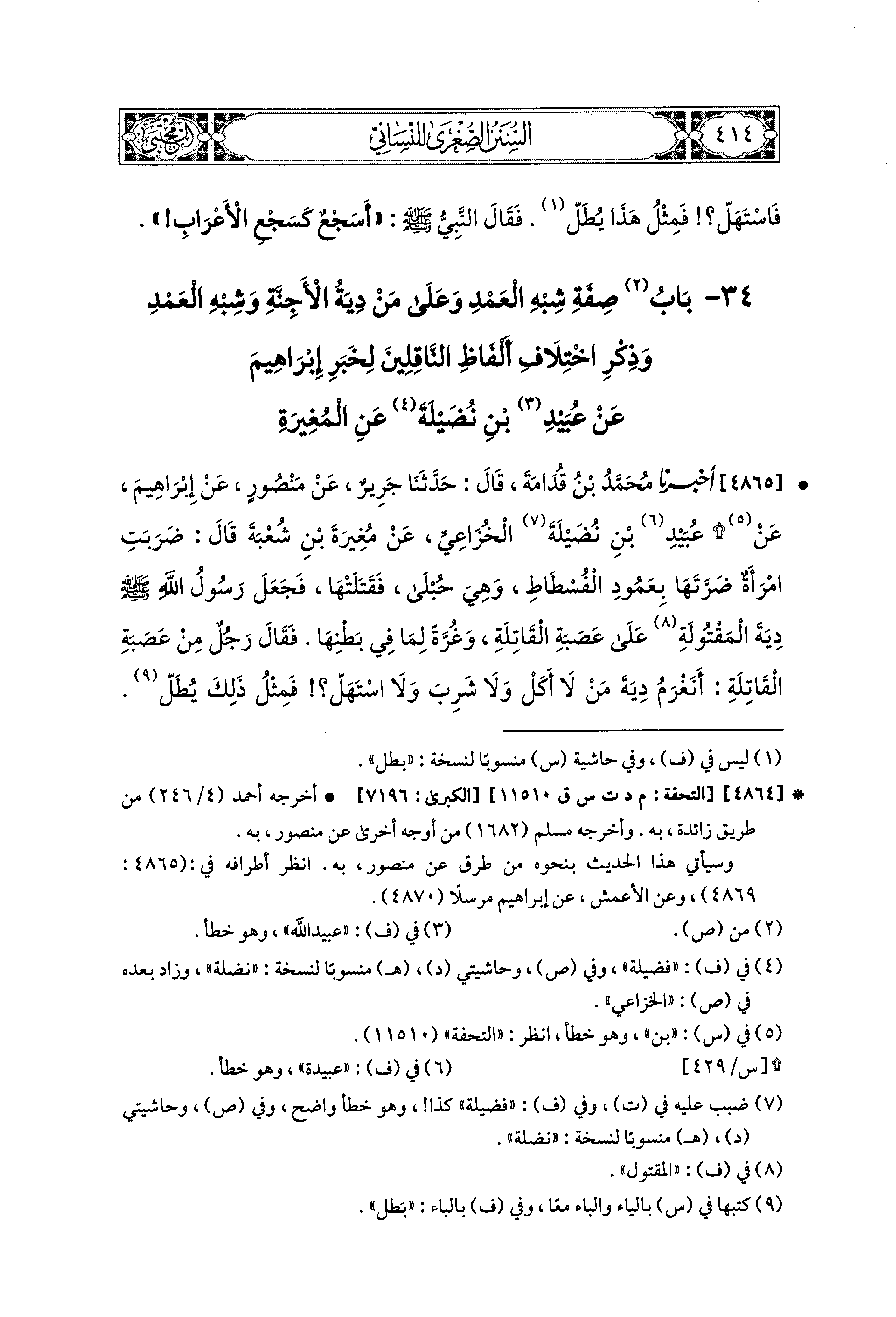 4865- أَخبَرَنا مُحَمد بْنُ قُدَامَةَ، قال: حَدثنا جَرِيرٌ، عَن مَنْصُورٍ، عَن إِبراهِيمَ، عَن عُبَيدِ بْنِ نُضَيْلَةَ الخُزَاعِيِّ، عَنِ مُغِيرَةِ بْنِ شُعْبَةَ، قَالَ: ضَرَبَتِ امْرَأَةٌ ضَرَّتَهَا بِعَمُودِ الفُسْطَاطِ وَهِيَ حُبْلَى فَقَتَلَتْهَا، فَجَعَلَ رَسُولُ اللهِ صَلى الله عَليه وسَلم دِيَةَ المَقْتُولَةِ عَلَى عَصَبَةِ القَاتِلَةِ، وَغُرَّةً لِمَا فِي بَطْنِهَا، فَقَالَ رَجُلٌ مِنْ عَصَبَةِ القَاتِلَةِ: أَنَغْرَمُ دِيَةَ مَنْ لاَ أَكَلْ، وَلاَ شَرِبَ، وَلاَ اسْتَهَلّْ، فَمِثْلُ ذَلِكَ يُطَلّ؟ فَقَالَ رَسُولُ اللهِ صَلى الله عَليه وسَلم: أَسَجْعٌ كَسَجْعِ الأَعْرَابِ؟ فَجَعَلَ عَلَيْهِمُ الدِّيَةَ.