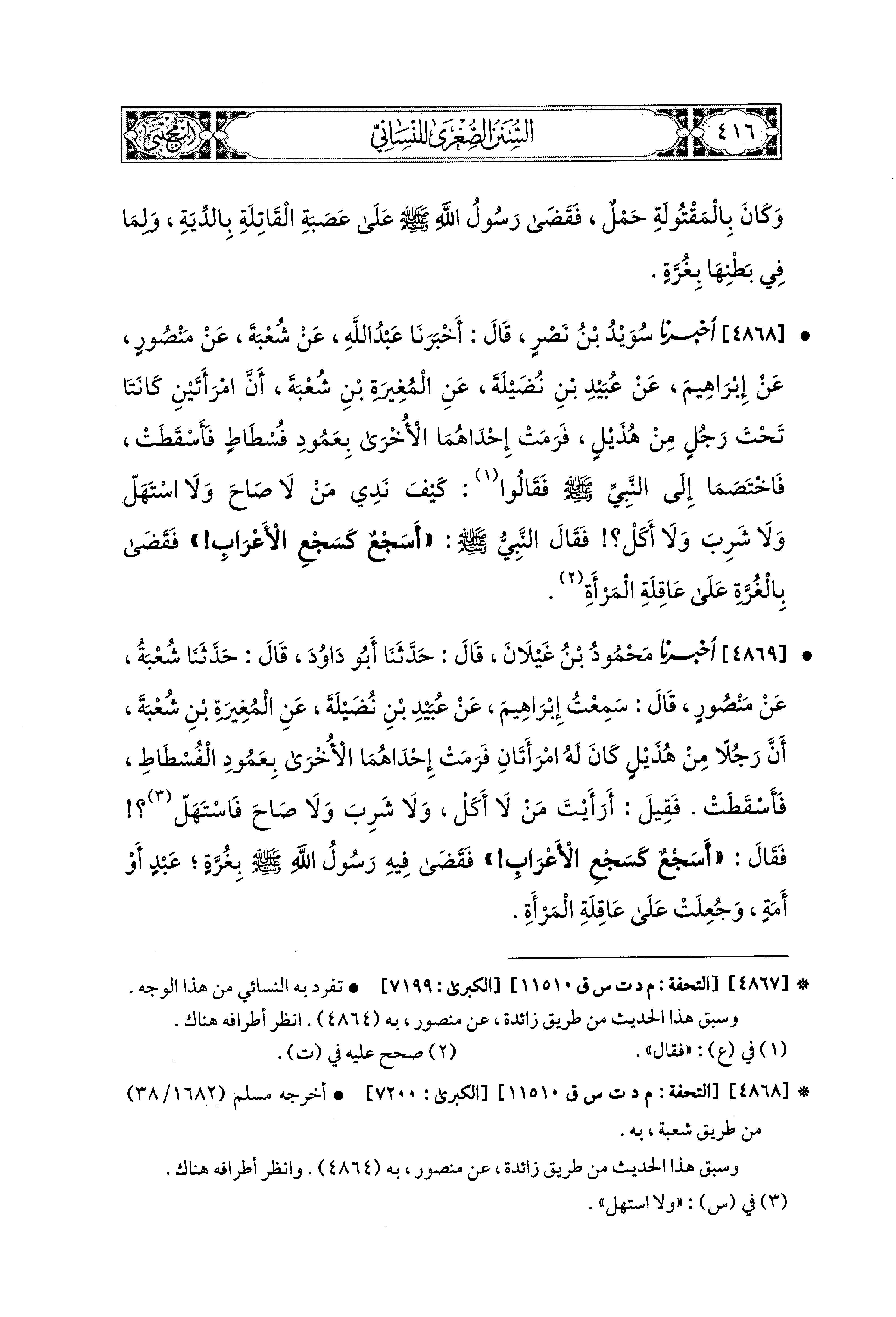 4868- أَخبَرَنا سُوَيْدُ بْنُ نَصْرٍ، قَالَ: أَخبَرنا عَبدُ اللهِ، عَن شُعْبَةَ، عَن مَنْصُورٍ، عَن إِبراهِيمَ، عَن عُبَيدِ بْنِ نُضَيْلَةَ، عَنِ المُغِيرَةِ بْنِ شُعْبَةَ، أَنَّ امْرَأَتَيْنِ كَانَتَا تَحْتَ رَجُلٍ مِنْ هُذَيْلٍ، فَرَمَتْ إِحْدَاهُمَا الأُخْرَى بِعَمُودِ فُسْطَاطٍ فَأَسْقَطَتْ، فَاخْتَصَمَا إِلَى النَّبيِّ صَلى الله عَليه وسَلم، فَقَالُوا: كَيْفَ نَدِي مَنْ لاَ صَاحَ، وَلاَ اسْتَهَلّْ، وَلاَ شَرِبَ، وَلاَ أَكَلْ؟ فَقَالَ النَّبيُّ صَلى الله عَليه وسَلم: أَسَجْعٌ كَسَجْعِ الأَعْرَابِ؟ فَقَضَى بِالغُرَّةِ عَلَى عَاقِلَةِ المَرْأَةِ.