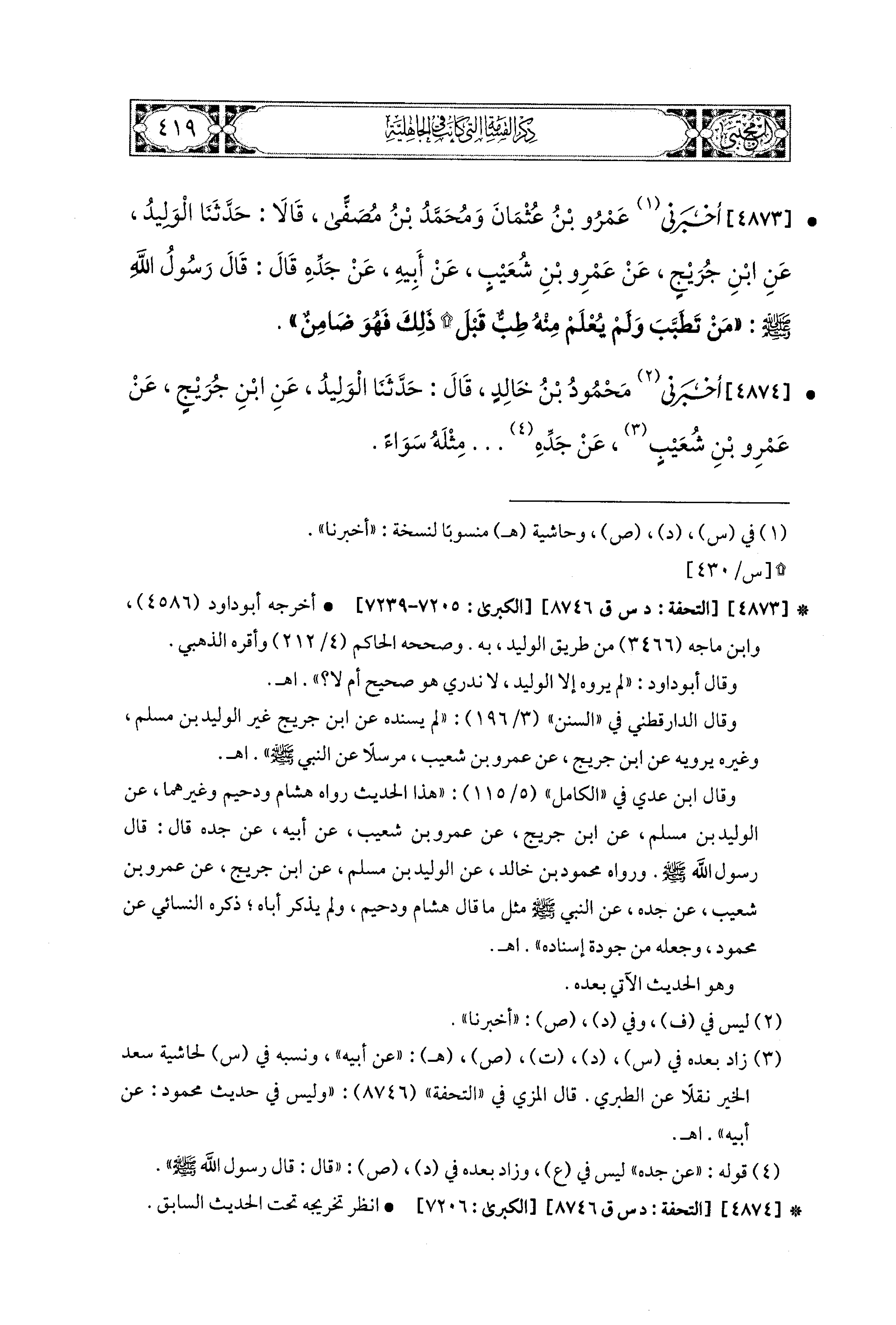 4874- أَخْبَرَني مَحْمُودُ بْنُ خَالِدٍ، قال: حَدثنا الوَلِيدُ، عَنِ ابنِ جُرَيْجٍ، عَن عَمْرِو بْنِ شُعَيبٍ، عَن جَدِّهِ (1), مِثْلَهُ سَوَاءً.