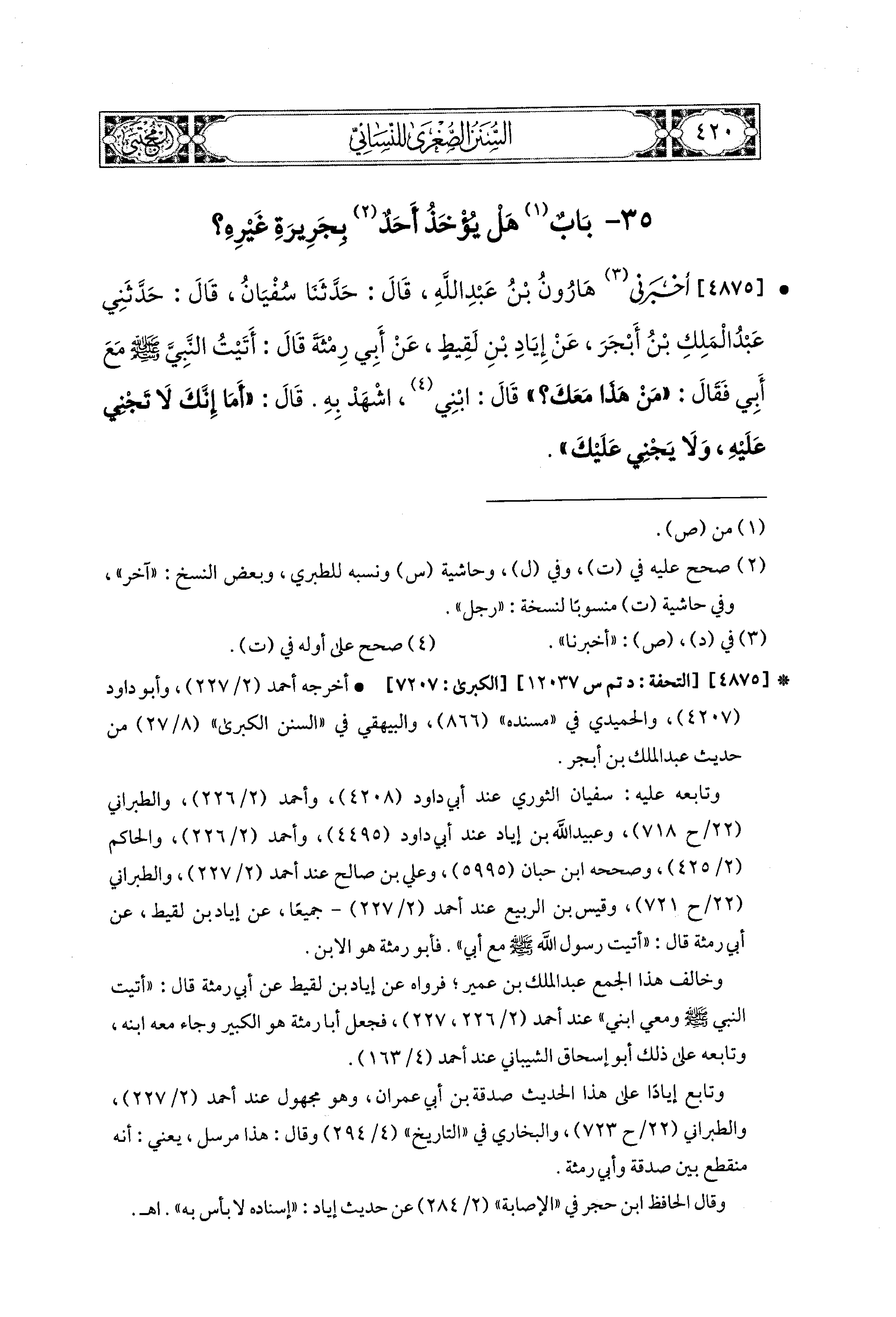 4875- أَخْبَرَني هَارُونُ بْنُ عَبدِ اللهِ، قال: حَدثنا سُفْيَانُ، قَالَ: حَدَّثَني عَبدُ المَلِكِ بْنُ أَبْجَرَ، عَن إِيَادِ بْنِ لَقِيطٍ، عَن أَبِي رِمْثَةَ، قَالَ: أَتَيْتُ النَّبيَّ صَلى الله عَليه وسَلم مَعَ أَبِي فَقَالَ: مَنْ هَذَا مَعَكَ؟ قَالَ: ابْني أَشْهَدُ بِهِ، قَالَ: أَمَا إِنَّكَ لاَ تَجْني عَلَيْهِ، وَلاَ يَجْني عَلَيْكَ.