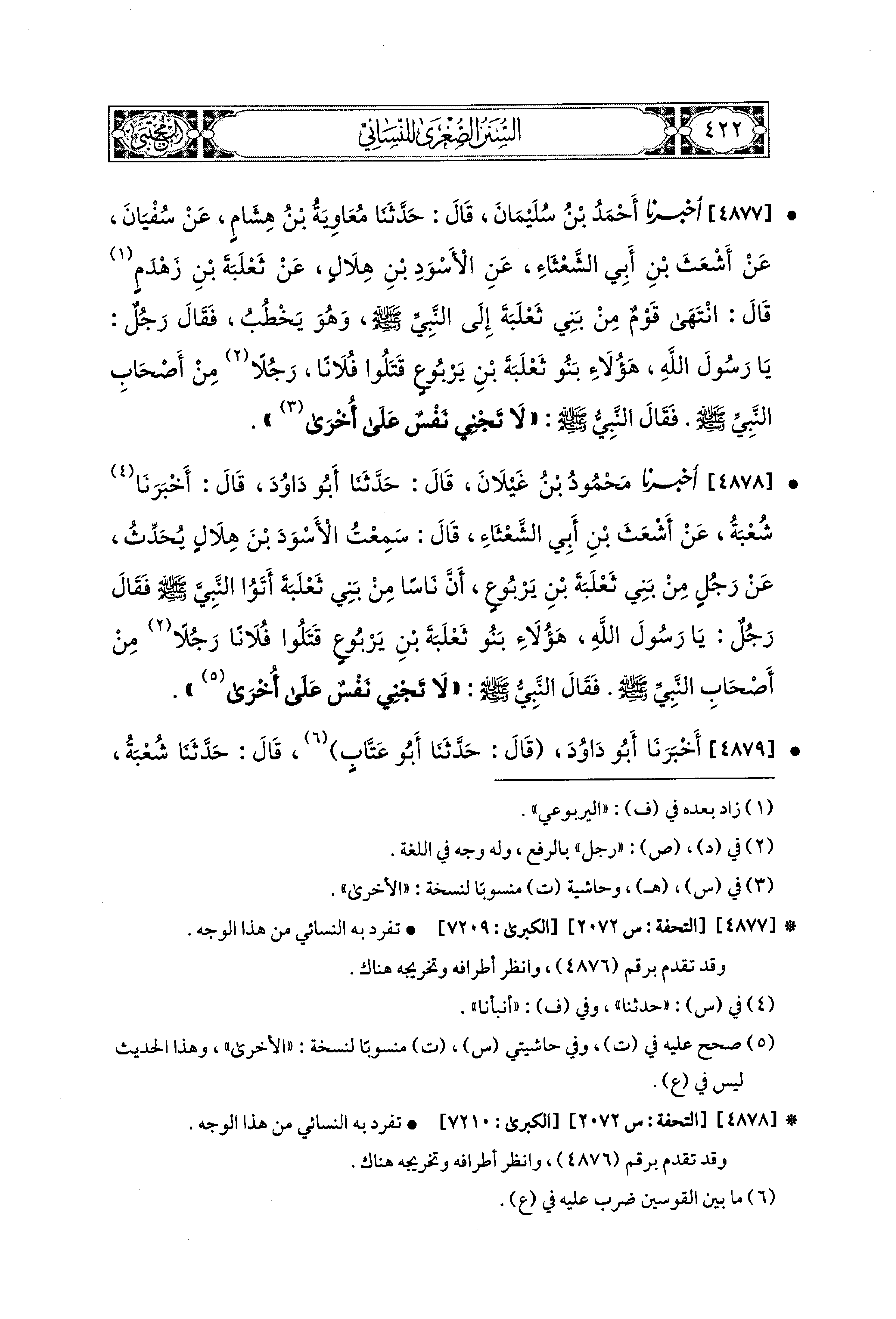 4878- أَخبَرَنا مَحْمُودُ بْنُ غَيْلاَنَ، قال: حَدثنا أَبو دَاوُدَ، قَالَ: أَخبَرنا شُعْبَةُ، عَن أَشْعَثَ بْنِ أَبِي الشَّعْثَاءِ، قَالَ: سَمِعْتُ الأَسْوَدَ بْنَ هِلاَلٍ، يُحَدِّثُ عَن رَجُلٍ مِنْ بَني ثَعْلَبَةَ بْنِ يَرْبُوعٍ، أَنَّ نَاسًا مِنْ بَني ثَعْلَبَةَ أَتَوْا النَّبيَّ صَلى الله عَليه وسَلم فَقَالَ رَجُلٌ: يَا رَسُولَ اللهِ، هَؤُلاَءِ بَنُو ثَعْلَبَةَ بْنِ يَرْبُوعٍ قَتَلُوا فُلاَنًا، رَجُلاً مِنْ أَصْحَابِ النَّبيِّ صَلى الله عَليه وسَلم، فَقَالَ النَّبيُّ صَلى الله عَليه وسَلم: لاَ تَجْني نَفْسٌ عَلَى أُخْرَى.