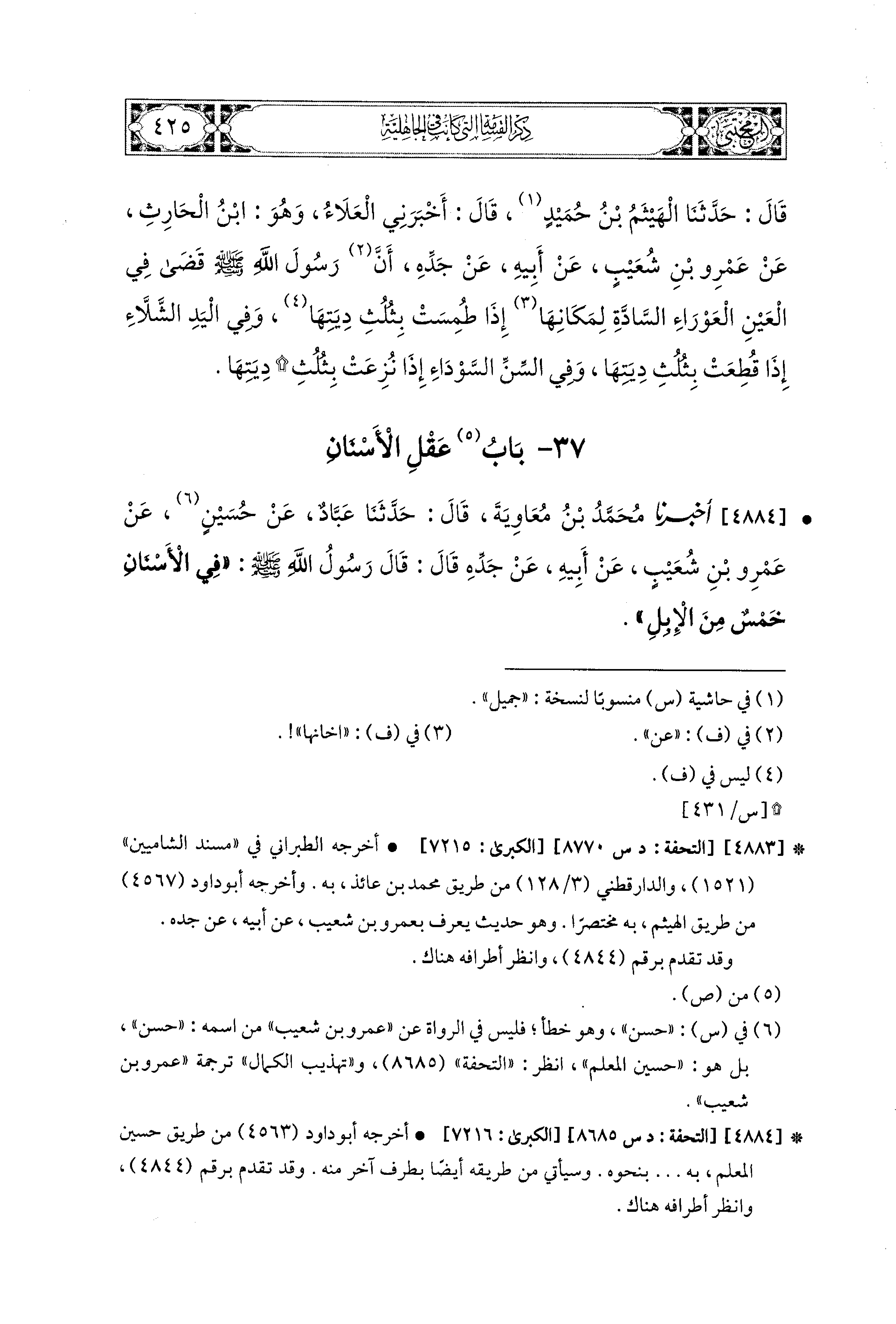 4884- أَخبَرَنا مُحَمد بْنُ مُعَاوِيَةَ، قال: حَدثنا عَبَّادٌ، عَن حُسَيْنٍ، عَن عَمْرِو بْنِ شُعَيبٍ، عَن أَبِيهِ، عَن جَدِّهِ قَالَ: قَالَ رَسُولُ اللهِ صَلى الله عَليه وسَلم: فِي الأَسْنَانِ خَمْسٌ مِنَ الإِبِلِ.