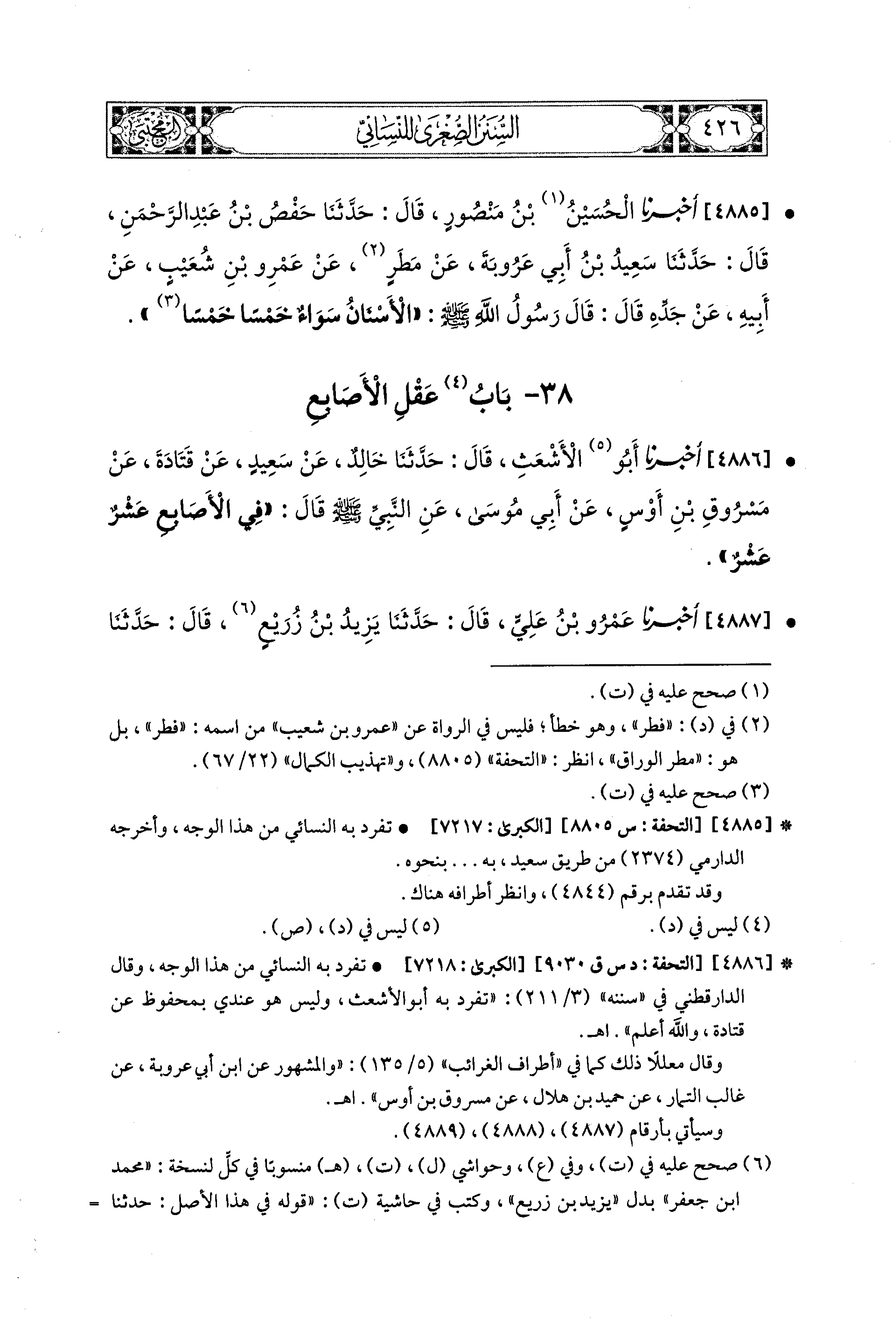 4886- أَخبَرَنا أَبو الأَشْعَثِ، قال: حَدثنا خَالِدٌ، عَن سَعيدٍ، عَن قَتَادَةَ، عَن مَسْرُوقِ بْنِ أَوْسٍ، عَن أَبِي مُوسَى، عَنِ النَّبيِّ صَلى الله عَليه وسَلم قَالَ: فِي الأَصَابِعِ عَشْرٌ عَشْرٌ.