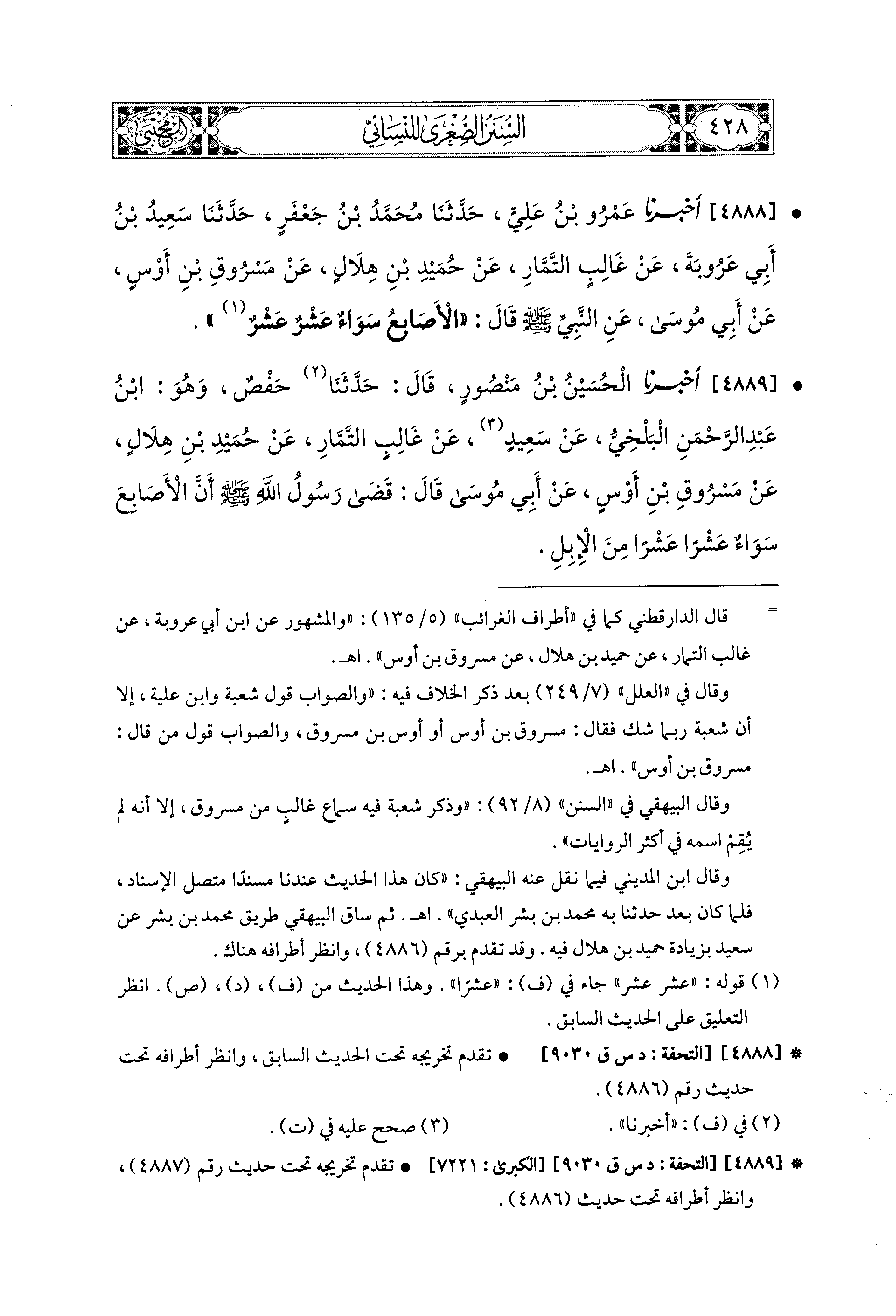 4888- أَخبَرَنا عَمْرُو بْنُ عَلِيٍّ، حدثنا محمد بن جعفر, حدثنا سعيد بن أبي عروبة, عن غالب التمار, عن حميد بن هلال, عن مسروق بن أوس, عن أبي موسى, عن النبي صَلى الله عَليه وسَلم قَالَ: الأَصَابِعُ سَوَاءٌ عشر عَشْر.
