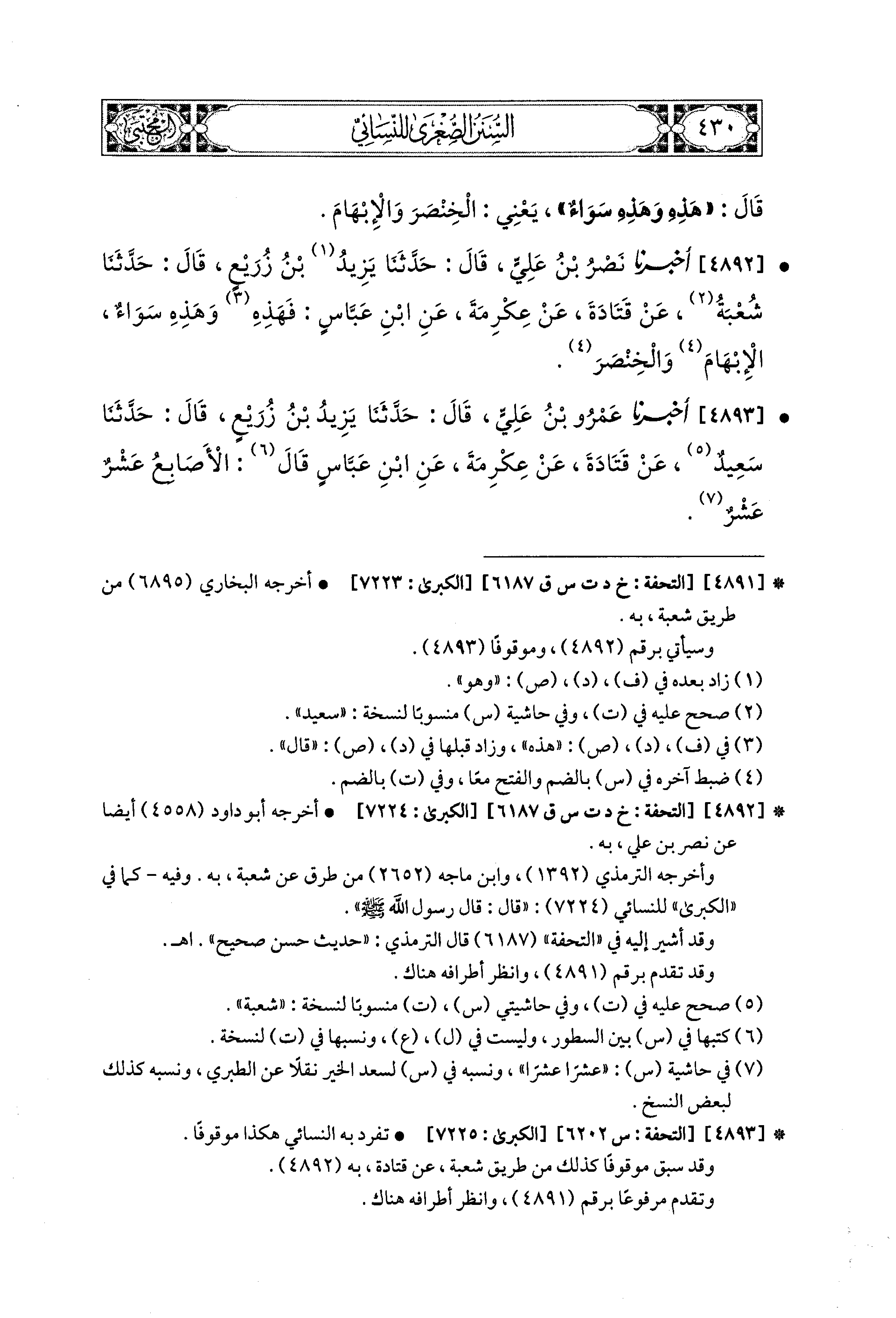 4892- أَخبَرَنا نَصْرُ بْنُ عَلِيٍّ، قال: حَدثنا يَزِيدُ بْنُ زُرَيْعٍ، قال: حَدثنا شُعْبَةُ، عَن قَتَادَةَ، عَن عِكْرِمَةَ، عَنِ ابنِ عَبَّاسٍ (1)؛ فَهَذِهِ وَهَذِهِ سَوَاءٌ الإِبْهَامُ وَالخِنْصَرُ.