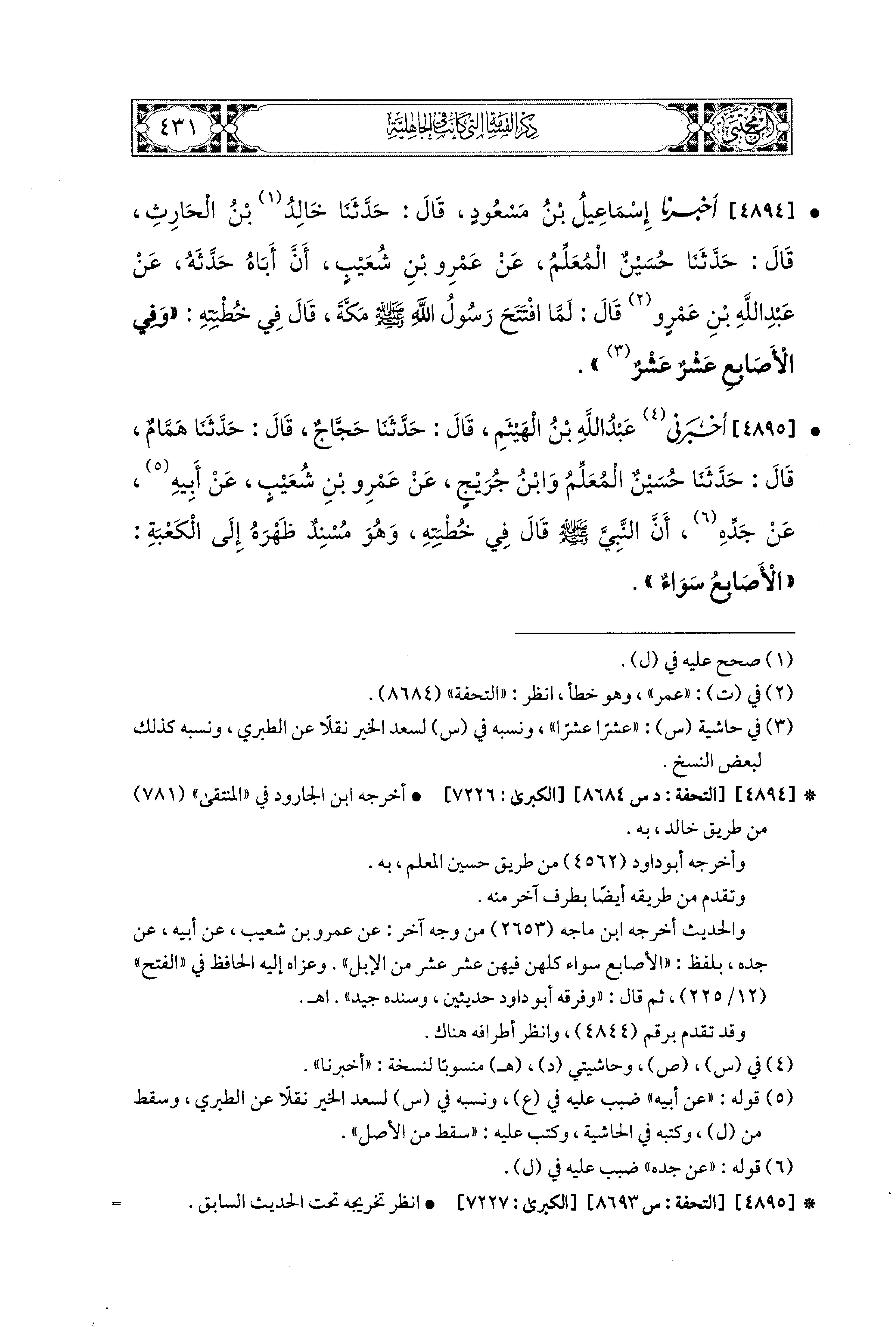 4894- أَخبَرَنا إِسماعِيلُ بْنُ مَسْعُودٍ، قال: حَدثنا خَالِدُ بْنُ الحَارِثِ، قال: حَدثنا حُسَيْنٌ المُعَلِّمُ، عَن عَمْرِو بْنِ شُعَيبٍ، أَنَّ أَبَاهُ حَدَّثَهُ، عَن عَبد اللهِ بن عَمْرٍو قَالَ: لَمَّا افْتَتَحَ رَسُولُ اللهِ صَلى الله عَليه وسَلم مَكَّةَ، قَالَ فِي خُطْبَتِهِ: وَفِي الأَصَابِعِ عَشْرٌ عَشْرٌ.