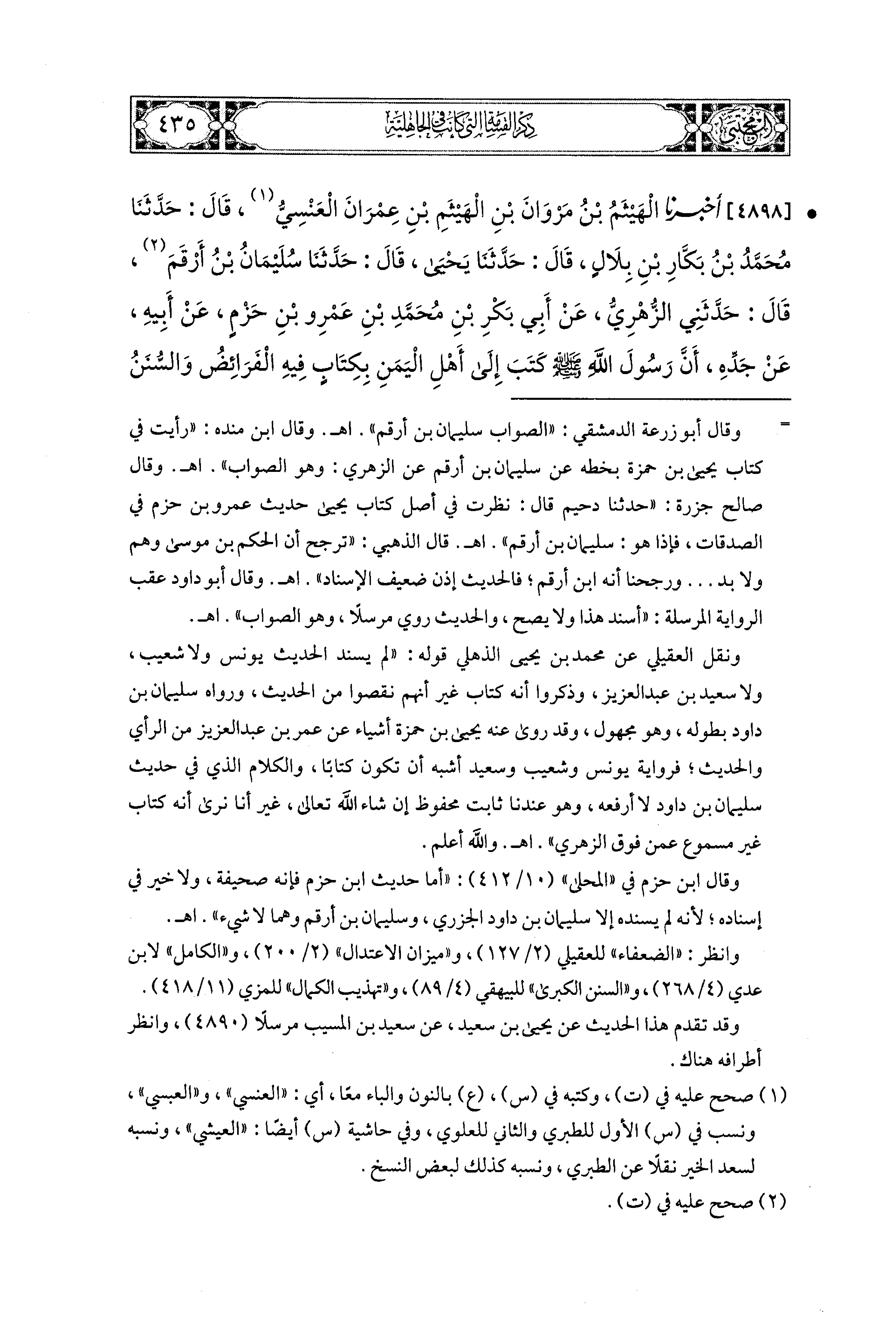4898- أَخبَرَنا الهَيْثَمُ بْنُ مَرْوَانَ بْنِ الهَيْثَمِ بْنِ عِمْرَانَ العَنْسِيُّ، قال: حَدثنا مُحَمدُ بْنُ بَكَّارِ بْنِ بِلاَلٍ، قال: حَدثنا يَحيَى، قال: حَدثنا سُلَيمَانُ بْنُ أَرْقَمَ، قَالَ: حَدَّثَني الزُّهْرِيُّ، عَن أَبِي بَكْرِ بْنِ مُحَمدِ بْنِ عَمْرِو بْنِ حَزْمٍ، عَن أَبِيهِ، عَن جَدِّهِ؛ أَنَّ رَسُولَ اللهِ صَلى الله عَليه وسَلم كَتَبَ إِلَى أَهْلِ اليَمَنِ بِكِتَابٍ فِيهِ الفَرَائِضُ وَالسُّنَنُ وَالدِّيَاتُ، وَبَعَثَ بِهِ مَعَ عَمْرِو بْنِ حَزْمٍ، فَقُرِئَ عَلَى أَهْلِ اليَمَنِ هَذِهِ نُسْخَتُهُ، فَذَكَرَ مِثْلَهُ، إِلاَّ أَنَّهُ قَالَ: وَفِي العَيْنِ الوَاحِدَةِ نِصْفُ الدِّيَةِ، وَفِي اليَدِ الوَاحِدَةِ نِصْفُ الدِّيَةِ، وَفِي الرِّجْلِ الوَاحِدَةِ نِصْفُ الدِّيَةِ.