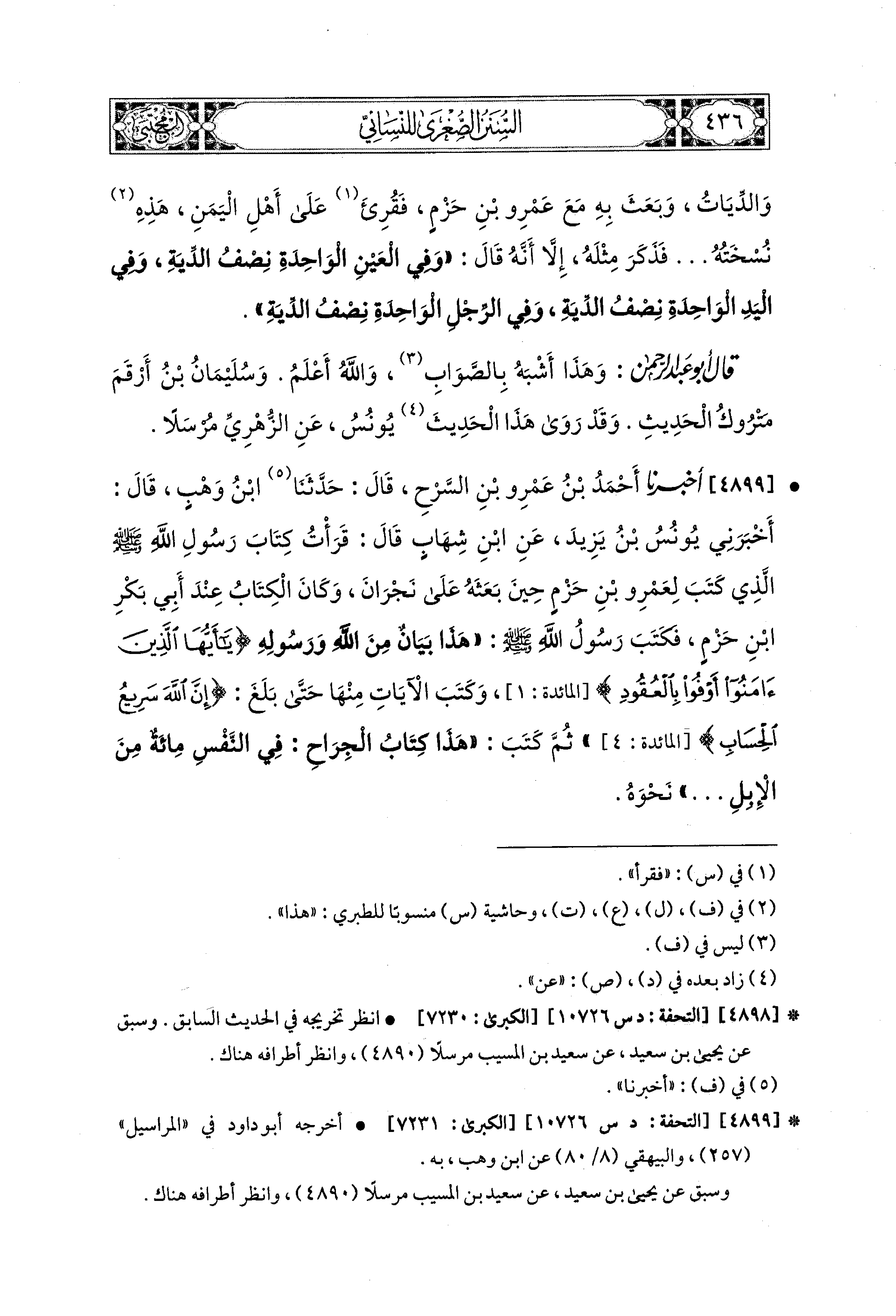 4899 - أَخبَرَنا أَحْمَدُ بْنُ عَمْرِو بْنِ السَّرْحِ، قال: حَدثنا ابْنُ وَهْبٍ، قَالَ: أَخْبَرَني يُونُسُ بْنُ يَزِيدَ، عَنِ ابنِ شِهَابٍ، قَالَ: قَرَأْتُ كِتَابَ رَسُولِ اللهِ صَلى الله عَليه وسَلم الَّذِي كَتَبَ لِعَمْرِو بْنِ حَزْمٍ حِينَ بَعَثَهُ عَلَى نَجْرَانَ، وَكَانَ الكِتَابُ عِنْدَ أَبِي بَكْرِ بْنِ حَزْمٍ، فَكَتَبَ رَسُولُ اللهِ صَلى الله عَليه وسَلم: هَذَا بَيَانٌ مِنَ اللهِ وَرَسُولِهِ: {يَا أَيُّهَا الَّذِينَ آمَنُوا أَوْفُوا بِالعُقُودِ} وَكَتَبَ الآيَاتِ مِنْهَا حَتَّى بَلَغَ {إِنَّ اللهَ سَرِيعُ الحِسَابِ} ثُمَّ كَتَبَ: هَذَا كِتَابُ الجِرَاحِ, فِي النَّفْسِ مِئَةٌ مِنَ الإِبِلِ، نَحْوَهُ.