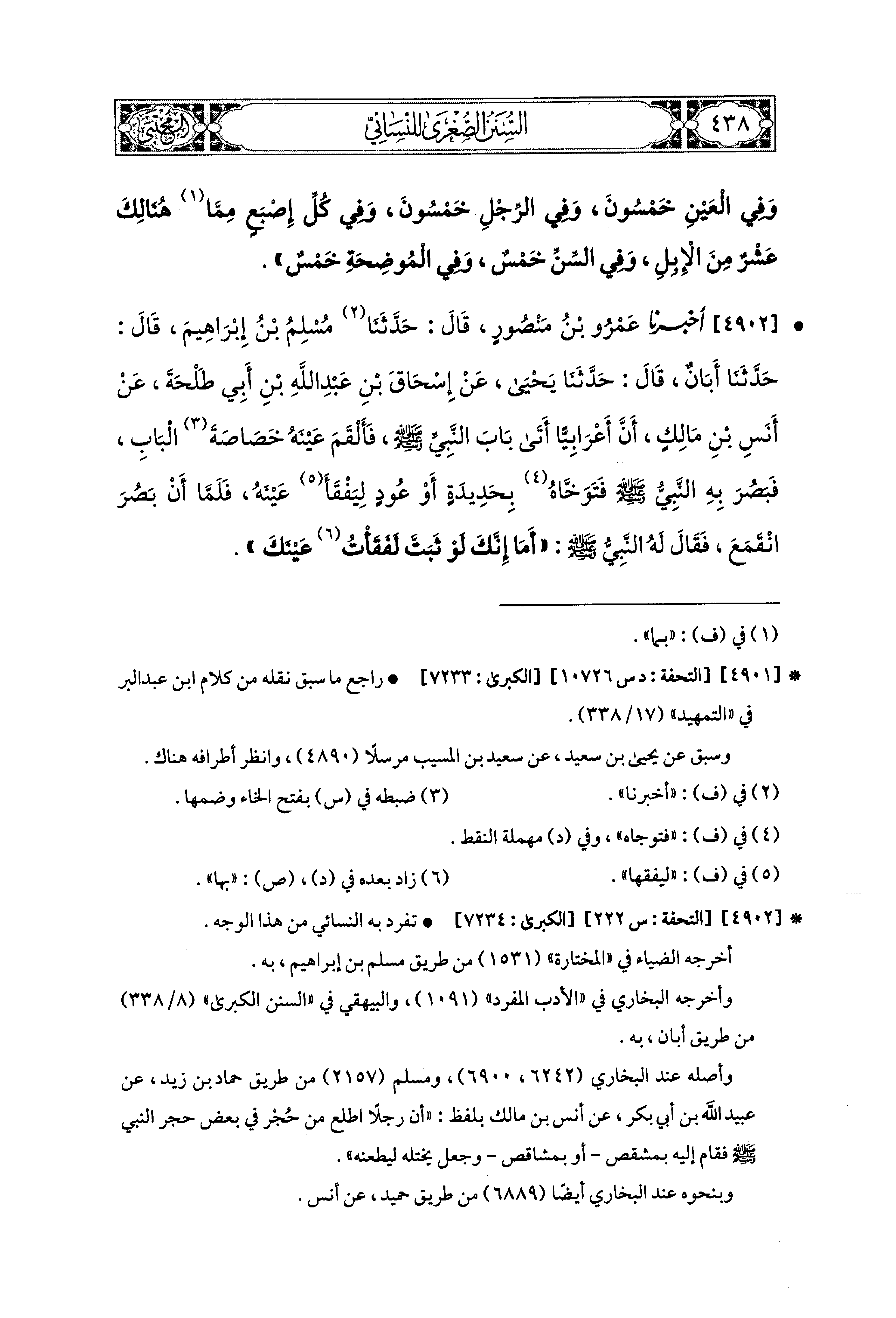 4902- أَخبَرَنا عَمْرُو بْنُ مَنْصُورٍ، قال: حَدثنا مُسْلِمُ بْنُ إِبراهِيمَ، قال: حَدثنا أَبَانُ، قال: حَدثنا يَحيَى، عَن إِسحَاقَ بْنِ عَبدِ اللهِ بْنِ أَبِي طَلْحَةَ، عَن أَنَسِ بْنِ مَالِكٍ، أَنَّ أَعْرَابيًّا أَتَى بَابَ رَسُولِ اللهِ صَلى الله عَليه وسَلم، فَأَلْقَمَ عَيْنَهُ خُصَاصَةَ البَابِ، فَبَصُرَ بِهِ النَّبيُّ صَلى الله عَليه وسَلم فَتَوَخَّاهُ بِحَدِيدَةٍ، أَوْ عُودٍ، لِيَفْقَأَ عَيْنَهُ، فَلَمَّا أَنْ بَصُرَ انْقَمَعَ، فَقَالَ لَهُ النَّبيُّ صَلى الله عَليه وسَلم: أَمَا إِنَّكَ لَوْ ثَبَتَّ لَفَقَأْتُ عَيْنَكَ.