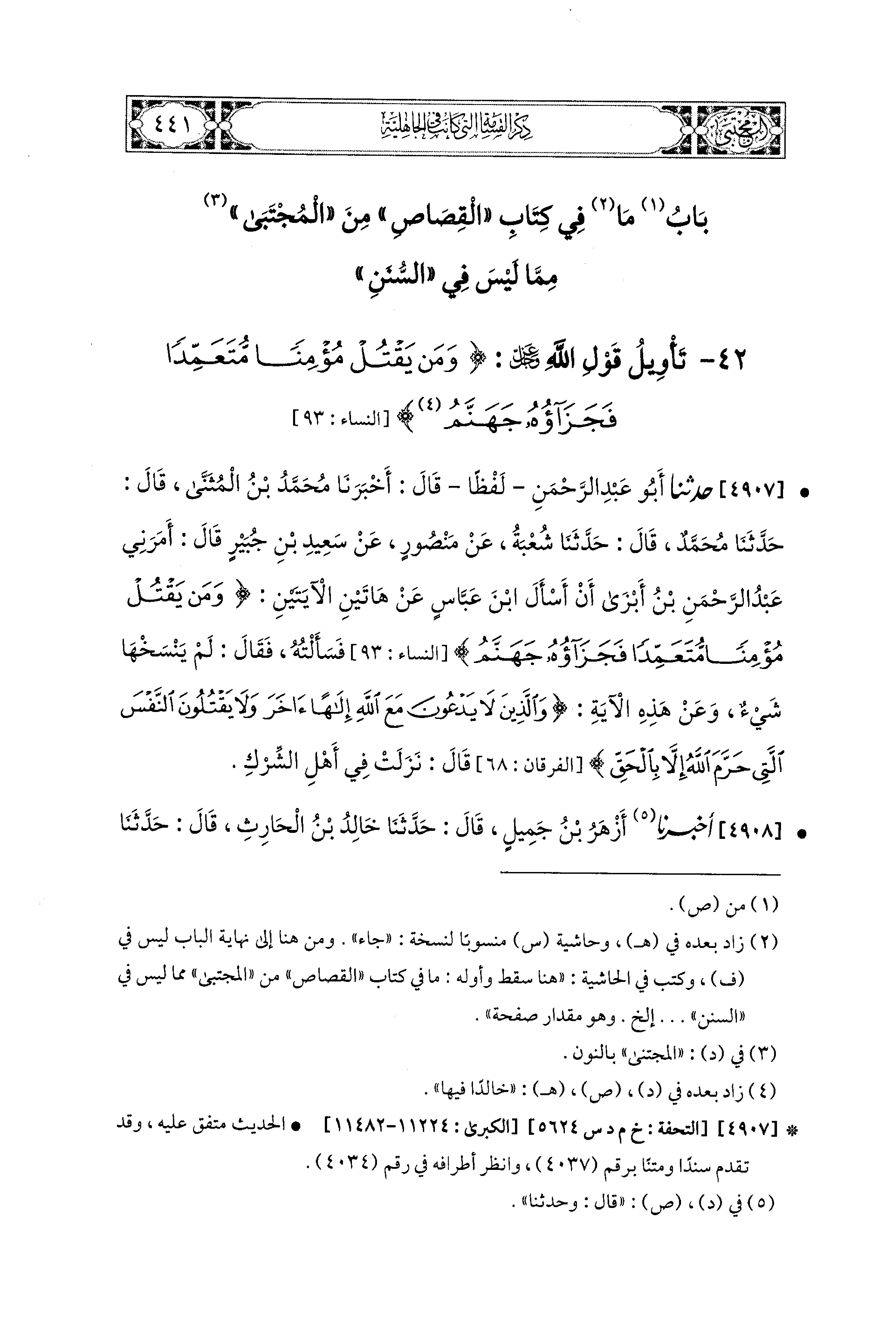 42 - تَأْوِيلُ قَوْلِ اللهِ عَزَّ وَجَلَّ: {وَمَنْ يَقْتُلْ مُؤْمِنًا مُتَعَمِّدًا فَجَزَاؤُهُ جَهَنَّمُ}.