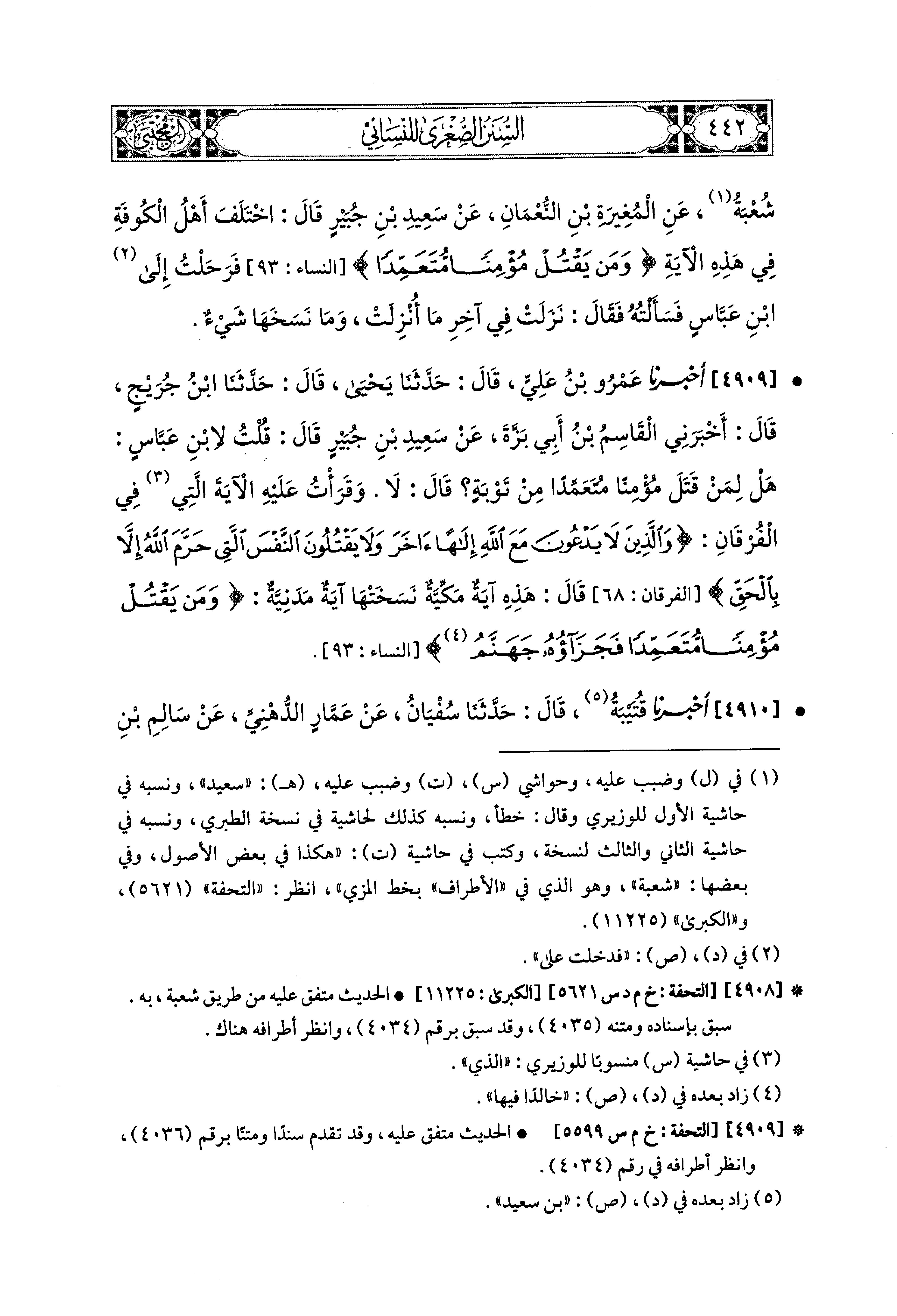 4909- أَخبَرَنا عَمْرُو بْنُ عَلِيٍّ، قال: حَدثنا يَحيَى، قال: حَدثنا ابْنُ جُرَيْجٍ، قَالَ: أَخْبَرَني القَاسِمُ بْنُ أَبِي بَزَّةَ، عَن سَعيدِ بْنِ جُبَيْرٍ قَالَ: قُلْتُ لاِبْنِ عَبَّاسٍ: هَلْ لِمَنْ قَتَلَ مُؤْمِنًا مُتَعَمِّدًا مِنْ تَوْبَةٍ؟ قَالَ: لاَ، وَقَرَأْتُ عَلَيْهِ الآيَةَ الَّتِي فِي الفُرْقَانِ: {وَالَّذِينَ لاَ يَدْعُونَ مَعَ اللهِ إِلَهًا آخَرَ وَلاَ يَقْتُلُونَ النَّفْسَ الَّتِي حَرَّمَ اللهُ إِلاَّ بِالحَقِّ} قَالَ: هَذِهِ آيَةٌ مَكِّيَّةٌ نَسَخَتْهَا آيَةٌ مَدَنيَّةٌ، {وَمَنْ يَقْتُلْ مُؤْمِنًا مُتَعَمِّدًا فَجَزَاؤُهُ جَهَنَّمُ}.
