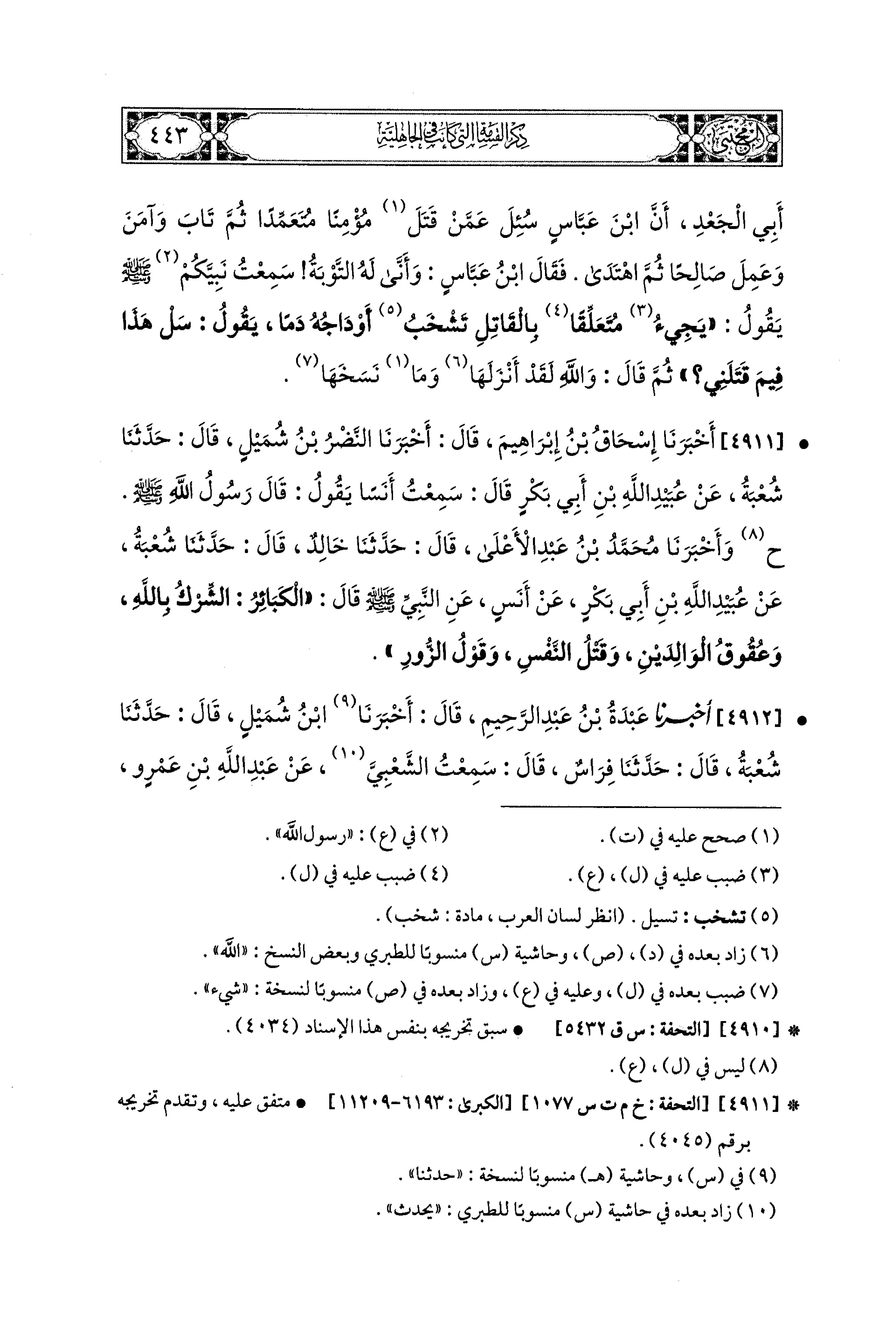 4912- أَخبَرَنا عَبدَةُ بْنُ عَبدِ الرَّحِيمِ، قَالَ: أَخبَرنا ابْنُ شُمَيْلٍ، قال: حَدثنا شُعْبَةُ، قَالَ: حدثنا فِرَاسٌ، قَالَ: سَمِعْتُ الشَّعْبِيَّ، عَن عَبد اللهِ بن عَمْرٍو، عَنِ النَّبيِّ صَلى الله عَليه وسَلم قَالَ: الكَبَائِرُ: الإِشْرَاكُ بِالله، وَعُقُوقُ الوَالِدَيْنِ، وَقَتْلُ النَّفْسِ، وَاليَمينُ الغَمُوسُ.
