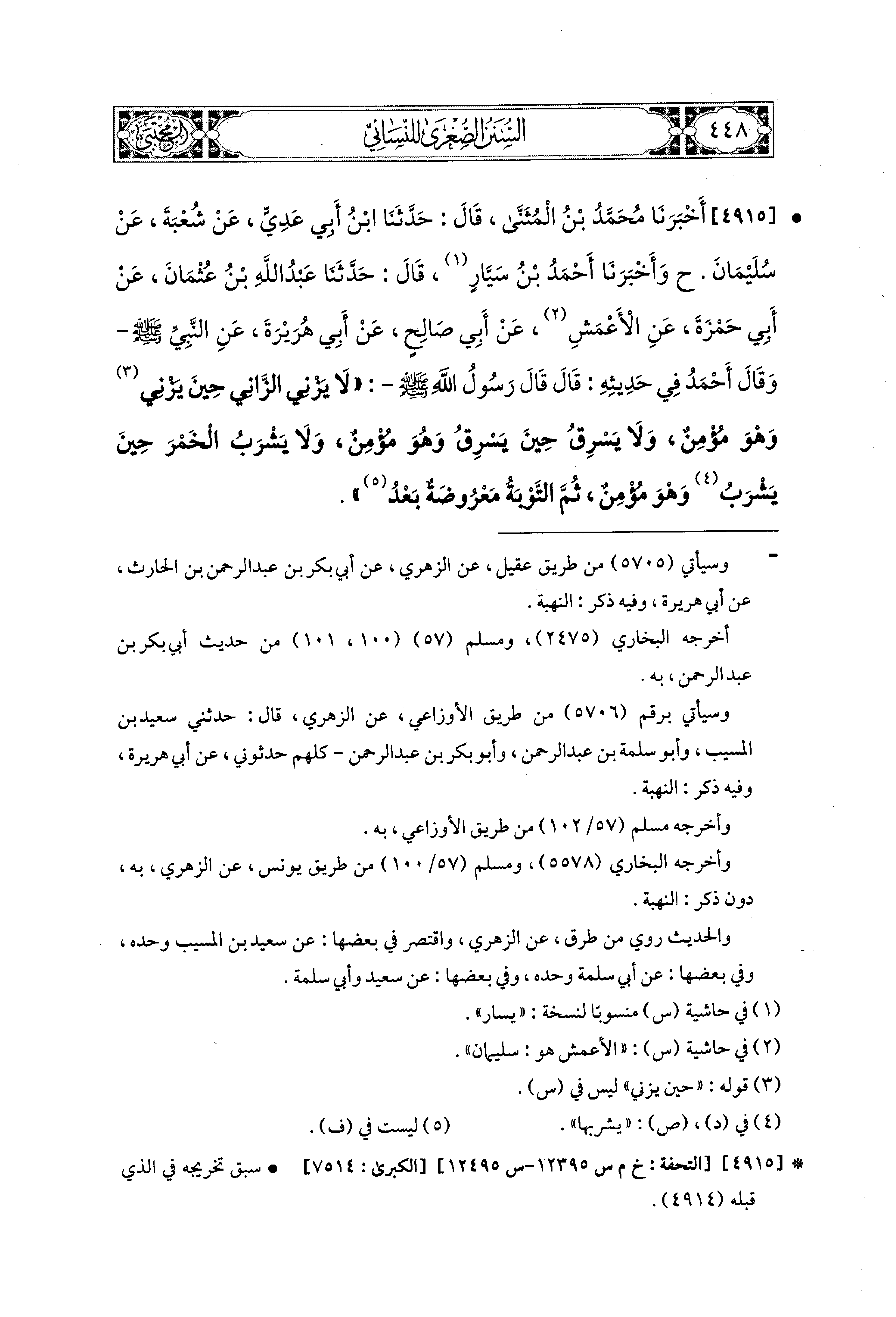 4915- أَخبَرَنا مُحَمد بْنُ المُثَنَّى، قال: حَدثنا ابْنُ أَبِي عَدِيٍّ، عَن شُعْبَةَ، عَن سُلَيمَانَ (ح) وَأَخبَرنا أَحْمَدُ بْنُ سَيَّارٍ، قال: حَدثنا عَبدُ اللهِ بْنُ عُثمَانَ، عَن أَبِي حَمْزَةَ، عَنِ الأَعْمَشِ، عَن أَبِي صَالِحٍ، عَن أَبِي هُرَيرَةَ، عَنِ النَّبيِّ صَلى الله عَليه وسَلم، وَقَالَ أَحْمَدُ فِي حَدِيثِهِ قَالَ: قَالَ رَسُولُ اللهِ صَلى الله عَليه وسَلم: لاَ يَزْني الزَّاني حِينَ يَزْني وَهُوَ مُؤْمِنٌ، وَلاَ يَسْرِقُ حِينَ يَسْرِقُ وَهُوَ مُؤْمِنٌ، وَلاَ يَشْرَبُ الخَمْرَ حِينَ يَشْرَبُ وَهُوَ مُؤْمِنٌ، ثُمَّ التَّوْبَةُ مَعْرُوضَةٌ بَعْدُ.