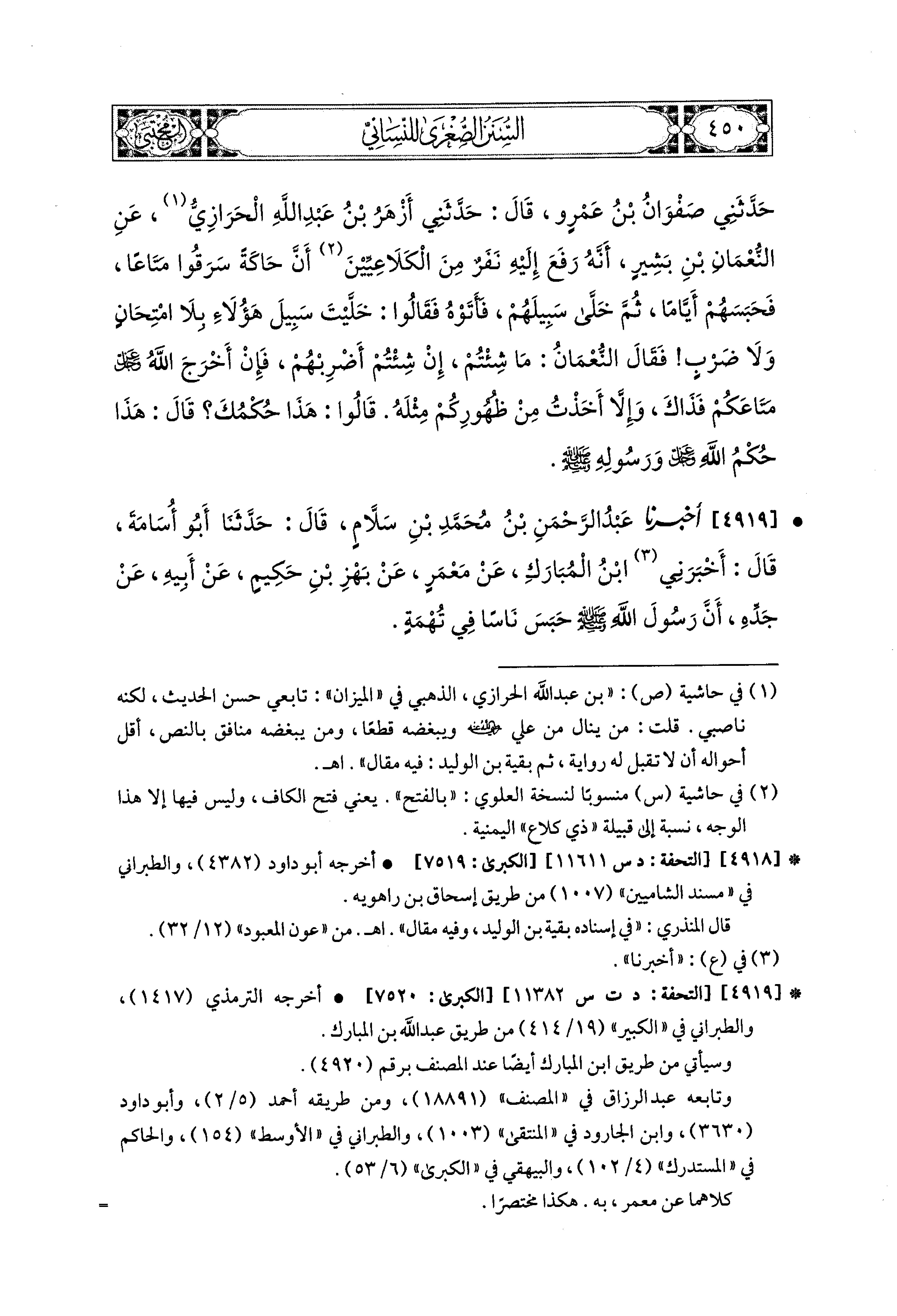 4919- أَخبَرَنا عَبدُ الرَّحمَنِ بْنُ مُحَمدِ بْنِ سَلاَّمٍ، قال: حَدثنا أَبو أُسَامَةَ، قَالَ: أَخْبَرَني ابْنُ المُبَارَكِ، عَن مَعْمَرٍ، عَن بَهْزِ بْنِ حَكِيمٍ، عَن أَبِيهِ، عَن جَدِّهِ؛ أَنَّ رَسُولَ اللهِ صَلى الله عَليه وسَلم حَبَسَ نَاسًا فِي تُهْمَةٍ.
