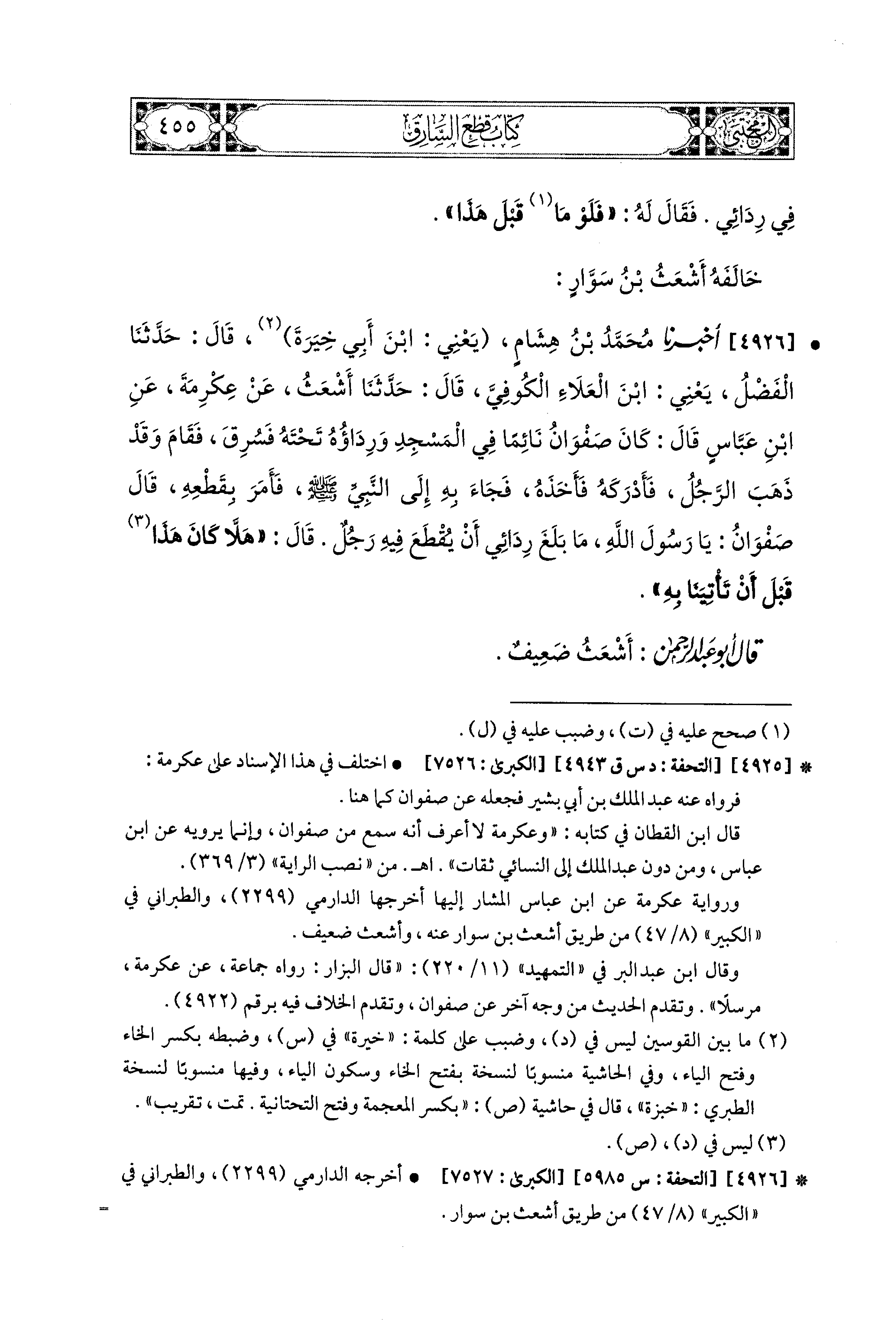 4926- أَخبَرَنا مُحَمد بْنُ هِشَامٍ، يَعْني ابْنَ أَبِي خِيَرَةَ، قال: حَدثنا الفَضْلُ، يَعْني ابْنَ العَلاَءِ الكُوفِيَّ، قال: حَدثنا أَشْعَثُ، عَن عِكْرِمَةَ، عَنِ ابنِ عَبَّاسٍ، قَالَ: كَانَ صَفْوَانُ نَائِمًا فِي المَسْجِدِ وَرِدَاؤُهُ تَحْتَهُ فَسُرِقَ، فَقَامَ وَقَدْ ذَهَبَ الرَّجُلُ فَأَدْرَكَهُ، فَأَخَذَهُ فَجَاءَ بِهِ إِلَى النَّبيِّ صَلى الله عَليه وسَلم، فَأَمَرَ بِقَطْعِهِ، قَالَ صَفْوَانُ: يَا رَسُولَ اللهِ، مَا بَلَغَ رِدَائِي أَنْ يُقْطَعَ فِيهِ رَجُلٌ، قَالَ: هَلاَّ كَانَ هَذَا قَبْلَ أَنْ تَأْتِيَنَا بِهِ.