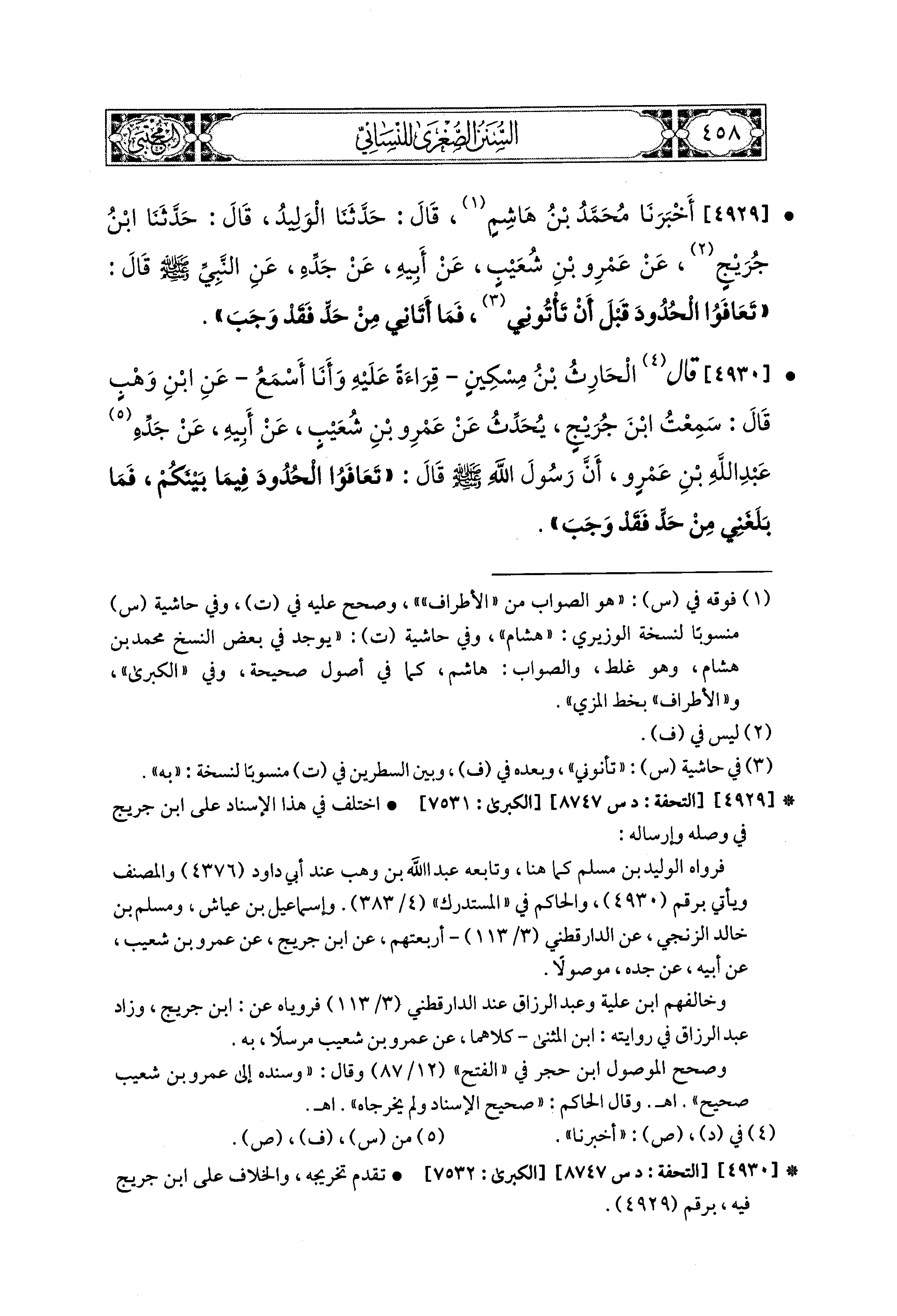 4929- أَخبَرَنا مُحَمد بْنُ هَاشِمٍ، قال: حَدثنا الوَلِيدُ، قال: حَدثنا ابْنُ جُرَيْجٍ، عَن عَمْرِو بْنِ شُعَيبٍ، عَن أَبِيهِ، عَن جَدِّهِ، عَنِ النَّبيِّ صَلى الله عَليه وسَلم قَالَ: تَعَافَوْا الحُدُودَ قَبْلَ أَنْ تَأْتُوني، فَمَا أَتَاني مِنْ حَدٍّ فَقَدْ وَجَبَ.
