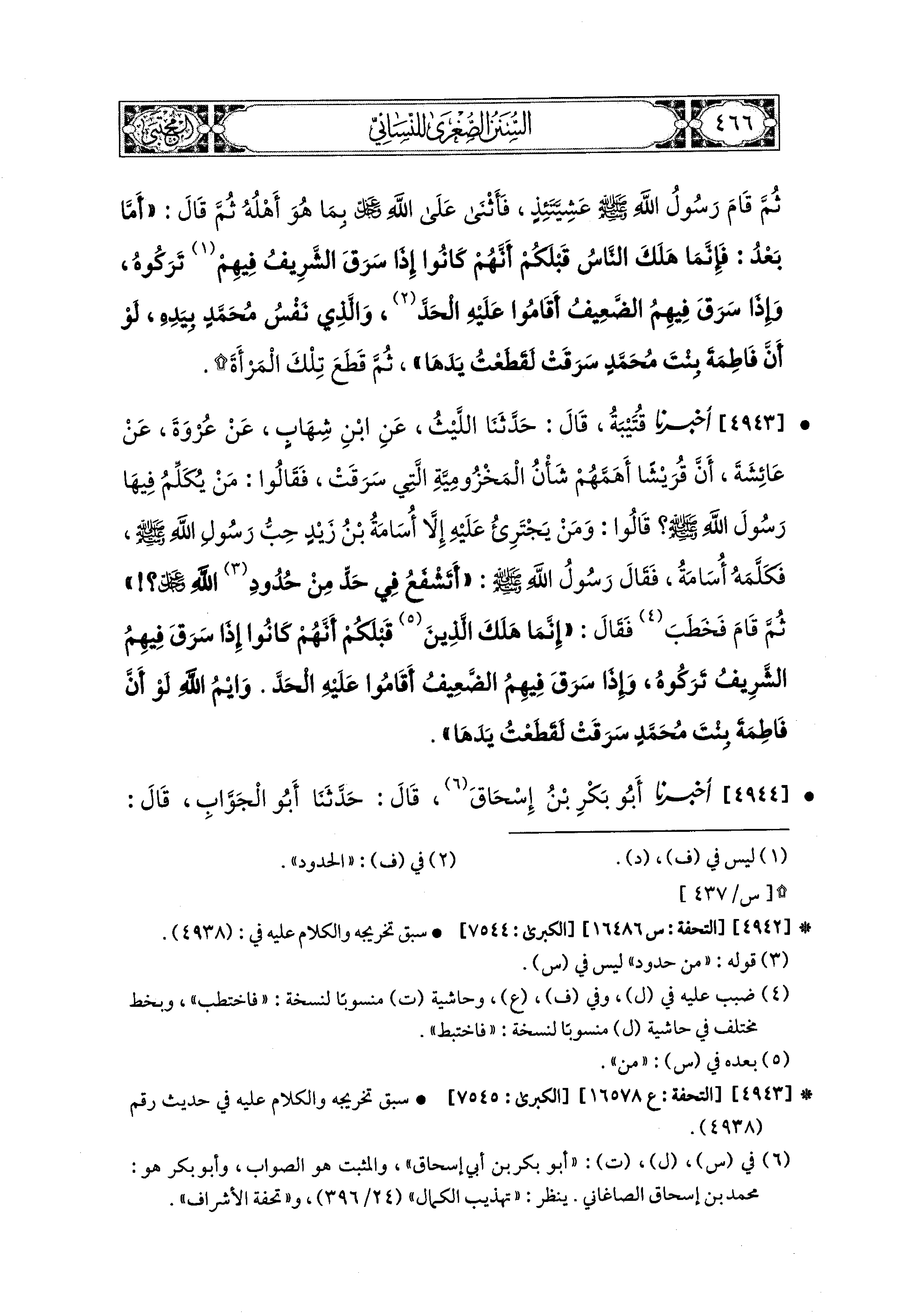 4944- أَخبَرَنا أَبو بَكْرِ بْنُ إِسحَاقَ، قال: حَدثنا أَبو الجَوَّابِ، قال: حَدثنا عَمَّارُ بْنُ رُزَيْقٍ, عَن مُحَمدِ بْنِ عَبدِ الرَّحمَنِ بْنِ أَبِي لَيْلَى، عَن إِسماعِيلَ بْنِ أُمَيَّةَ، عَن مُحَمدِ بْنِ مُسْلِمٍ، عَن عُرْوَةَ، عَن عَائِشَةَ قَالَتْ: سَرَقَتِ امْرَأَةٌ مِنْ قُرَيْشٍ مِنْ بَني مَخْزُومٍ، فَأُتِيَ بِهَا النَّبيُّ صَلى الله عَليه وسَلم، فَقَالُوا: مَنْ يُكَلِّمُهُ فِيهَا؟ قَالُوا: أُسَامَةُ بْنُ زَيْدٍ، فَأَتَاهُ فَكَلَّمَهُ، فَزَبَرَهُ، وَقَالَ: إِنَّ بَني إِسْرَائِيلَ كَانُوا إِذَا سَرَقَ فِيهِمُ الشَّرِيفُ تَرَكُوهُ، وَإِذَا سَرَقَ الوَضِيعُ قَطَعُوهُ، وَالَّذِي نَفْسِي بِيَدِهِ، لَوْ أَنَّ فَاطِمَةَ بِنْتَ مُحَمدٍ سَرَقَتْ لَقَطَعْتُهَا.