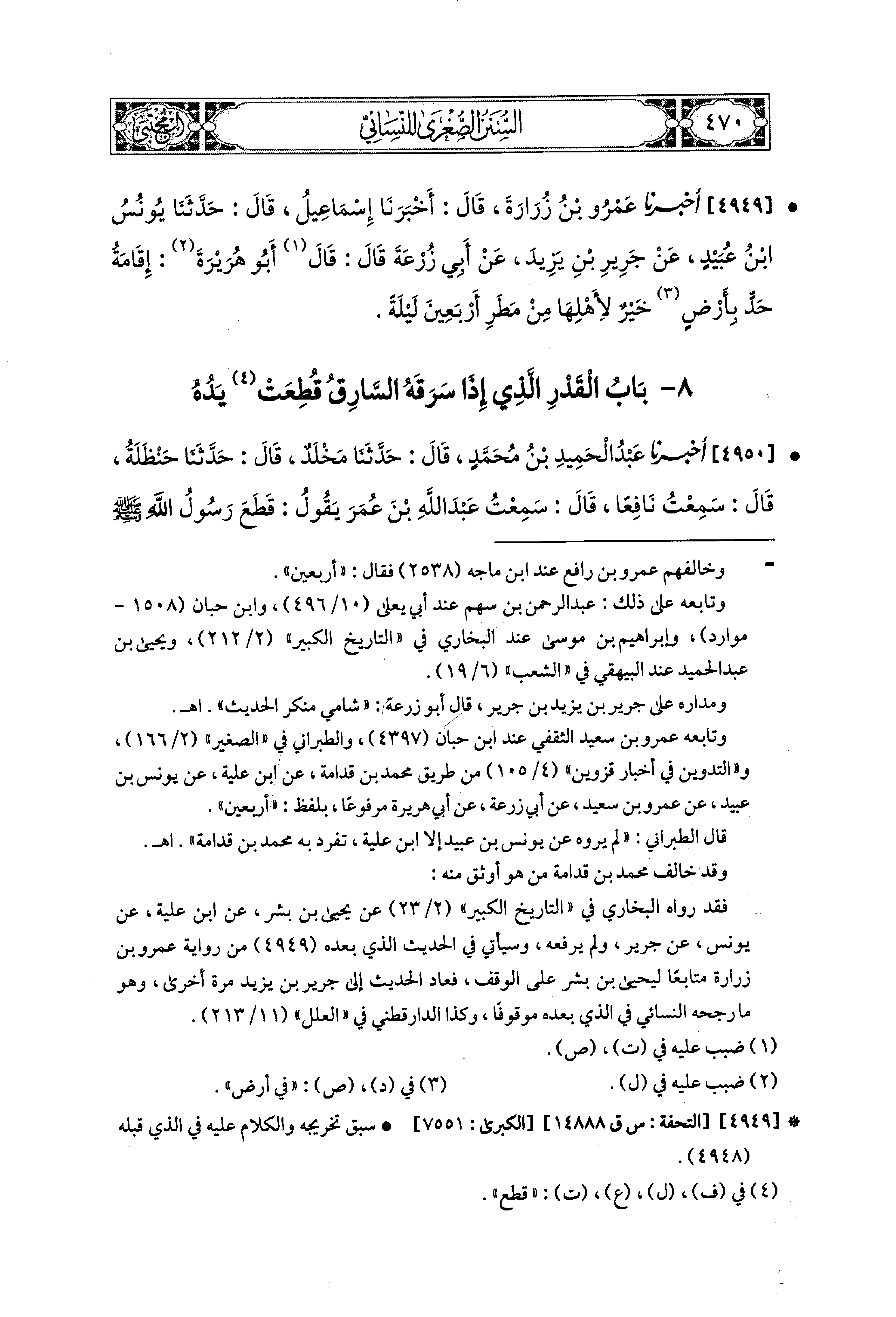 4949- أَخبَرَنا عَمْرُو بْنُ زُرَارَةَ، قَالَ: أَخبَرنا إِسماعِيلُ، قال: حَدثنا يُونُسُ بْنُ عُبَيدٍ، عَن جَرِيرِ بْنِ يَزِيدَ، عَن أَبِي زُرْعَةَ قَالَ: قَالَ أَبو هُرَيرَةَ: إِقَامَةُ حَدٍّ بِأَرْضٍ خَيْرٌ لأَهْلِهَا مِنْ مَطَرِ أَرْبَعِينَ لَيْلَةً.