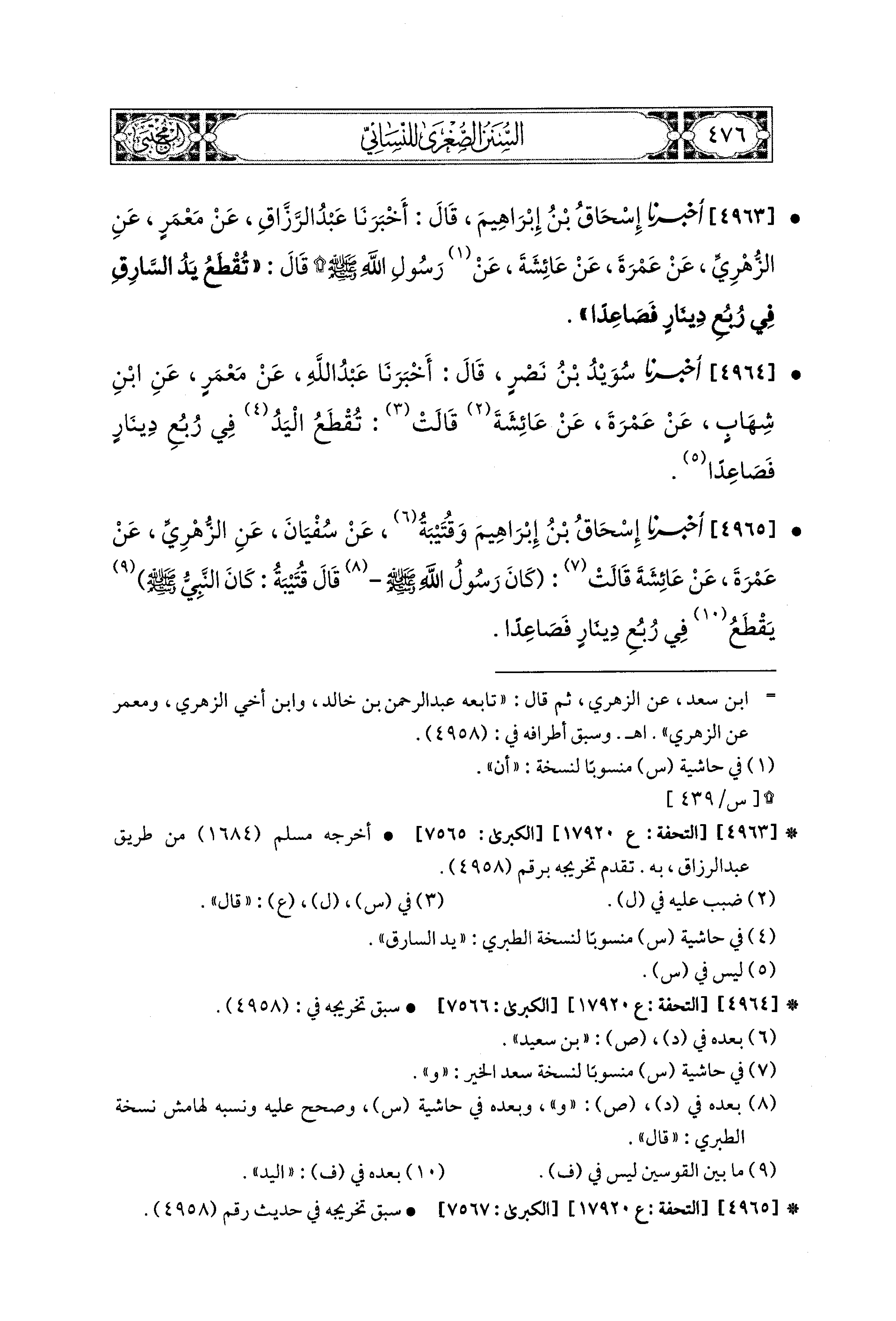 4964- أَخبَرَنا سُوَيْدُ بْنُ نَصْرٍ، قَالَ: أَخبَرنا عَبدُ اللهِ، عَن مَعْمَرٍ، عَنِ ابنِ شِهَابٍ، عَن عَمْرَةَ، عَن عَائِشَةَ قَالَتْ: تُقْطَعُ اليَدُ فِي رُبْعِ دِينَارٍ فَصَاعِدًا.