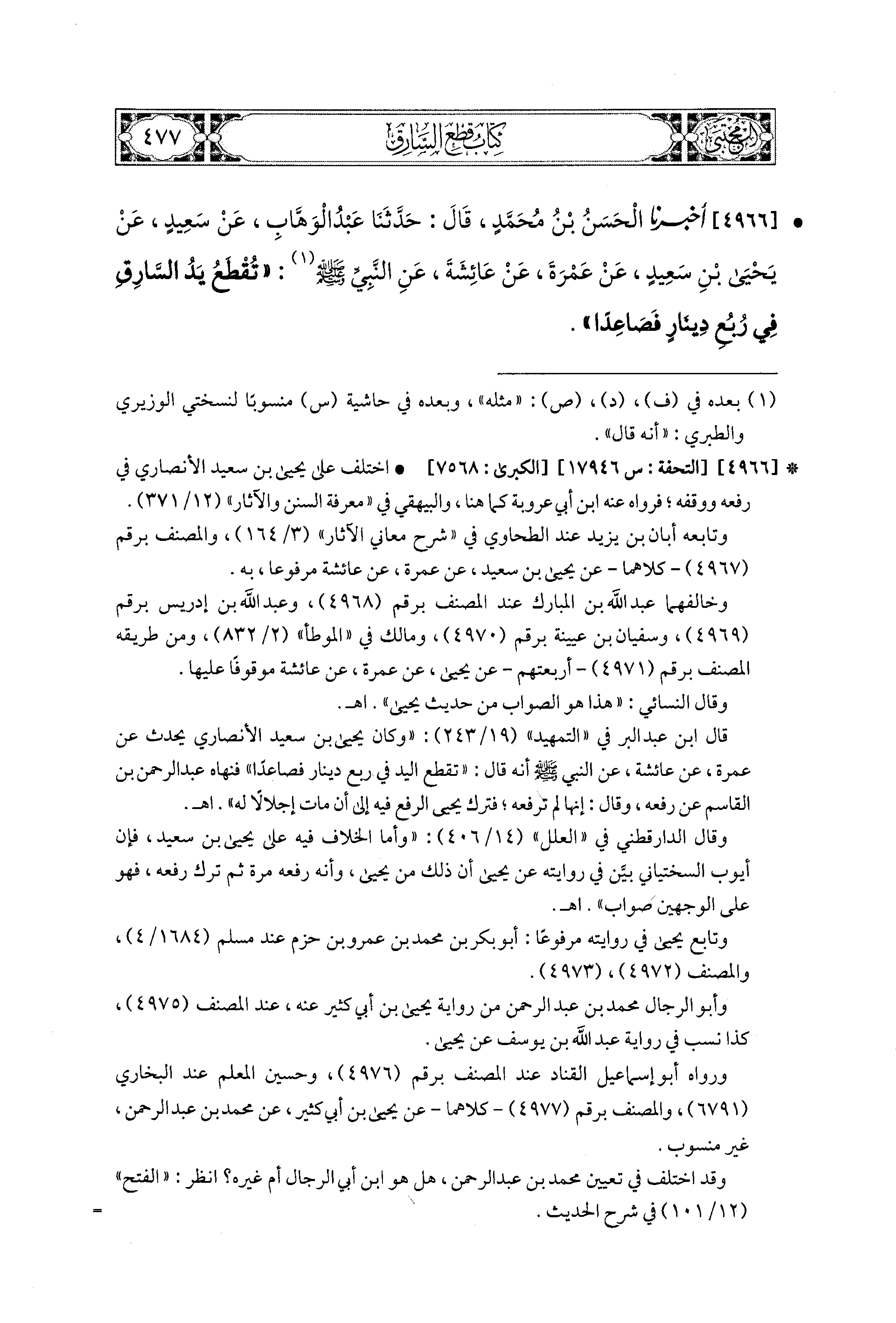 4966- أَخبَرَنا الحَسَنُ بْنُ مُحَمدٍ، قال: حَدثنا عَبدُ الوَهَّابِ، عَن سَعيدٍ، عَن يَحيَى بْنِ سَعيدٍ، عَن عَمْرَةَ، عَن عَائِشَةَ، عَنِ النَّبيِّ صَلى الله عَليه وسَلم: تُقْطَعُ يَدُ السَّارِقِ فِي رُبْعِ دِينَارٍ فَصَاعِدًا.