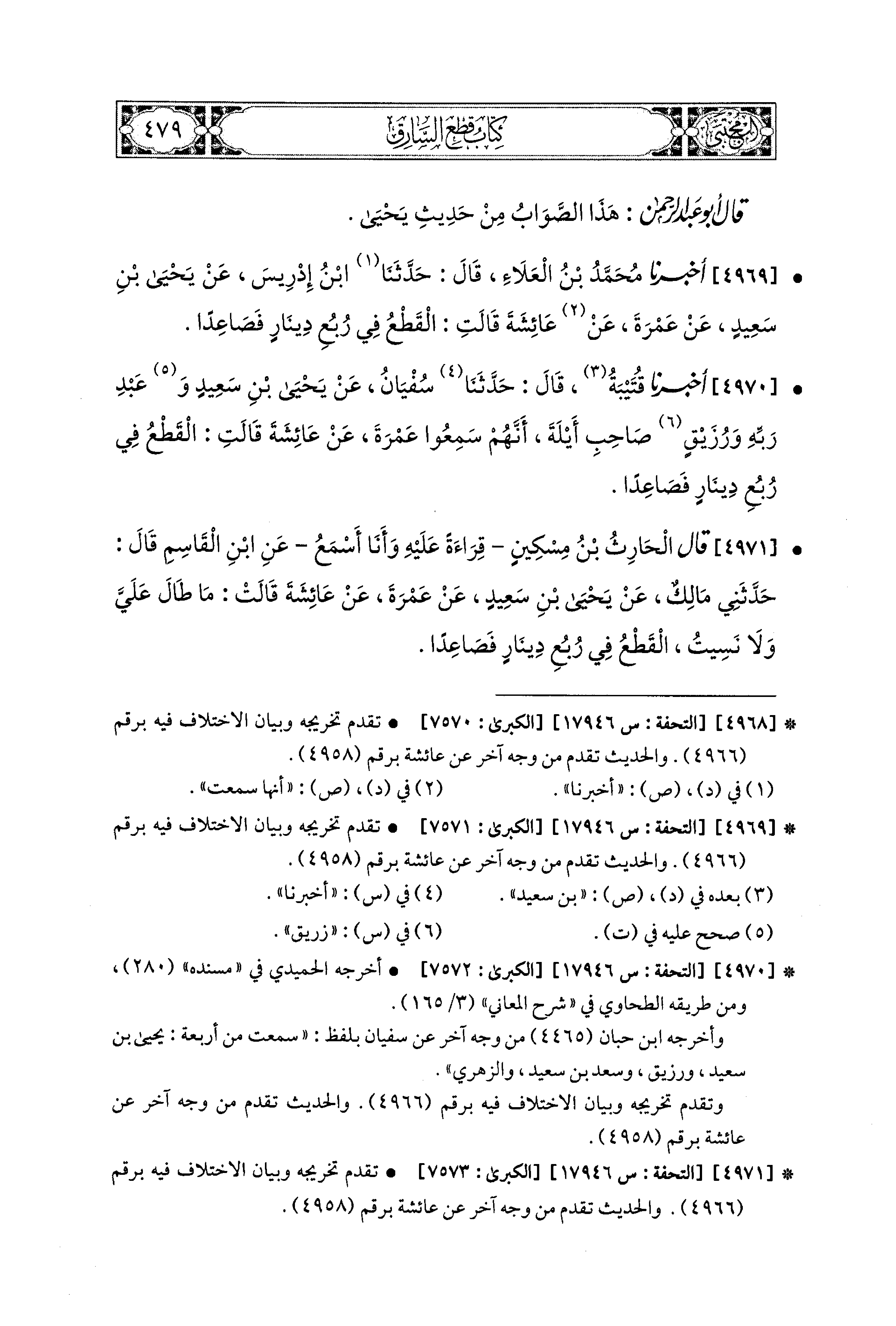 4969- أَخبَرَنا مُحَمد بْنُ العَلاَءِ، قال: حَدثنا ابْنُ إِدْرِيسَ، عَن يَحيَى بْنِ سَعيدٍ، عَن عَمْرَةَ، عَن عَائِشَةَ قَالَتْ: القَطْعُ فِي رُبْعِ دِينَارٍ فَصَاعِدًا.