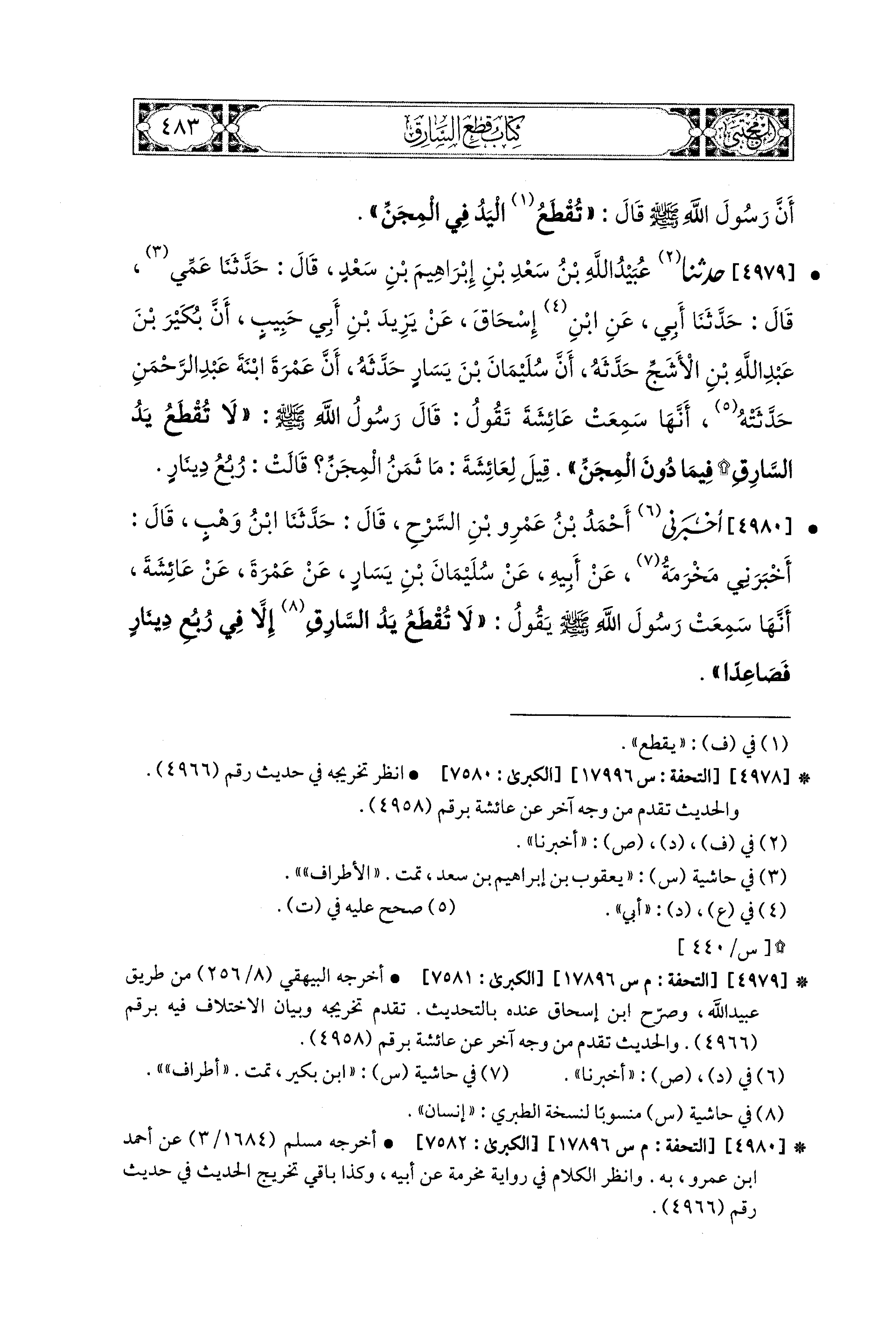 4980- أَخْبَرَني أَحْمَدُ بْنُ عَمْرِو بْنِ السَّرْحِ، قال: حَدثنا ابْنُ وَهْبٍ، قَالَ: أَخْبَرَني مَخْرَمَةُ، عَن أَبِيهِ، عَن سُلَيمَانَ بْنِ يَسَارٍ، عَن عَمْرَةَ، عَن عَائِشَةَ، أَنَّهَا سَمِعَتْ رَسُولَ اللهِ صَلى الله عَليه وسَلم يَقُولُ: لاَ تُقْطَعُ يَدُ السَّارِقِ إِلاَّ فِي رُبْعِ دِينَارٍ فَصَاعِدًا.
