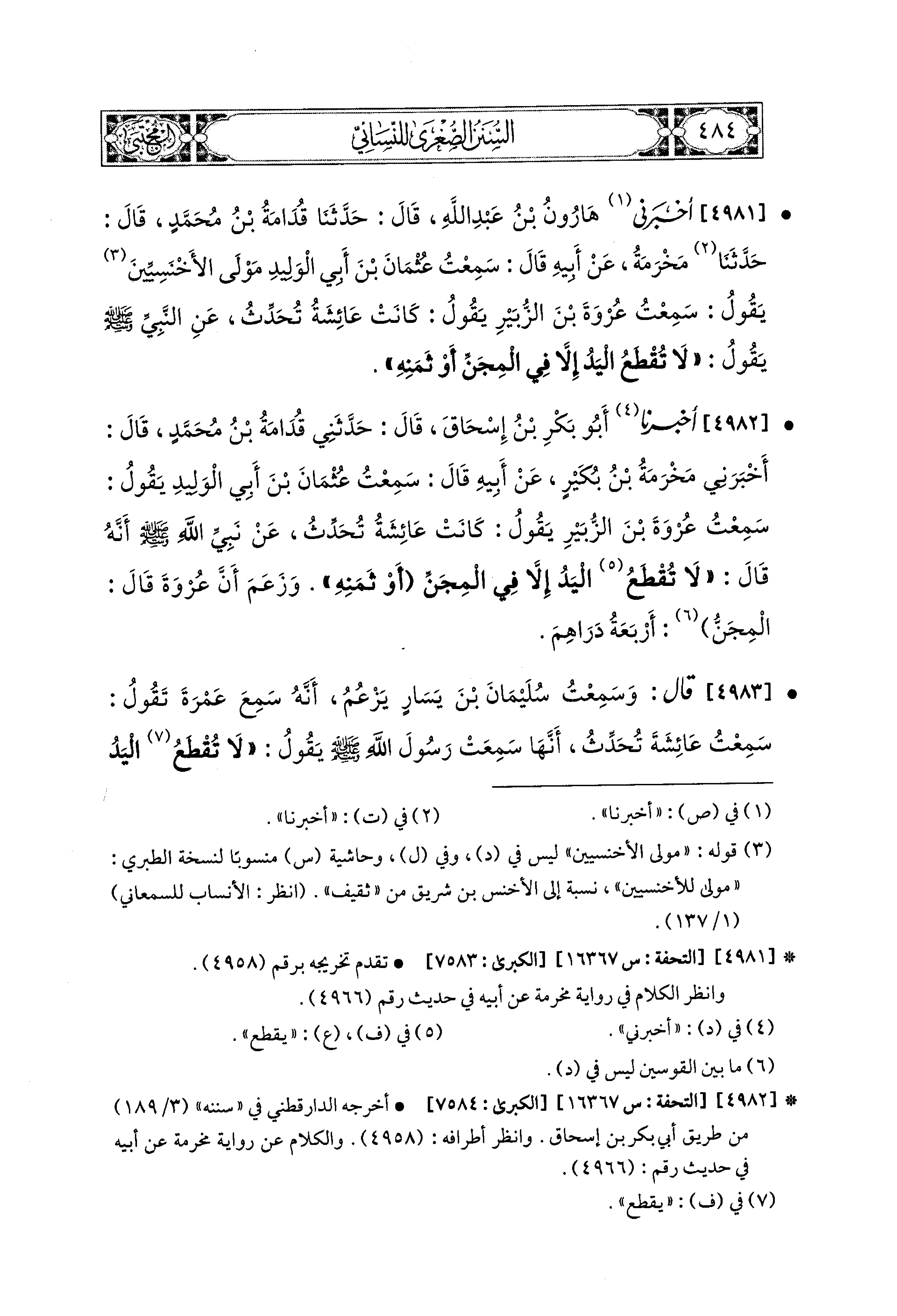 4981- أَخْبَرَني هَارُونُ بْنُ عَبدِ اللهِ، قال: حَدثنا قُدَامَةُ بْنُ مُحَمدٍ، قَالَ: حدثنا مَخْرَمَةُ، عَن أَبِيهِ، قَالَ: سَمِعْتُ عُثمَانَ بْنَ أَبِي الوَلِيدِ، مَوْلَى الأَخْنَسِيِّينَ يَقُولُ: سَمِعْتُ عُرْوَةَ بْنَ الزُّبَيْرِ يَقُولُ: كَانَتْ عَائِشَةُ تُحَدِّثُ عَنِ النَّبيِّ صَلى الله عَليه وسَلم يَقُولُ: لاَ تُقْطَعُ اليَدُ إِلاَّ فِي المِجَنِّ، أَوْ ثَمَنِهِ.