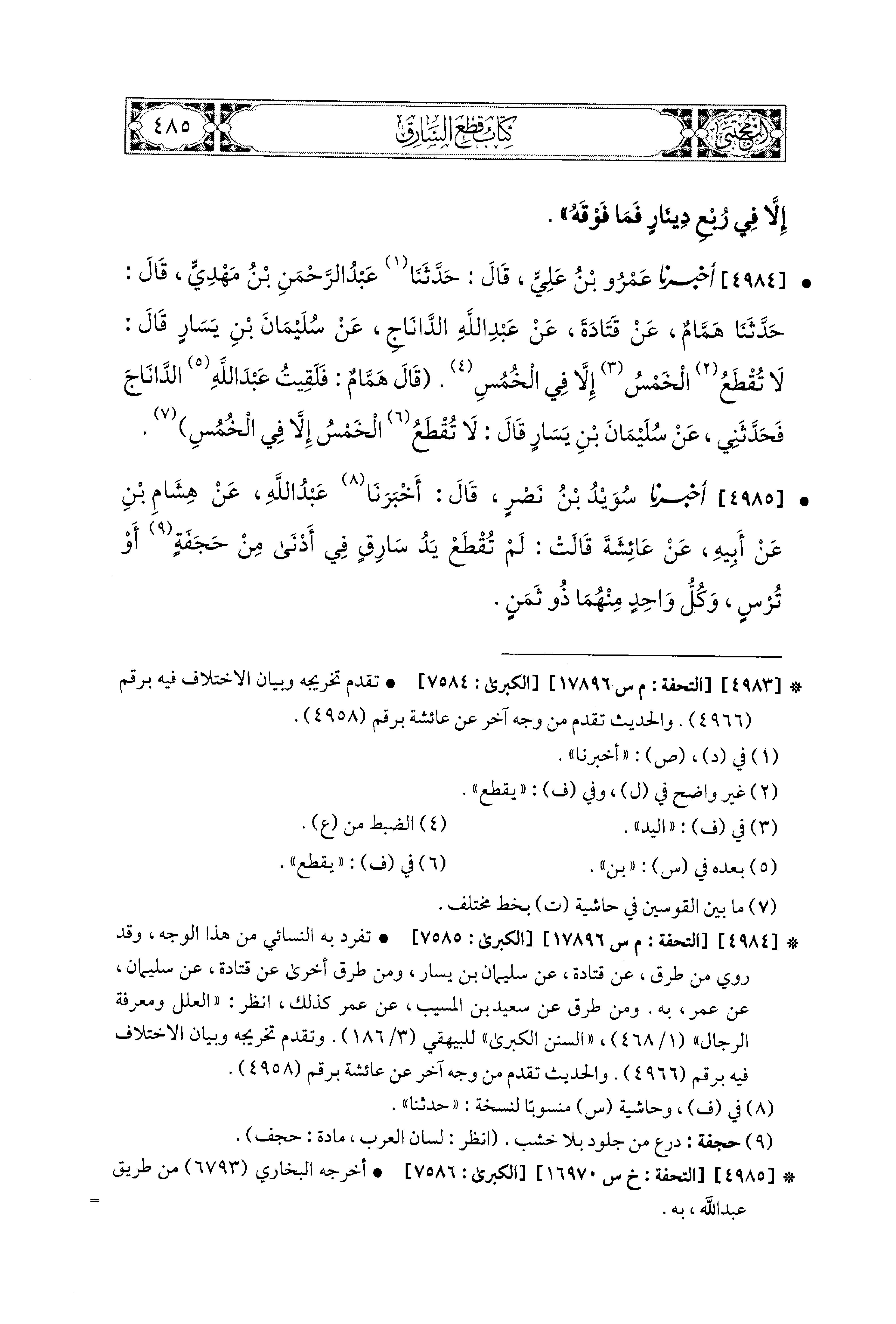 4984- أَخبَرَنا عَمْرُو بْنُ عَلِيٍّ، قال: حَدثنا عَبدُ الرَّحمَنِ بْنُ مَهْدِيٍّ، قال: حَدثنا هَمَّامٌ، عَن قَتَادَةَ، عَن عَبدِ اللهِ الدَّانَاجِ، عَن سُلَيمَانَ بْنِ يَسَارٍ قَالَ: لاَ تُقْطَعُ الخَمْسُ إِلاَّ فِي الخَمْسِ، قَالَ هَمَّامٌ: فَلَقِيتُ عَبدَ اللهِ الدَّانَاجَ، فَحَدَّثَني عَن سُلَيمَانَ بْنِ يَسَارٍ، قَالَ: لاَ تُقْطَعُ الخَمْسُ إِلاَّ فِي الخَمْسِ.