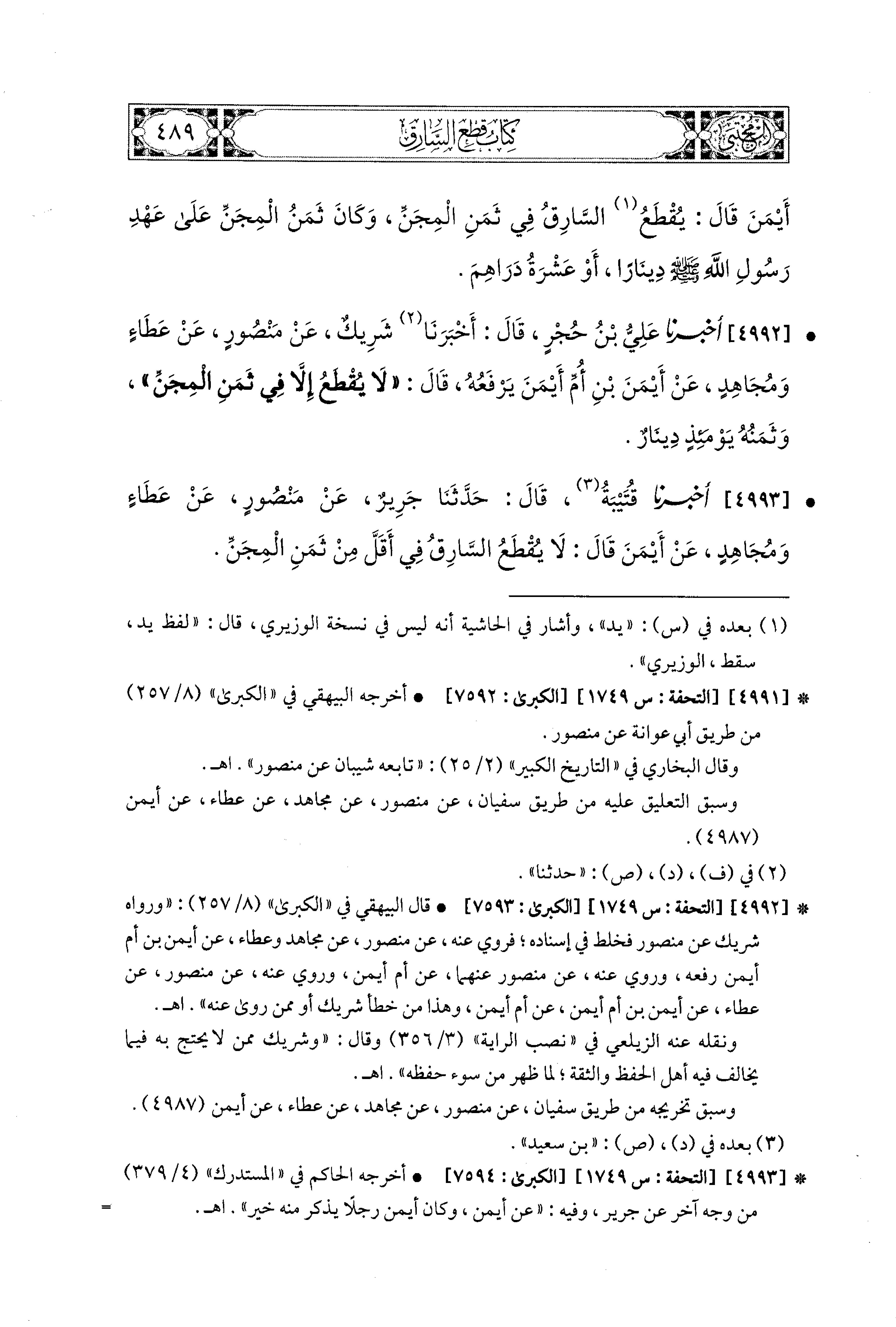 4993- أَخبَرَنا قُتَيبَةُ، قال: حَدثنا جَرِيرٌ، عَن مَنْصُورٍ، عَن عَطَاءٍ، وَمُجَاهِدٍ، عَن أَيْمَنَ قَالَ: لاَ يُقْطَعُ السَّارِقُ فِي أَقَلَّ مِنْ ثَمَنِ المِجَنِّ