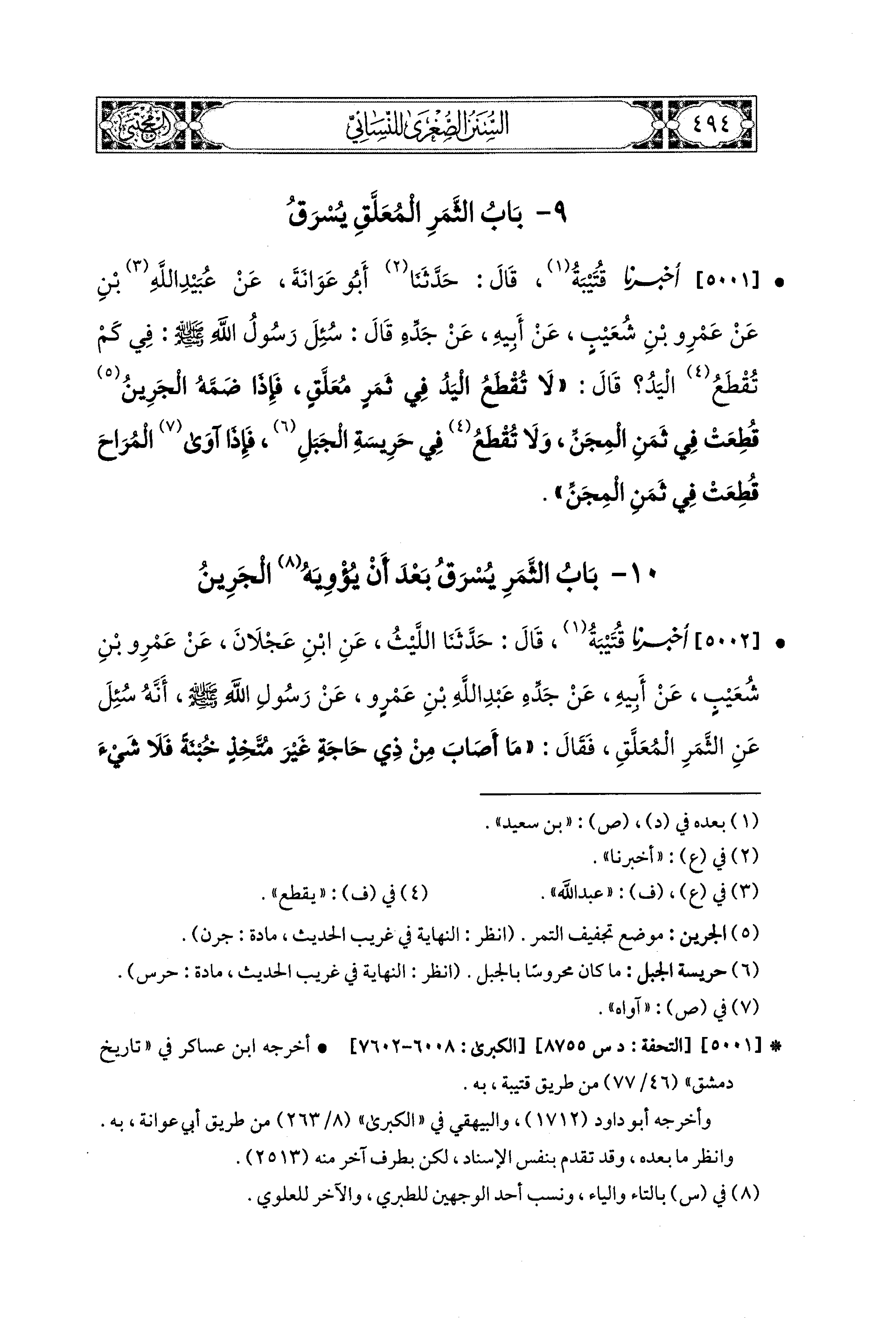 5001- أَخبَرَنا قُتَيبَةُ، قال: حَدثنا أَبو عَوَانَةَ، عَن عُبَيدِ اللهِ بْنِ الأَخْنَسِ (1)، عَن عَمْرِو بْنِ شُعَيبٍ، عَن أَبِيهِ، عَن جَدِّهِ، قَالَ: سُئِلَ رَسُولُ اللهِ صَلى الله عَليه وسَلم فِي كَمْ تُقْطَعُ اليَدُ؟ قَالَ: لاَ تُقْطَعُ اليَدُ فِي ثَمَرٍ مُعَلَّقٍ، فَإِذَا ضَمَّهُ الجَرِينُ قُطِعَتْ فِي ثَمَنِ المِجَنِّ، وَلاَ تُقْطَعُ فِي حَرِيسَةِ الجَبَلِ، فَإِذَا آوَى المُرَاحَ قُطِعَتْ فِي ثَمَنِ المِجَنِّ.