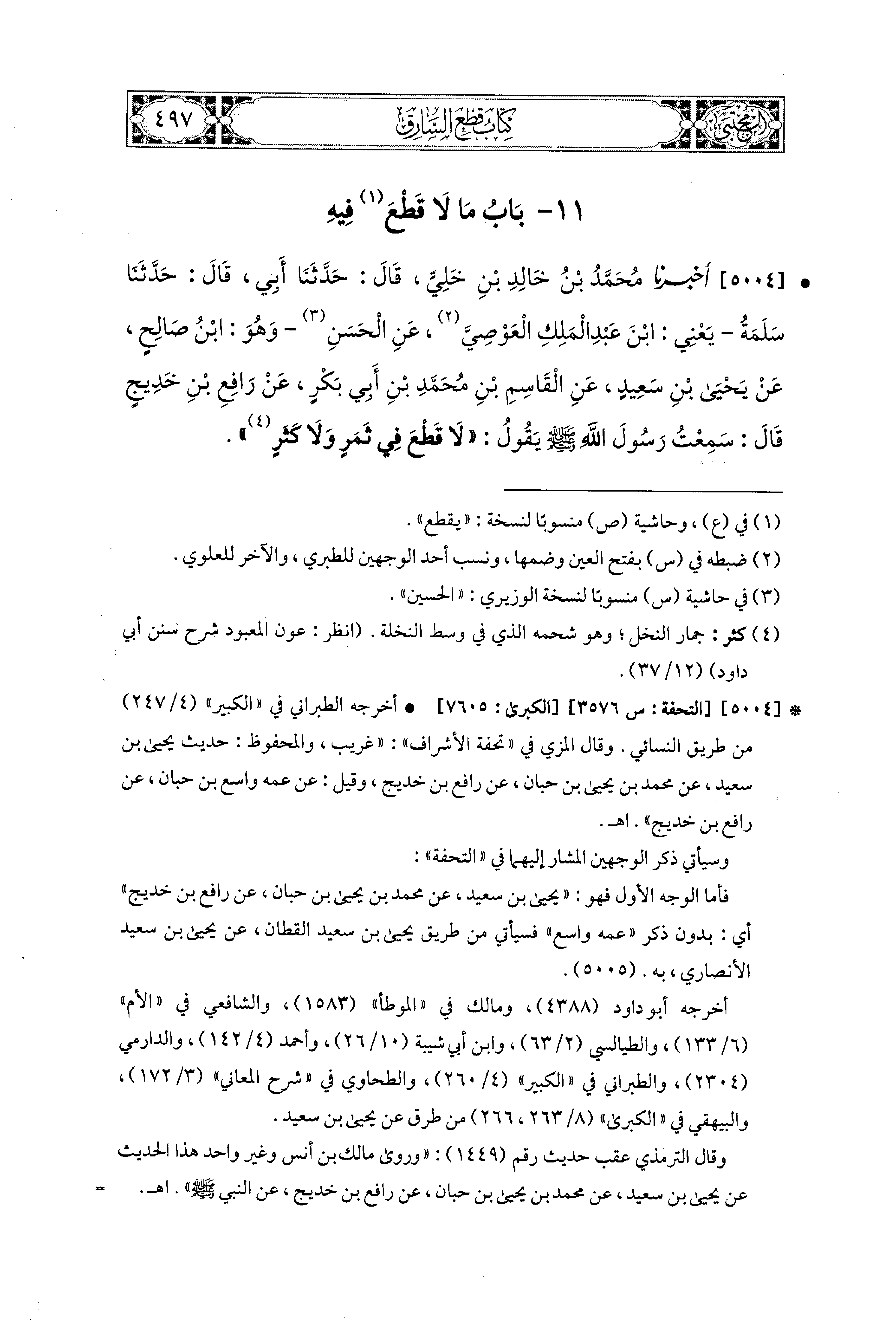 5004- أَخبَرَنا مُحَمد بْنُ خَالِدِ بْنِ خَلِيٍّ، قال: حَدثنا أَبِي، قال: حَدثنا سَلَمَةُ، يَعْني ابْنَ عَبدِ المَلِكِ العَوْصِيَّ، عَنِ الحَسَنِ، وَهُوَ ابْنُ صَالِحٍ، عَن يَحيَى بْنِ سَعيدٍ، عَنِ القَاسِمِ بْنِ مُحَمدِ بْنِ أَبِي بَكْرٍ، عَن رَافِعِ بْنِ خَدِيجٍ، قَالَ: سَمِعْتُ رَسُولَ اللهِ صَلى الله عَليه وسَلم يَقُولُ: لاَ قَطْعَ فِي ثَمَرٍ وَلاَ كَثَرٍ.