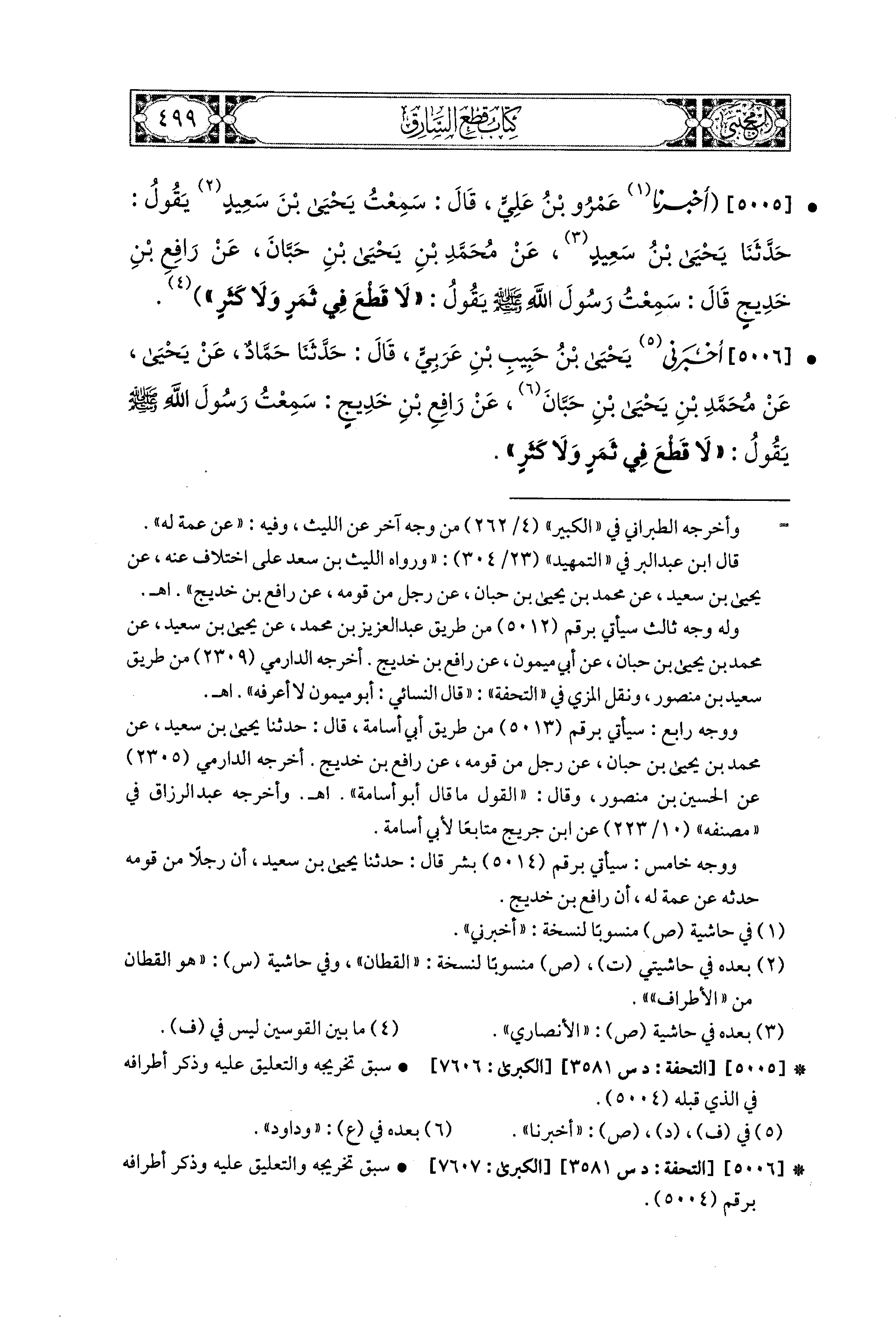5006- أَخْبَرَني يَحيَى بْنُ حَبِيبِ بْنِ عَرَبِيٍّ، قال: حَدثنا حَمَّادٌ، عَن يَحيَى، عَن مُحَمدِ بْنِ يَحيَى بْنِ حَبَّانَ، عَن رَافِعِ بْنِ خَدِيجٍ، سَمِعْتُ رَسُولَ اللهِ صَلى الله عَليه وسَلم يَقُولُ: لاَ قَطْعَ فِي ثَمَرٍ وَلاَ كَثَرٍ.
