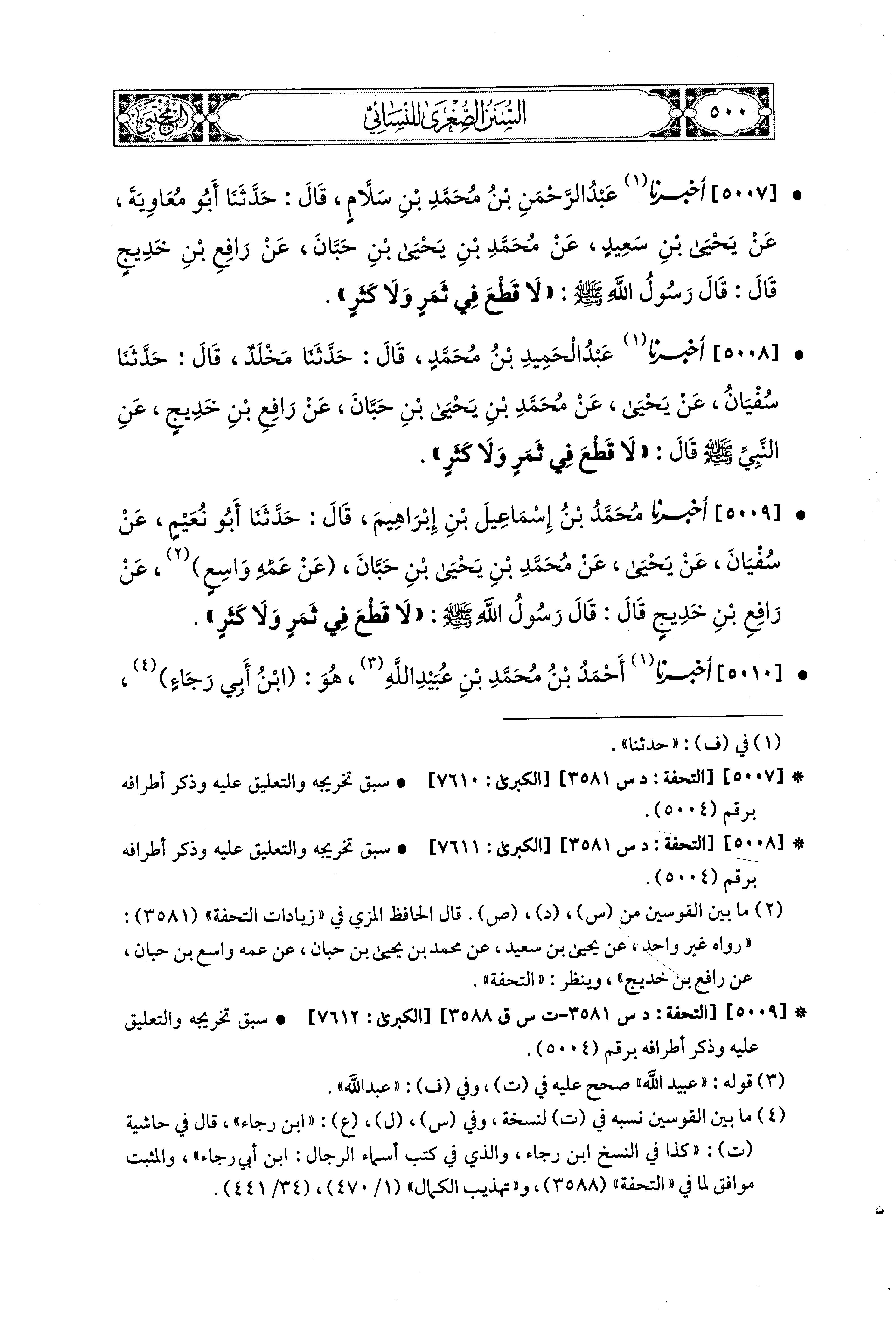5009- أَخبَرَنا مُحَمد بْنُ إِسماعِيلَ بْنِ إِبراهِيمَ، قال: حَدثنا أَبو نُعَيْمٍ، عَن سُفْيَانَ، عَن يَحيَى، عَن مُحَمدِ بْنِ يَحيَى بْنِ حَبَّانَ، عَن رَافِعِ بْنِ خَدِيجٍ(1) قَالَ: قَالَ رَسُولُ اللهِ صَلى الله عَليه وسَلم: لاَ قَطْعَ فِي ثَمَرٍ وَلاَ كَثَرٍ.