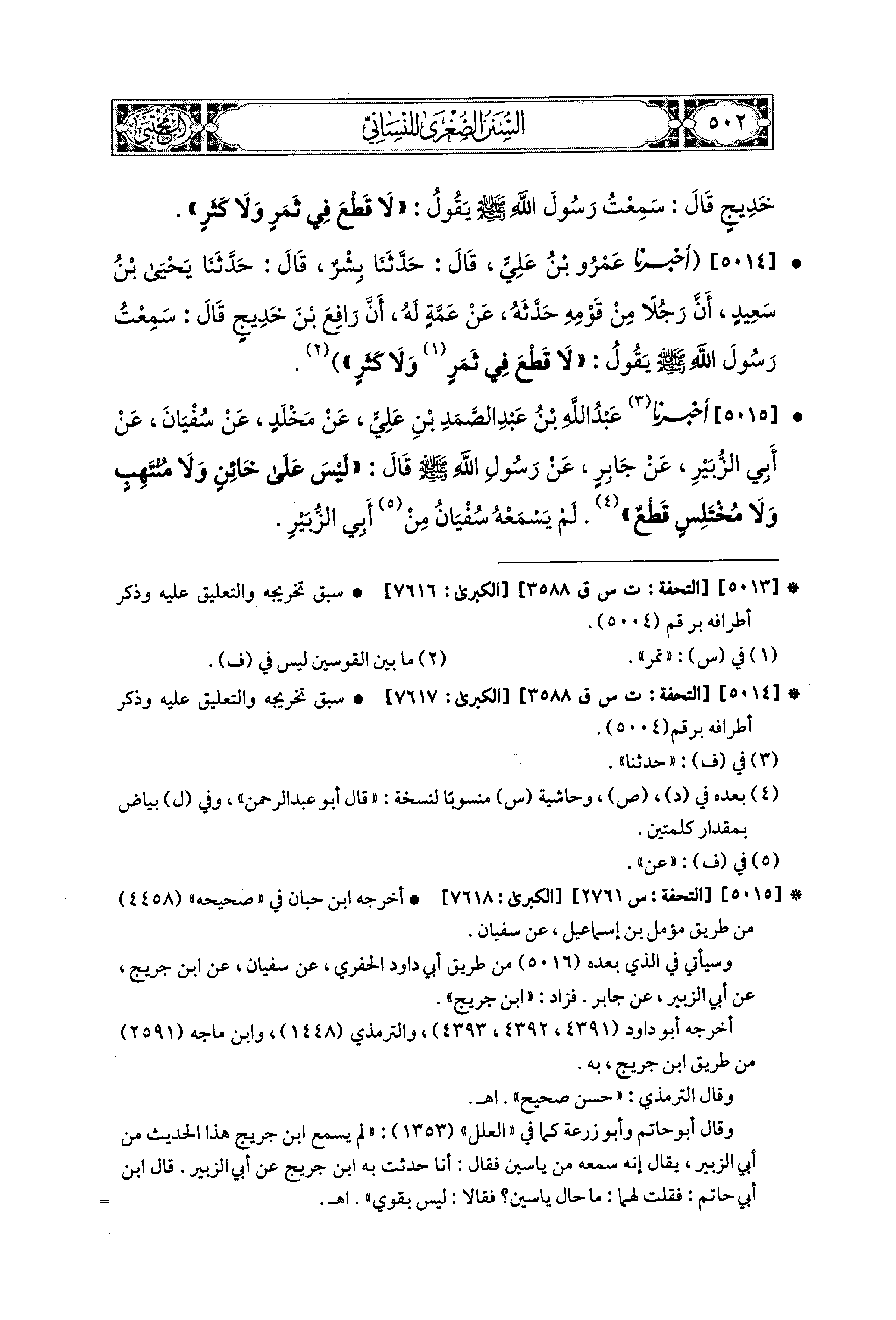 5015- أَخبَرَنا عَبدُ اللهِ بْنُ عَبدِ الصَّمَدِ بْنِ عَلِيٍّ، عَن مَخْلَدٍ، عَن سُفْيَانَ، عَن أَبِي الزُّبَيْرِ، عَن جَابِرٍ، عَن رَسُولِ اللهِ صَلى الله عَليه وسَلم قَالَ: لَيْسَ عَلَى خَائِنٍ وَلاَ مُنْتَهِبٍ، وَلاَ مُخْتَلِسٍ قَطْعٌ.