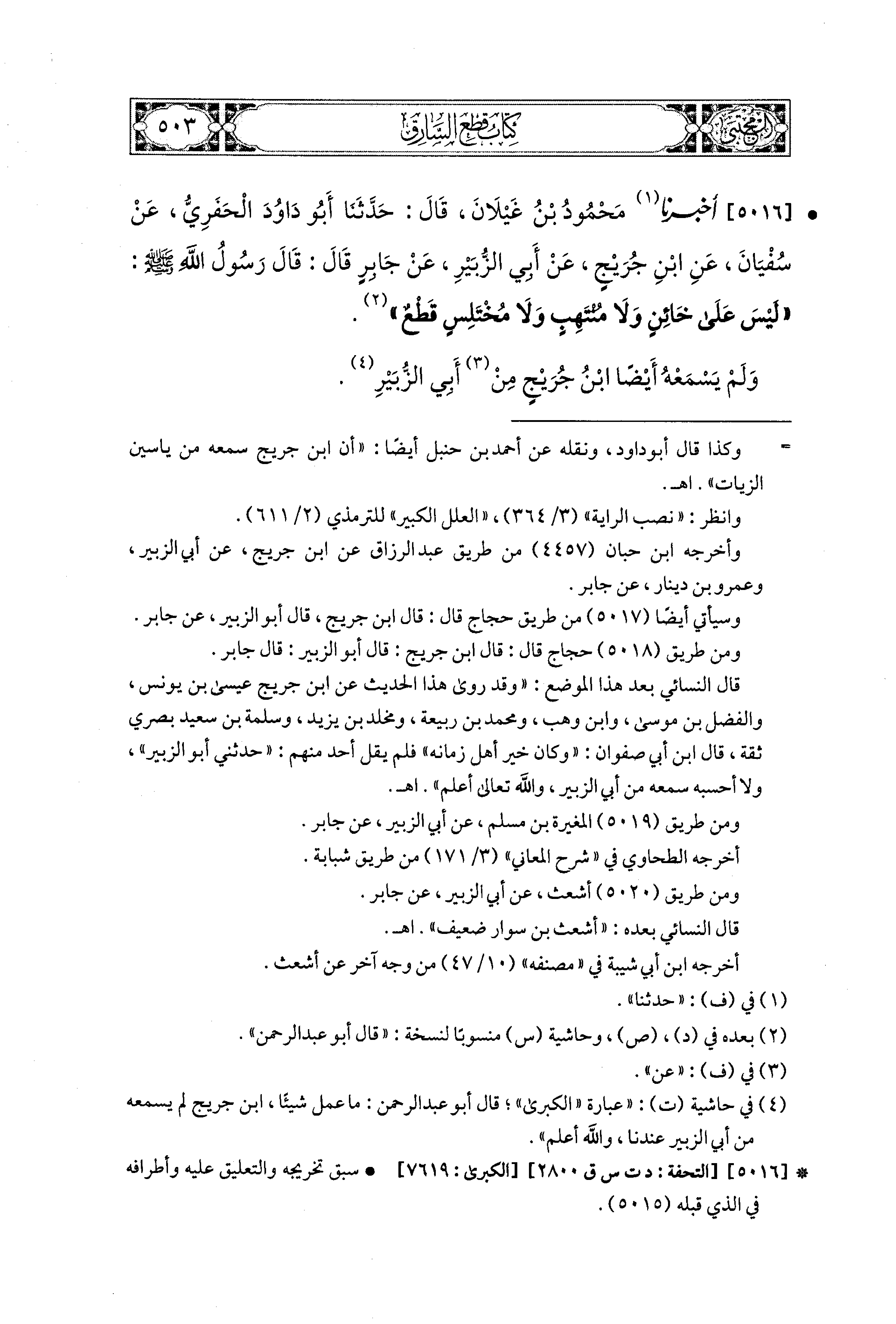 5016- أَخبَرَنا مَحْمُودُ بْنُ غَيْلاَنَ، قال: حَدثنا أَبو دَاوُدَ الحَفَرِيُّ، عَن سُفْيَانَ، عَنِ ابنِ جُرَيْجٍ، عَن أَبِي الزُّبَيْرِ، عَن جَابِرٍ قَالَ: قَالَ رَسُولُ اللهِ صَلى الله عَليه وسَلم: لَيْسَ عَلَى خَائِنٍ، وَلاَ مُنْتَهِبٍ، وَلاَ مُخْتَلِسٍ قَطْعٌ.