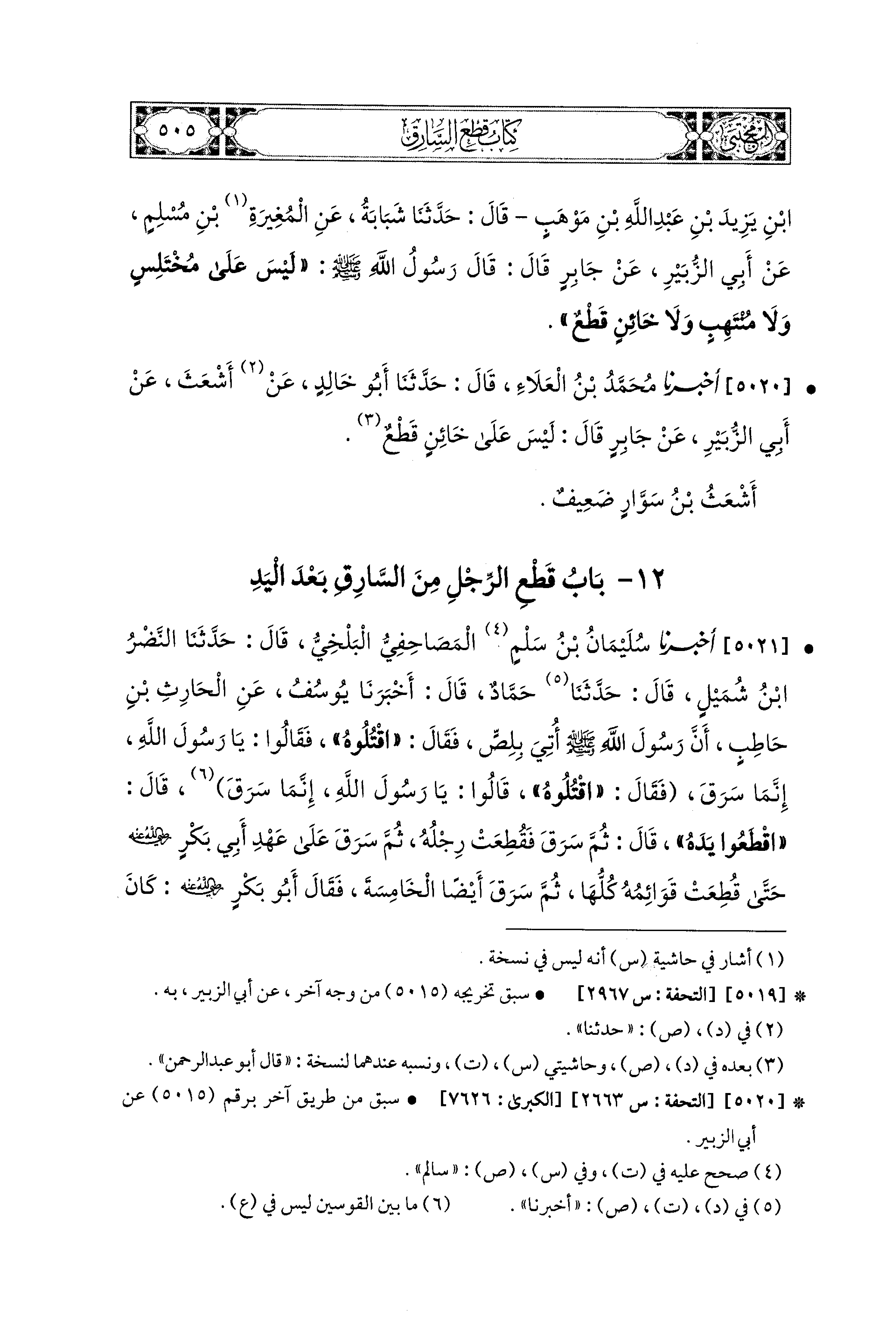 5020- أَخبَرَنا مُحَمد بْنُ العَلاَءِ، قال: حَدثنا أَبو خَالِدٍ، عَن أَشْعَثَ، عَن أَبِي الزُّبَيْرِ، عَن جَابِرٍ قَالَ: لَيْسَ عَلَى خَائِنٍ قَطْعٌ.
