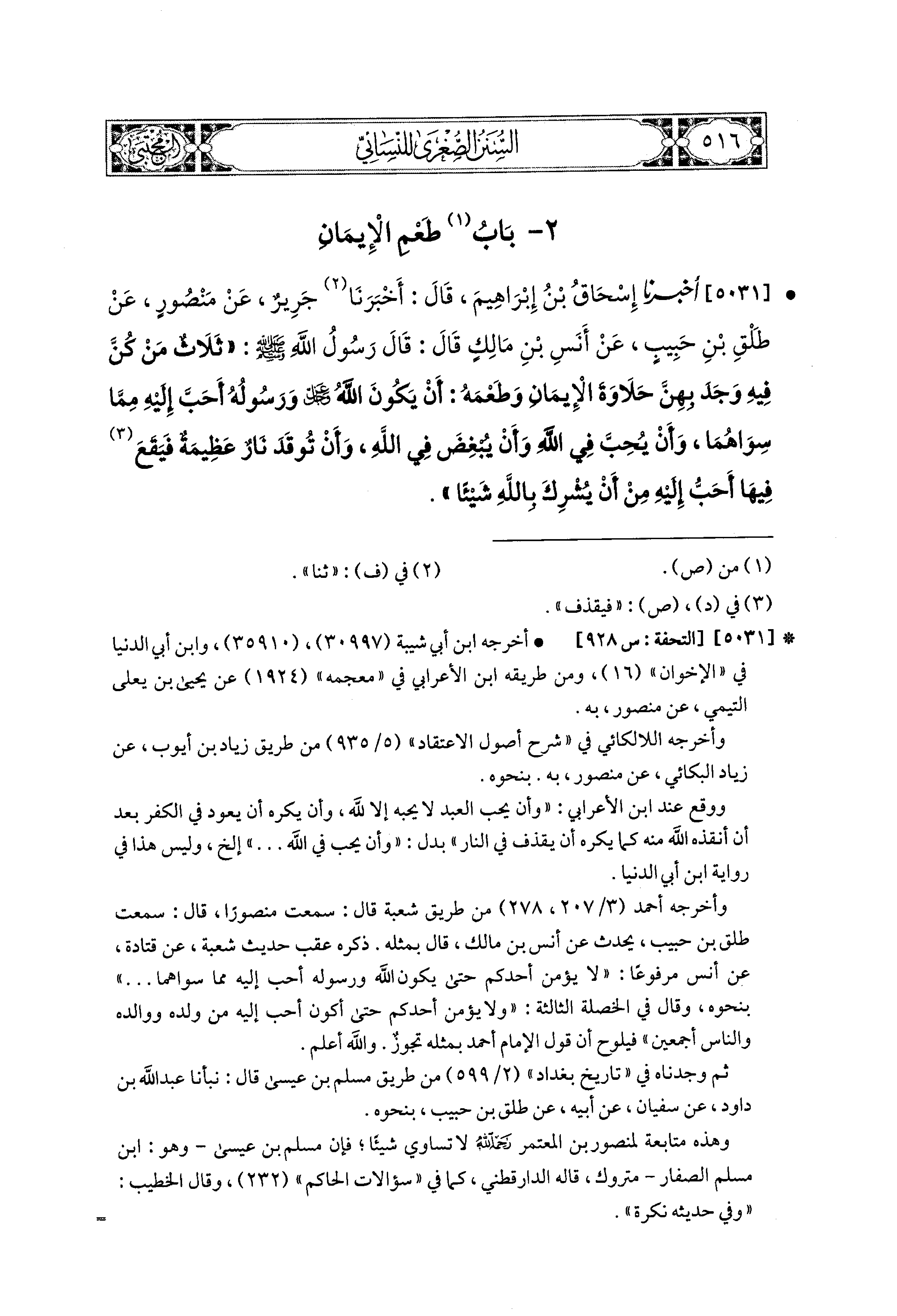 5031- أَخبَرَنا إِسحَاقُ بْنُ إِبراهِيمَ، قَالَ: أَخبَرنا جَرِيرٌ، عَن مَنْصُورٍ، عَن طَلْقِ بْنِ حَبِيبٍ، عَن أَنَسِ بْنِ مَالِكٍ قَالَ: قَالَ رَسُولُ اللهِ صَلى الله عَليه وسَلم: ثَلاَثٌ مَنْ كُنَّ فِيهِ وَجَدَ بِهِنَّ حَلاَوَةَ الإِيمَانِ وَطَعْمَهُ: أَنْ يَكُونَ اللهُ عَزَّ وَجَلَّ وَرَسُولُهُ أَحَبَّ إِلَيْهِ مِمَّا سِوَاهُمَا، وَأَنْ يُحِبَّ فِي اللهِ، وَأَنْ يُبْغِضَ فِي اللهِ، وَأَنْ تُوقَدَ نَارٌ عَظِيمَةٌ فَيَقَعَ فِيهَا أَحَبَّ إِلَيْهِ مِنْ أَنْ يُشْرِكَ بِالله شَيْئًا.