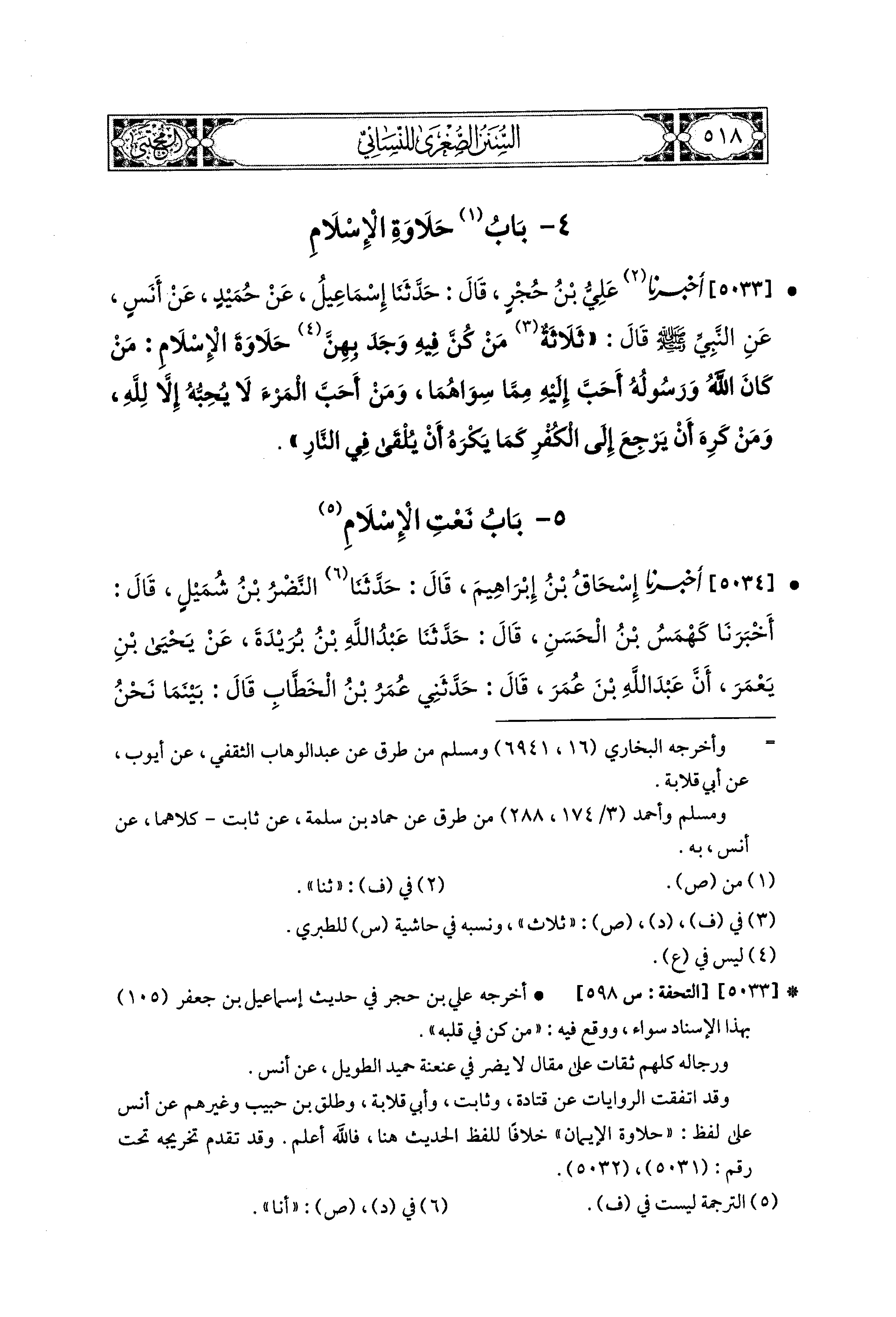 5033- أَخبَرَنا عَلِيُّ بْنُ حُجْرٍ، قال: حَدثنا إِسماعِيلُ، عَن حُمَيْدٍ، عَن أَنَسٍ، عَنِ النَّبيِّ صَلى الله عَليه وسَلم قَالَ: ثَلاَثٌ مَنْ كُنَّ فِيهِ وَجَدَ بِهِنَّ حَلاَوَةَ الإِسْلاَمِ: مَنْ كَانَ اللهُ وَرَسُولُهُ أَحَبَّ إِلَيْهِ مِمَّا سِوَاهُمَا، وَمَنْ أَحَبَّ المَرْءَ لاَ يُحِبُّهُ إِلاَّ لِلَّهِ، وَمَنْ كْرِهَ أَنْ يَرْجِعَ إِلَى الكُفْرِ كَمَا يَكْرَهُ أَنْ يُلْقَى فِي النَّارِ.