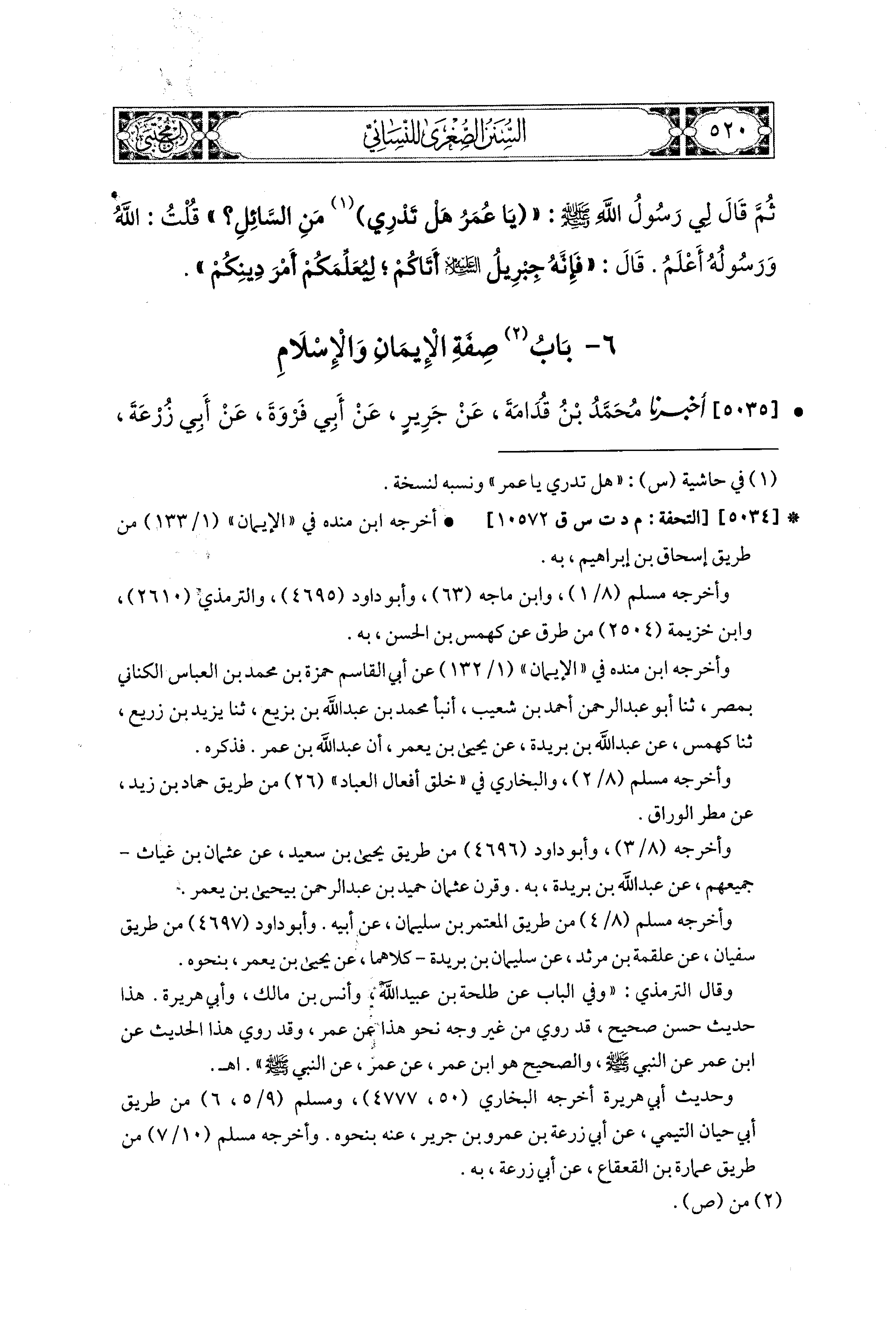 5035- أَخبَرَنا مُحَمد بْنُ قُدَامَةَ، عَن جَرِيرٍ، عَن أَبِي فَرْوَةَ، عَن أَبِي زُرْعَةَ، عَن أَبِي هُرَيرَةَ، وَأَبِي ذَرٍّ، قَالاَ: كَانَ رَسُولُ اللهِ صَلى الله عَليه وسَلم يَجْلِسُ بَيْنَ ظَهْرَانَيْ أَصْحَابِهِ، فَيَجِيءُ الغَرِيبُ فَلاَ يَدْرِي أَيُّهُمْ هُوَ حَتَّى يَسْأَلَ، فَطَلَبْنَا إِلَى رَسُولِ اللهِ صَلى الله عَليه وسَلم أَنْ نَجْعَلَ لَهُ مَجْلِسًا يَعْرِفُهُ الغَرِيبُ إِذَا أَتَاهُ، فَبَنَيْنَا لَهُ دُكَّانًا مِنْ طِينٍ، كَانَ يَجْلِسُ عَلَيْهِ، وَإِنَّا لَجُلُوسٌ وَرَسُولُ اللهِ صَلى الله عَليه وسَلم فِي مَجْلِسِهِ، إِذْ أَقْبَلَ رَجُلٌ أَحْسَنُ النَّاسِ وَجْهًا، وَأَطْيَبُ النَّاسِ رِيحًا، كَأَنَّ ثِيَابَهُ لَمْ يَمَسَّهَا دَنَسٌ، حَتَّى سَلَّمَ فِي طَرَفِ البِسَاطِ، فَقَالَ: السَّلاَمُ عَلَيْكَ يَا مُحَمدُ، فَرَدَّ عَلَيْهِ السَّلاَمُ، قَالَ: أَدْنُو يَا مُحَمدُ؟ قَالَ: ادْنُهْ، فَمَا زَالَ يَقُولُ: أَدْنُو مِرَارًا، وَيَقُولُ لَهُ: ادْنُ، حَتَّى وَضَعَ يَدَهُ عَلَى رُكْبَتَيْ رَسُولِ اللهِ صَلى الله عَليه وسَلم قَالَ: يَا مُحَمدُ، أَخْبِرْني مَا الإِسْلاَمُ؟ قَالَ: الإِسْلاَمُ أَنْ تَعْبُدَ اللهَ، وَلاَ تُشْرِكَ بِهِ شَيْئًا، وَتُقِيمَ الصَّلاَةَ، وَتُؤْتِيَ الزَّكَاةَ، وَتَحُجَّ البَيْتَ،