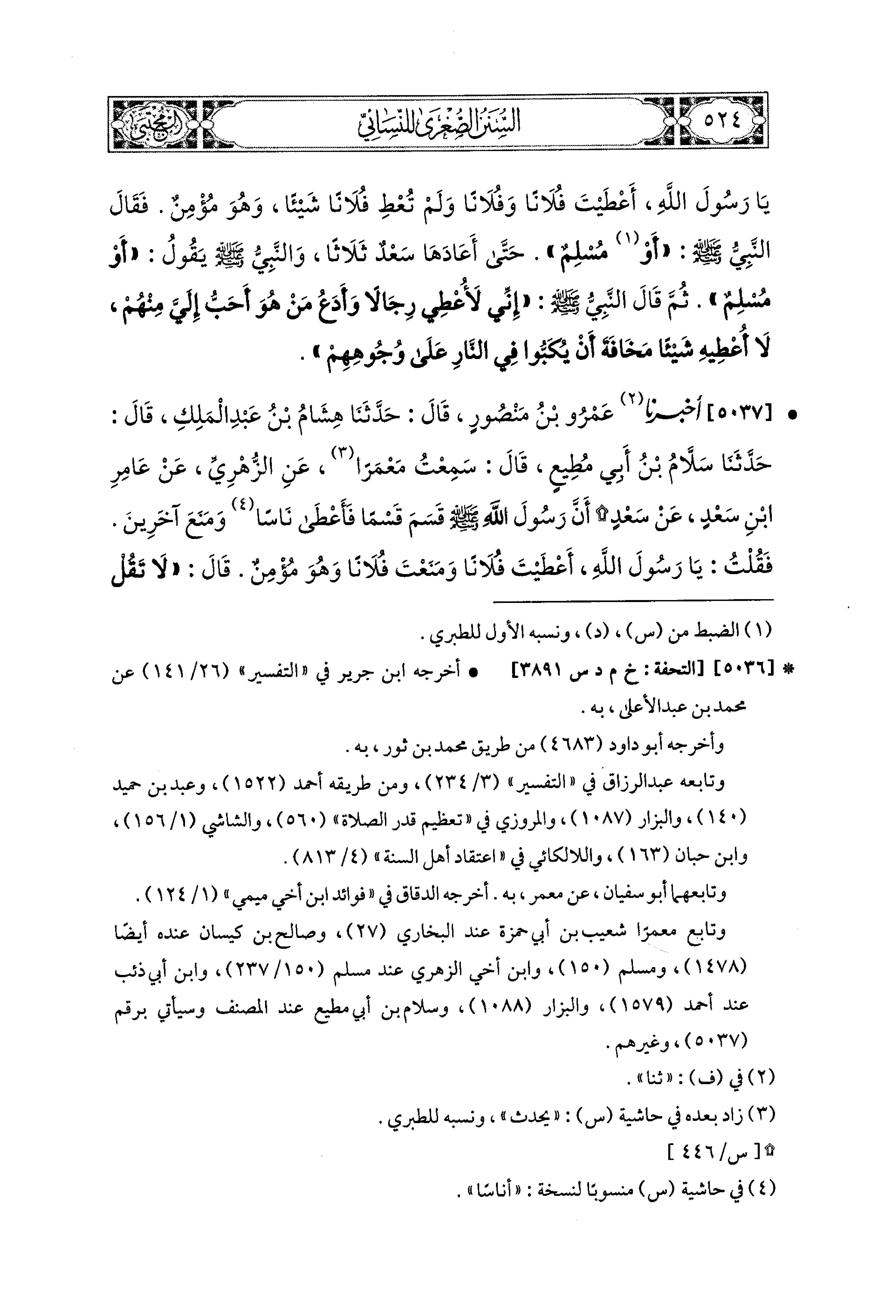 5037- أَخبَرَنا عَمْرُو بْنُ مَنْصُورٍ، قال: حَدثنا هِشَامُ بْنُ عَبدِ المَلِكِ، قال: حَدثنا سَلاَّمُ بْنُ أَبِي مُطِيعٍ، قَالَ: سَمِعْتُ مَعْمَرًا، عَنِ الزُّهْرِيِّ، عَن عَامِرِ بْنِ سَعْدٍ، عَن سَعْدٍ، أَنَّ رَسُولَ اللهِ صَلى الله عَليه وسَلم قَسَمَ قَسْمًا، فَأَعْطَى نَاسًا، وَمَنَعَ آخَرِينَ، فَقُلْتُ: يَا رَسُولَ اللهِ، أَعْطَيْتَ فُلاَنًا، وَمَنَعْتَ فُلاَنًا، وَهُوَ مُؤْمِنٌ؟ قَالَ: لاَ تَقُلْ مُؤْمِنٌ، وَقُلْ مُسْلِمٌ، قَالَ: وقال ابْنُ شِهَابٍ: {قَالَتِ الأَعْرَابُ آمَنَّا}.