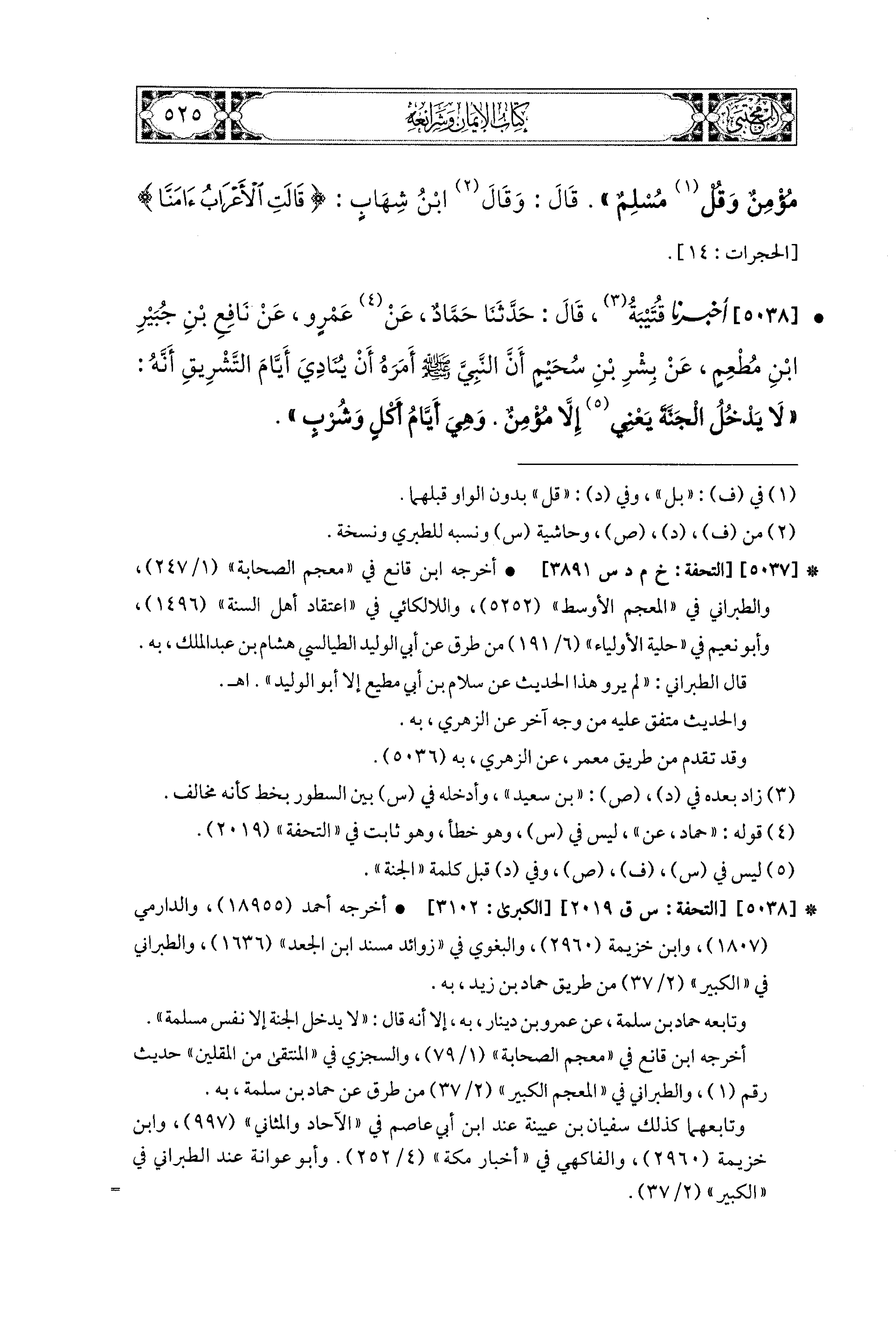 5038- أَخبَرَنا قُتَيبَةُ، قال: حَدثنا حَمَّادٌ، عَن عَمْرٍو، عَن نَافِعِ بْنِ جُبَيْرِ بْنِ مُطْعِمٍ، عَن بِشْرِ بْنِ سُحَيْمٍ؛ أَنَّ النَّبيَّ صَلى الله عَليه وسَلم أَمَرَهُ أَنْ يُنَادِيَ أَيَّامَ التَّشْرِيقِ؛ أَنَّهُ لاَ يَدْخُلُ الجَنَّةَ -يعني- إِلاَّ مُؤْمِنٌ، وَهِيَ أَيَّامُ أَكْلٍ وَشُرْبٍ.