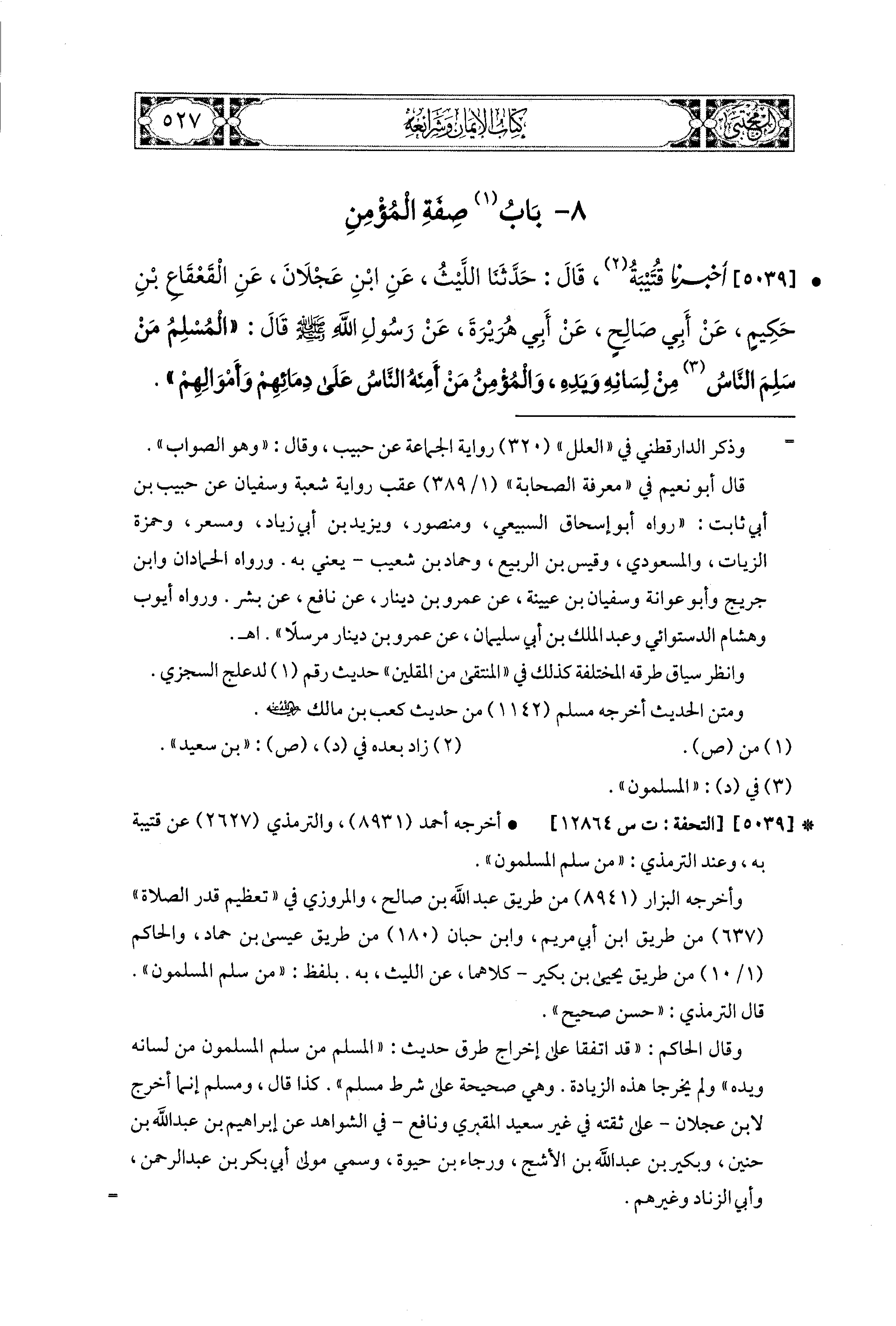 5039- أَخبَرَنا قُتَيبَةُ، قال: حَدثنا اللَّيْثُ، عَنِ ابنِ عَجْلاَنَ، عَنِ القَعْقَاعِ بْنِ حَكِيمٍ، عَن أَبِي صَالِحٍ، عَن أَبِي هُرَيرَةَ، عَن رَسُولِ اللهِ صَلى الله عَليه وسَلم قَالَ: المُسْلِمُ مَنْ سَلِمَ النَّاسُ مِنْ لِسَانِهِ وَيَدِهِ، وَالمُؤْمِنُ مَنْ أَمِنَهُ النَّاسُ عَلَى دِمَائِهِمْ وَأَمْوَالِهِمْ.