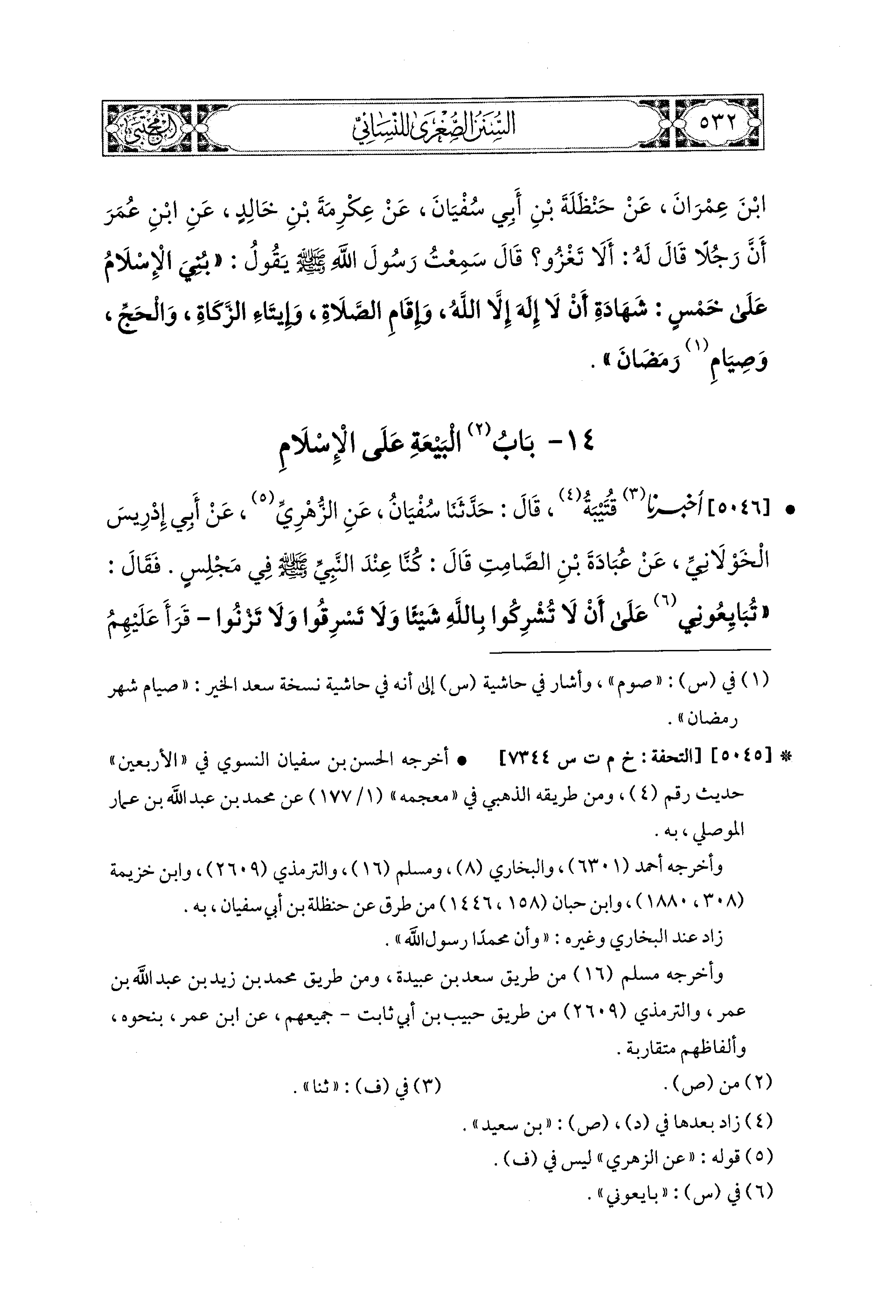 5046- أَخبَرَنا قُتَيبَةُ، قال: حَدثنا سُفْيَانُ، عَنِ الزُّهْرِيِّ، عَن أَبِي إِدْرِيسَ الخَوْلاَنيِّ، عَن عُبَادَةَ بْنِ الصَّامِتِ قَالَ: كُنَّا عِنْدَ النَّبيِّ صَلى الله عَليه وسَلم فِي مَجْلِسٍ، فَقَالَ: تُبَايِعُوني عَلَى أَنْ لاَ تُشْرِكُوا بِالله شَيْئًا، وَلاَ تَسْرِقُوا، وَلاَ تَزْنُوا، قَرَأَ عَلَيْهِمُ الآيَةَ، فَمَنْ وَفَّى مِنْكُمْ فَأَجْرُهُ عَلَى اللهِ، وَمَنْ أَصَابَ مِنْ ذَلِكَ شَيْئًا فَسَتَرَهُ اللهُ عَزَّ وَجَلَّ عليه، فَهُوَ إِلَى اللهِ إِنْ شَاءَ عَذَّبَهُ وَإِنْ شَاءَ غَفَرَ لَهُ.