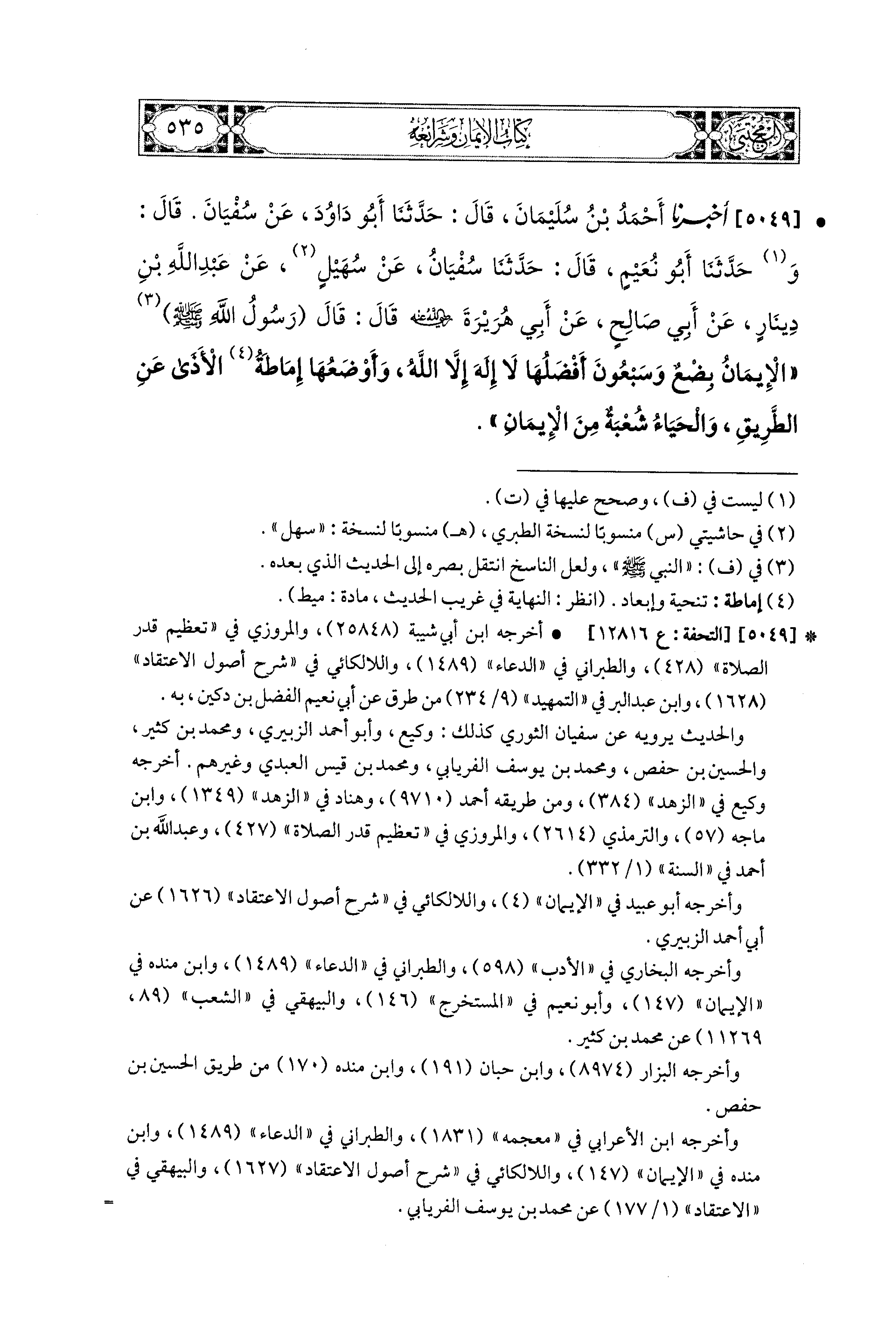 5049- أَخبَرَنا أَحْمَدُ بْنُ سُلَيمَانَ، قال: حَدثنا أَبو دَاوُدَ، عَن سُفْيَانَ، قَالَ: وحَدَّثَنَا أَبو نُعَيْمٍ، قال: حَدثنا سُفْيَانُ، عَن سُهَيْلٍ، عَن عَبد اللهِ بن دِينَارٍ، عَن أَبِي صَالِحٍ، عَن أَبِي هُرَيرَةَ رضي الله عنه, قَالَ: قَالَ رَسُولُ اللهِ صَلى الله عَليه وسَلم: الإِيمَانُ بِضْعٌ وَسَبْعُونَ، أَفْضَلُهَا لاَ إِلَهَ إِلاَّ اللهُ، وَأَوْضَعُهَا إِمَاطَةُ الأَذَى عَنِ الطَّرِيقِ، وَالحَيَاءُ شُعْبَةٌ مِنَ الإِيمَانِ.
