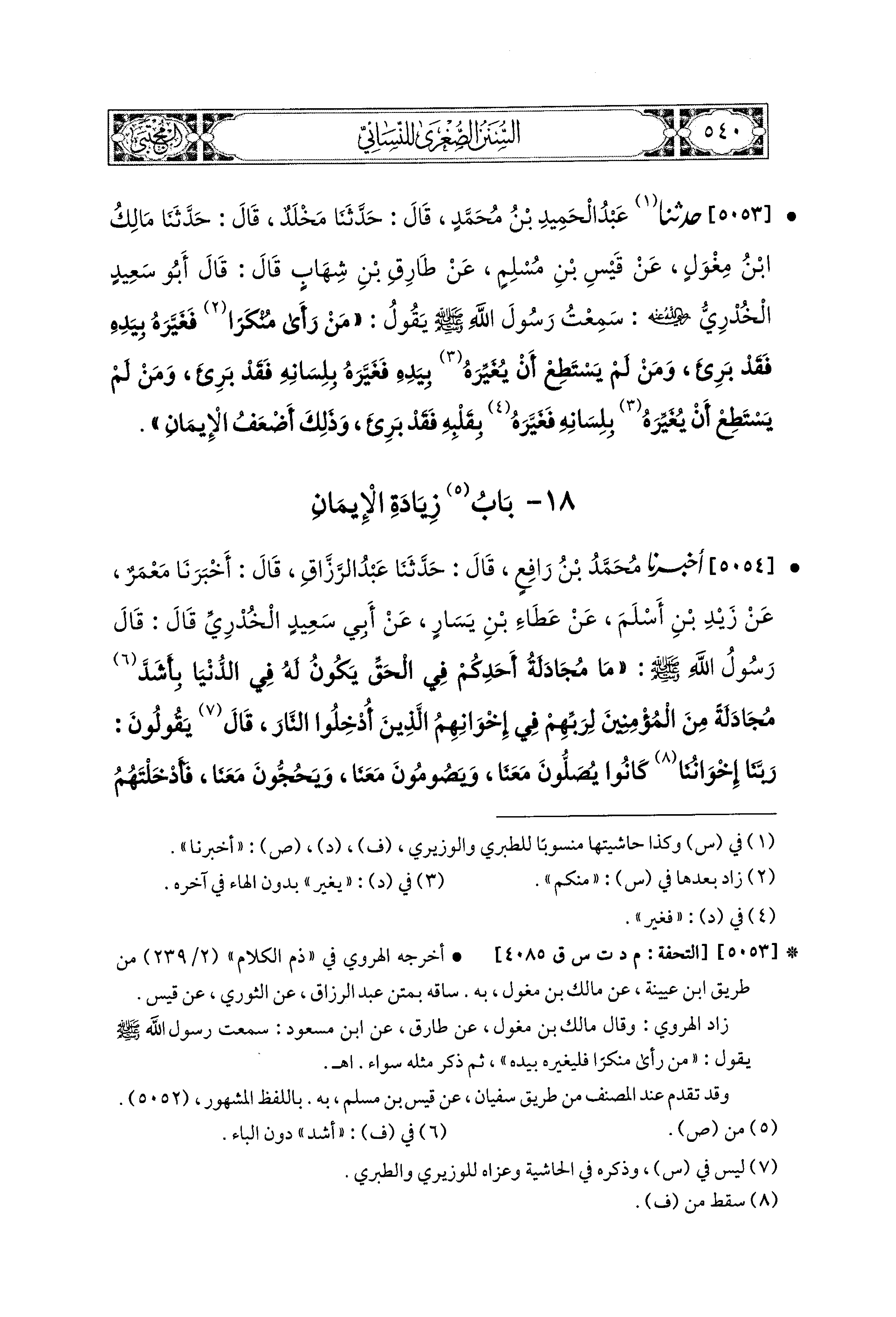 5053- حَدَّثَنَا عَبدُ الحَميدِ بْنُ مُحَمدٍ، قال: حَدثنا مَخْلَدٌ، قال: حَدثنا مَالِكُ بْنُ مِغْوَلٍ، عَن قَيْسِ بْنِ مُسْلِمٍ، عَن طَارِقِ بْنِ شِهَابٍ قَالَ: قَالَ أَبو سَعيدٍ الخُدْرِيُّ رضي الله عنه, سَمِعْتُ رَسُولَ اللهِ صَلى الله عَليه وسَلم يَقُولُ: مَنْ رَأَى مُنْكَرًا فَغَيَّرَهُ بِيَدِهِ فَقَدْ بَرِئَ، وَمَنْ لَمْ يَسْتَطِعْ أَنْ يُغَيِّرَهُ بِيَدِهِ، فَغَيَّرَهُ بِلِسَانِهِ فَقَدْ بَرِئَ، وَمَنْ لَمْ يَسْتَطِعْ أَنْ يُغَيِّرَهُ بِلِسَانِهِ، فَغَيَّرَهُ بِقَلْبِهِ فَقَدْ بَرِئَ، وَذَلِكَ أَضْعَفُ الإِيمَانِ.