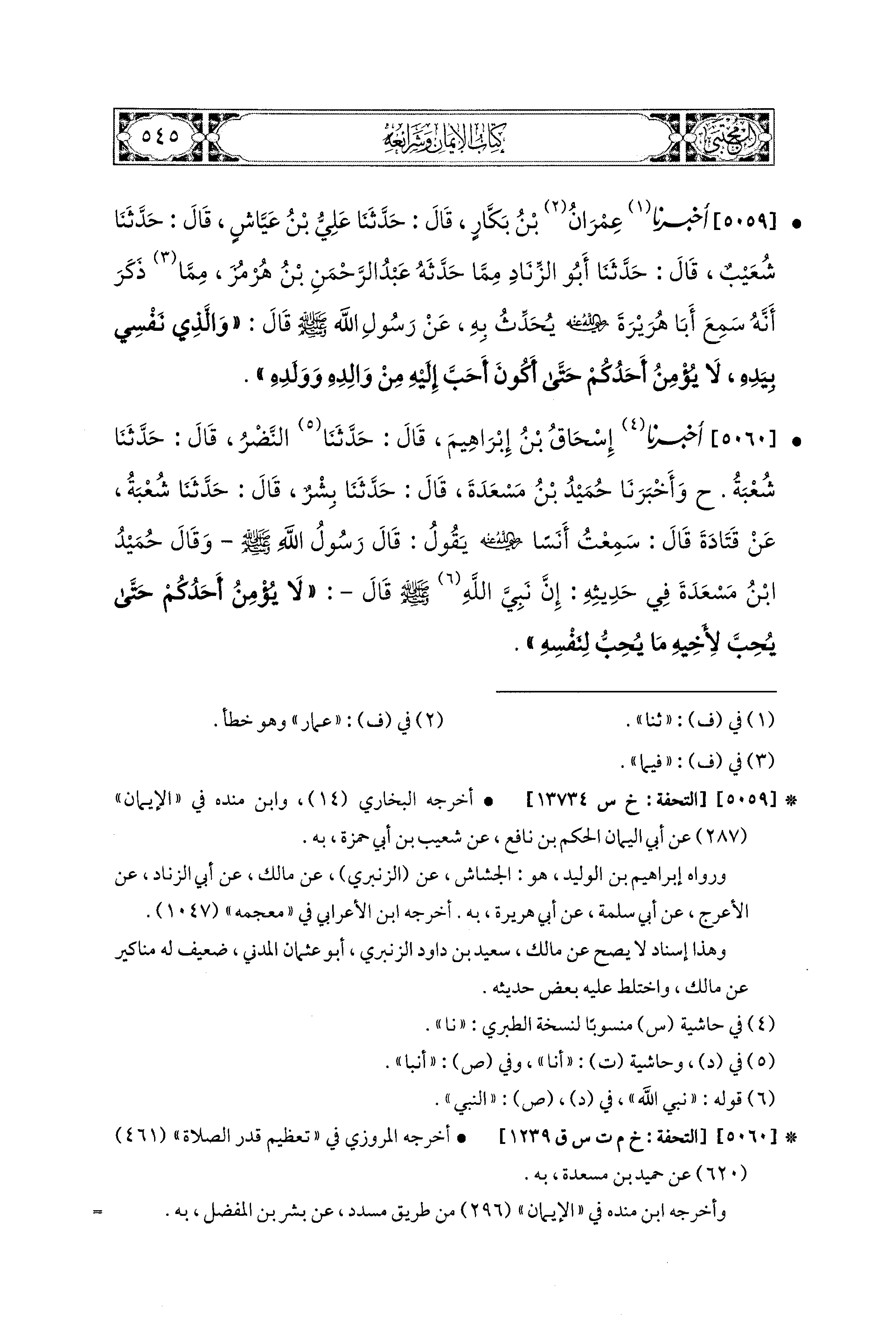 5060- أَخبَرَنا إِسحَاقُ بْنُ إِبراهِيمَ، قال: حَدثنا النَّضْرُ، قال: حَدثنا شُعْبَةُ (ح) وَأَخبَرنا حُمَيْدُ بْنُ مَسْعَدَةَ، قال: حَدثنا بِشْرٌ، قال: حَدثنا شُعْبَةُ، عَن قَتَادَةَ، قَالَ: سَمِعْتُ أَنَسًا رضي الله عنه, يَقُولُ: قَالَ رَسُولُ اللهِ صَلى الله عَليه وسَلم: وَقَالَ حُمَيْدُ بْنُ مَسْعَدَةَ فِي حَدِيثِهِ، إِنَّ نَبِيَّ اللهِ صَلى الله عَليه وسَلم قَالَ: لاَ يُؤْمِنُ أَحَدُكُمْ حَتَّى يُحِبَّ لأَخِيهِ مَا يُحِبُّ لِنَفْسِهِ.